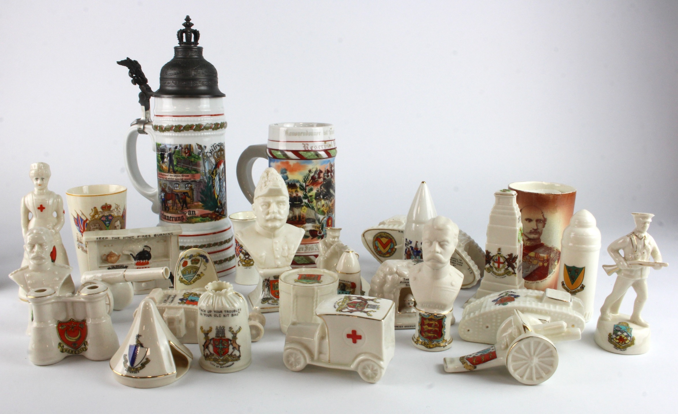 German Military stein (missing lid) decorated with a Military scene, circa early 20th Century, height 18cm approx., together with a later reproduction, plus a collection of Arcadian, Grafton souvenir china etc., including tanks, binoculars, etc.