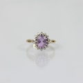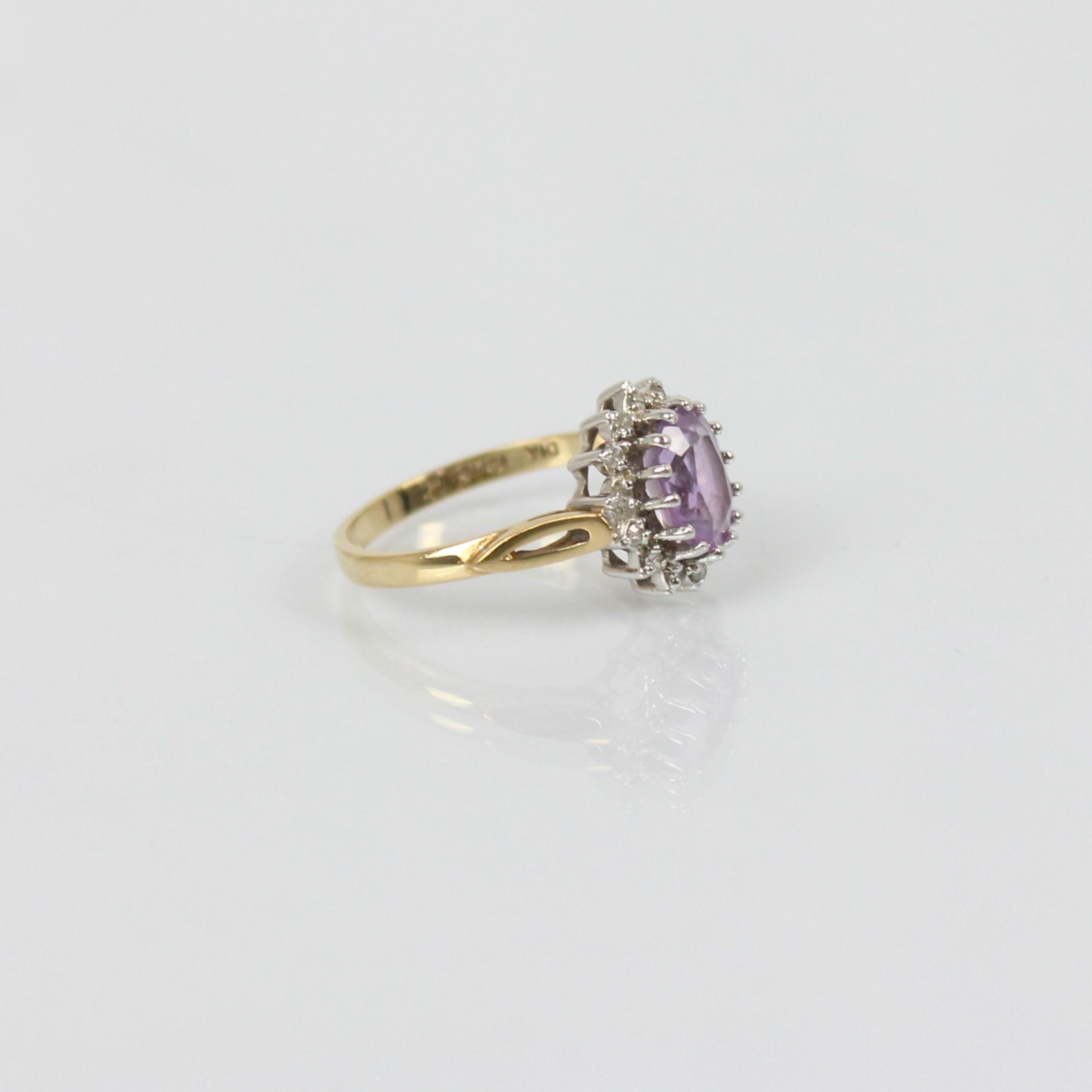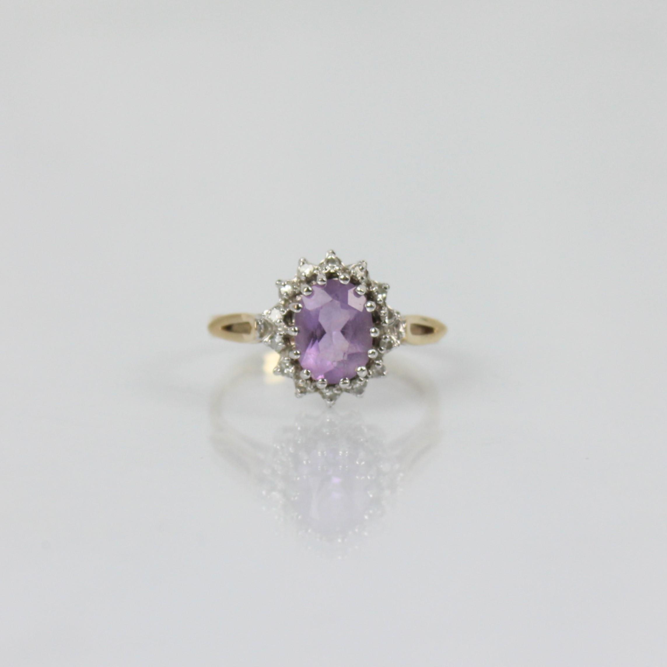 An amethyst and diamond dress ring, the central oval amethyst within surround of diamonds in cluster design, set with openwork shoulders leading to plain polished 9ct shank, ring size N, 2.4gms