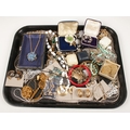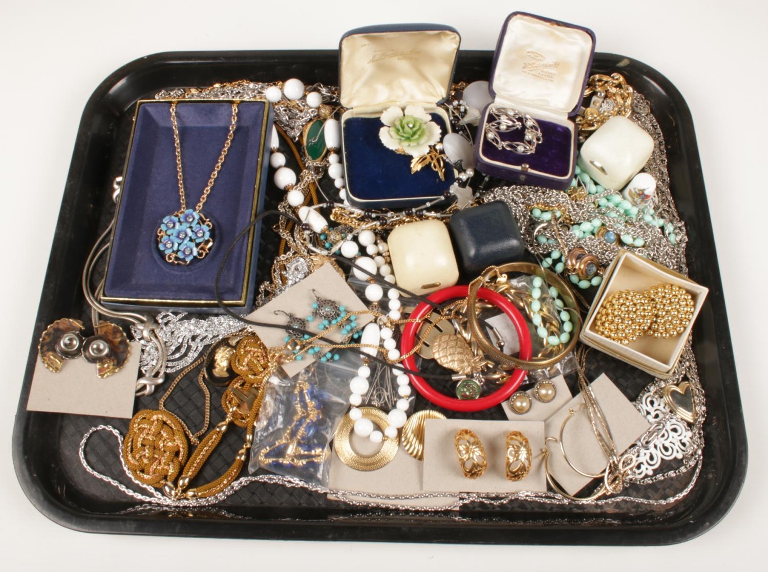 A collection of costume jewellery. Includes gilt metal necklaces, clip on earrings, brooches etc.