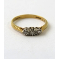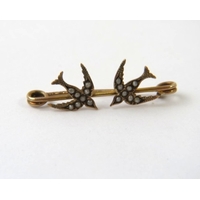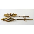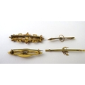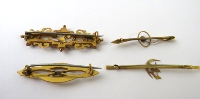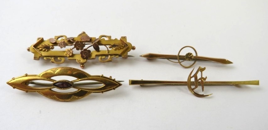 Three yellow metal bar brooches all stamped ‘9ct’ and another plated bar brooch, 7.1g (gross) approx. (4)