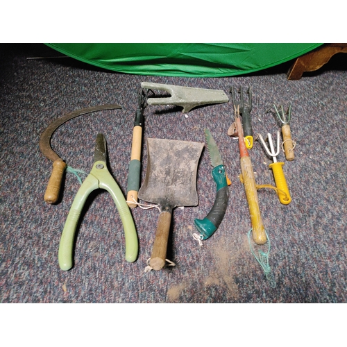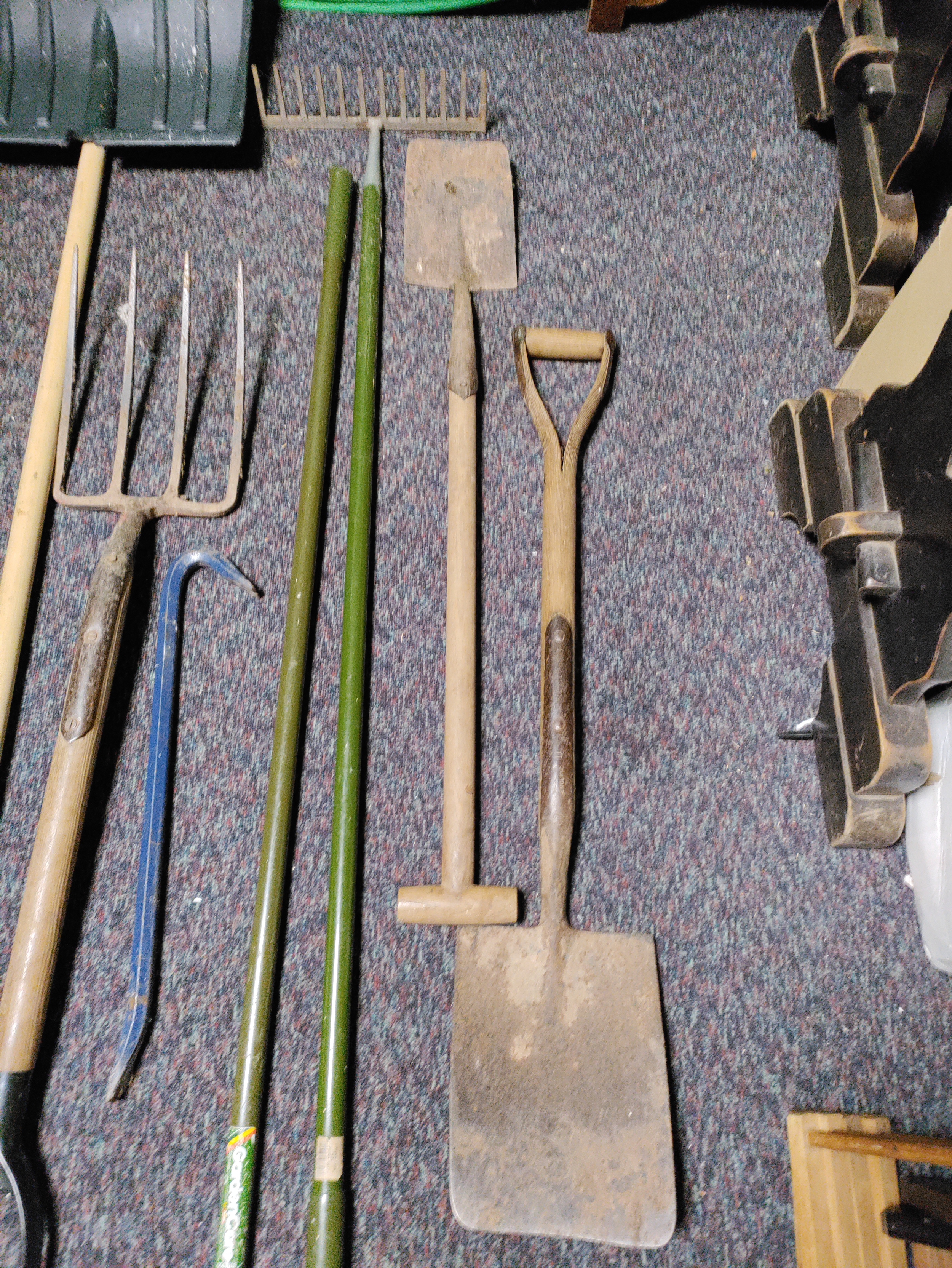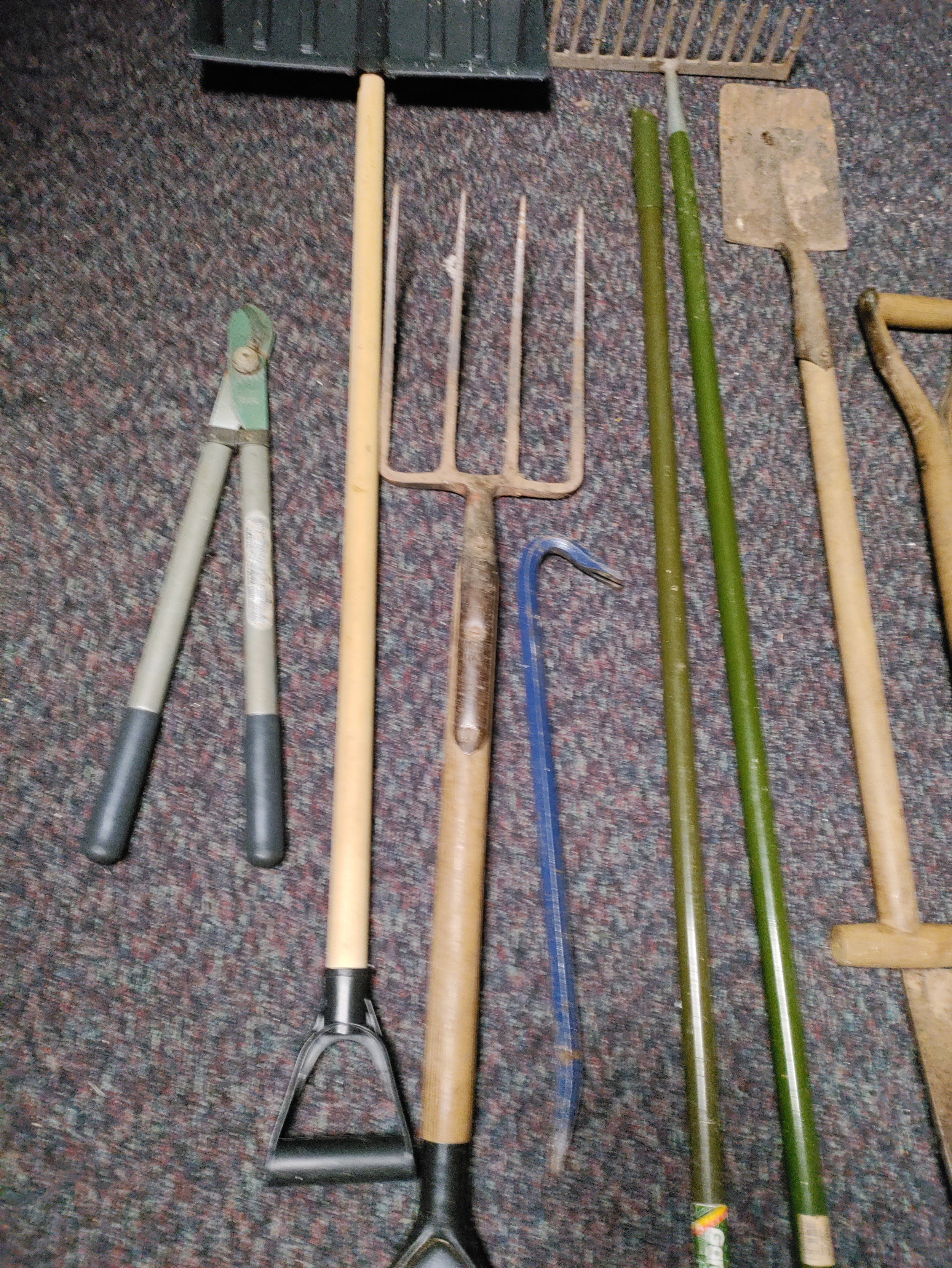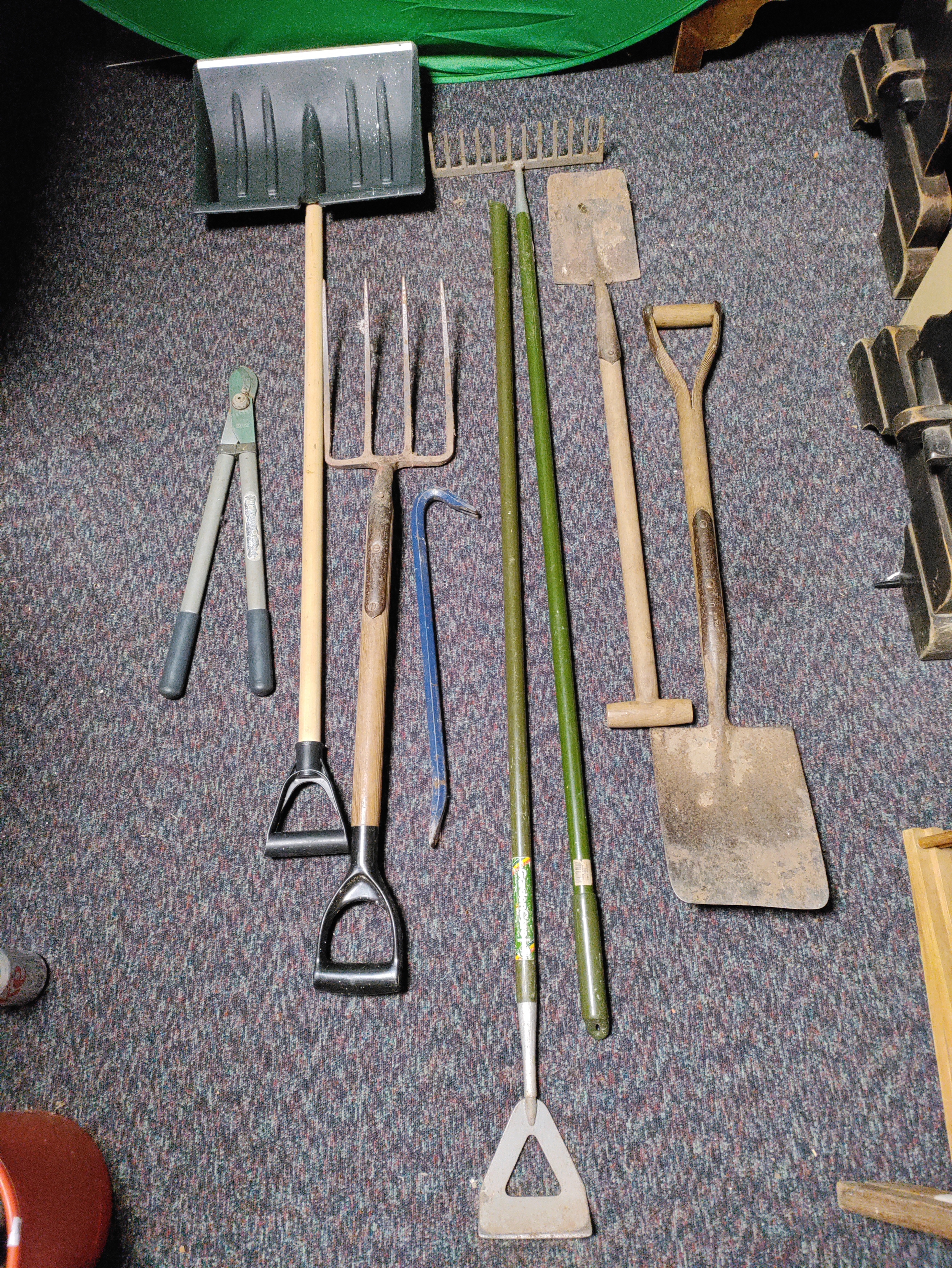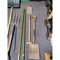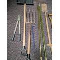 A collection of 8 garden tools. To include snow shovel, 2 shovels, pitchfork, crow bar, Dutch hoe, rake & loppers.