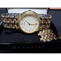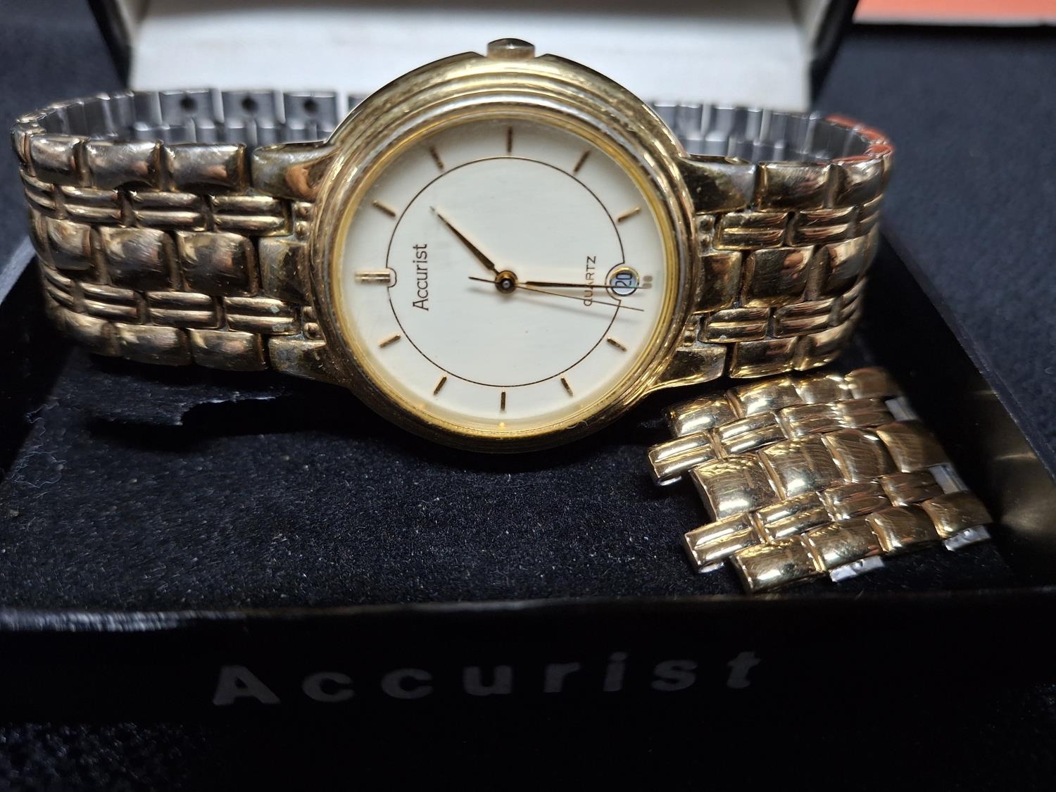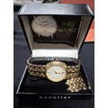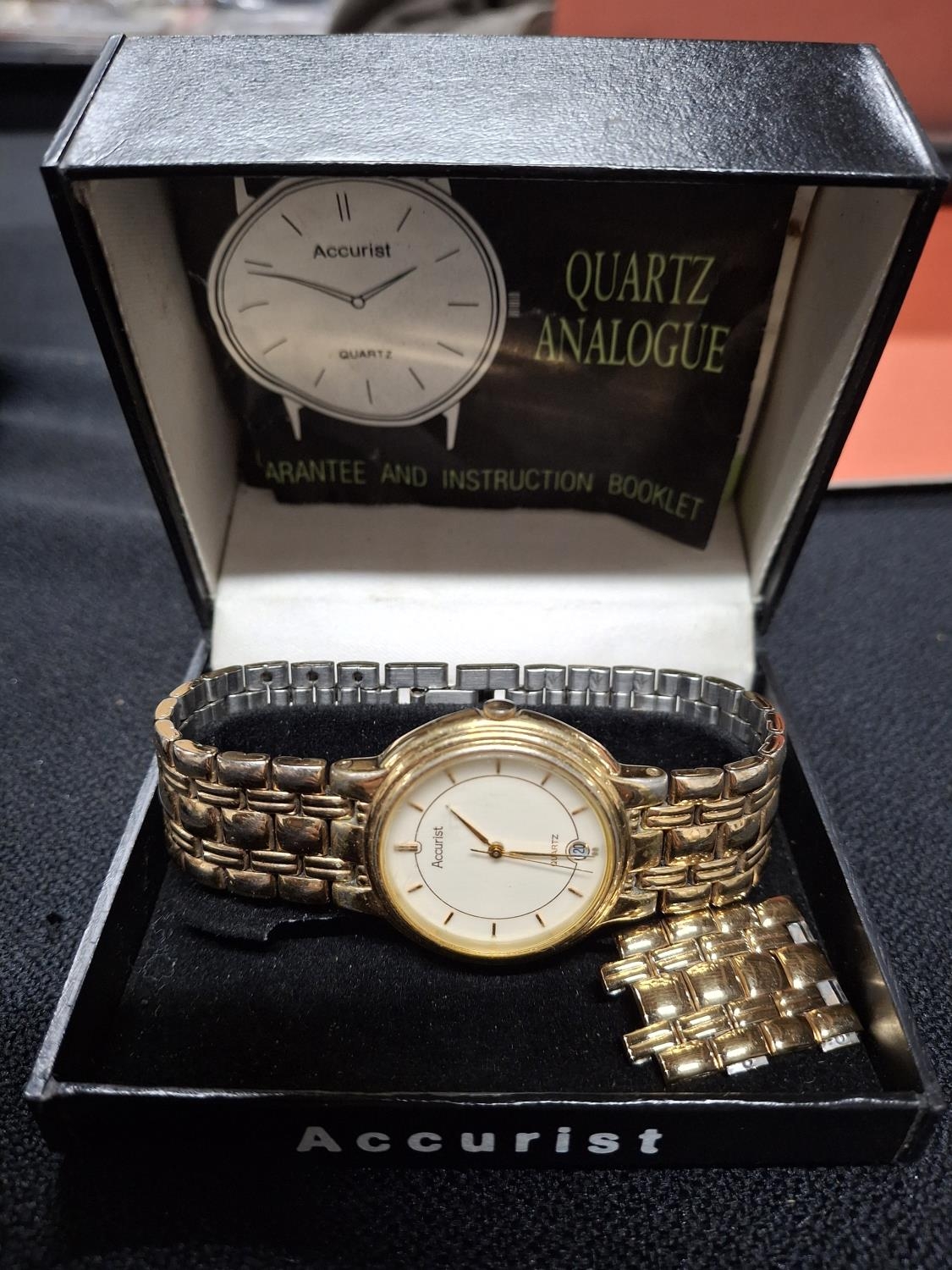 Gents quartz analogue wrist watch with gilt metal strap, boxed with original booklet