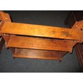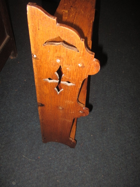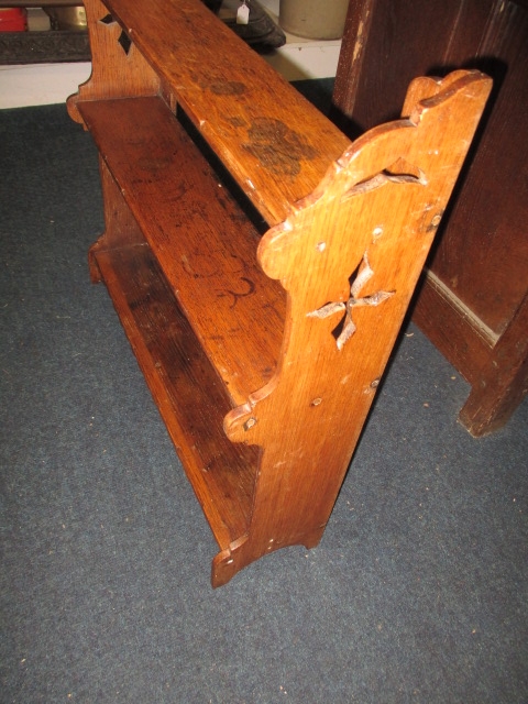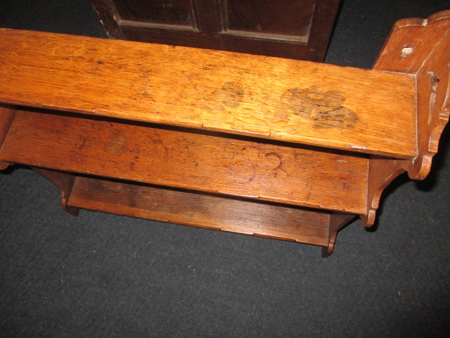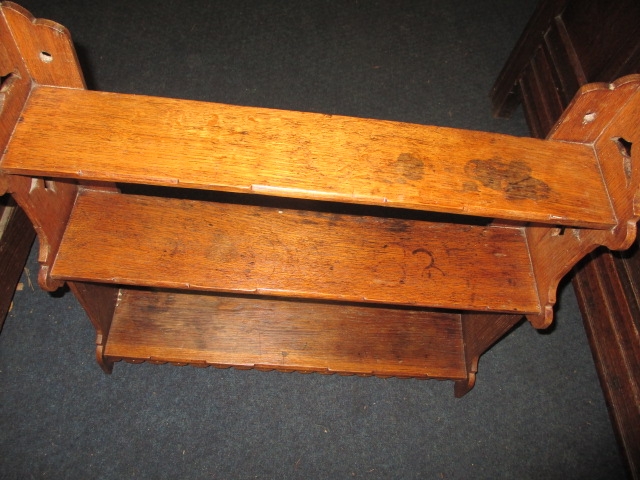An antique oak 3 tier shelf, either wall mounted or free standing, approx size H: 59cm W: 60cm D: 14cm, probably from a church, in useable pre-owned condition