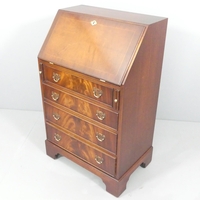 In need of some attention. Damage to top left corner. Appears to have had a gallery (now absent), two missing handles to drawers. key in top lock is stuck and the lock non-functional. No additional keys present to test other locks.