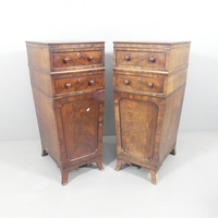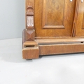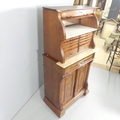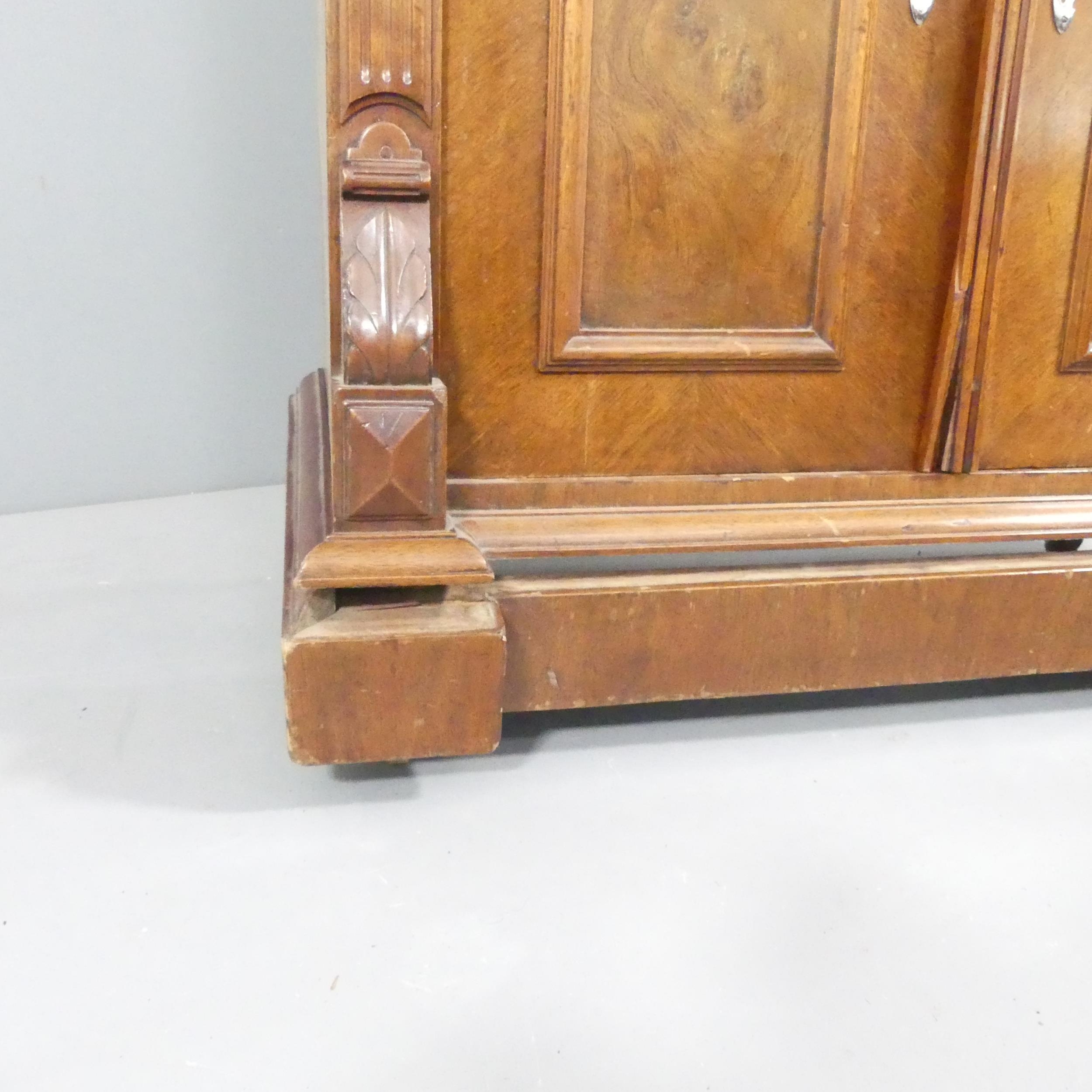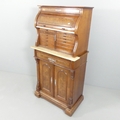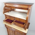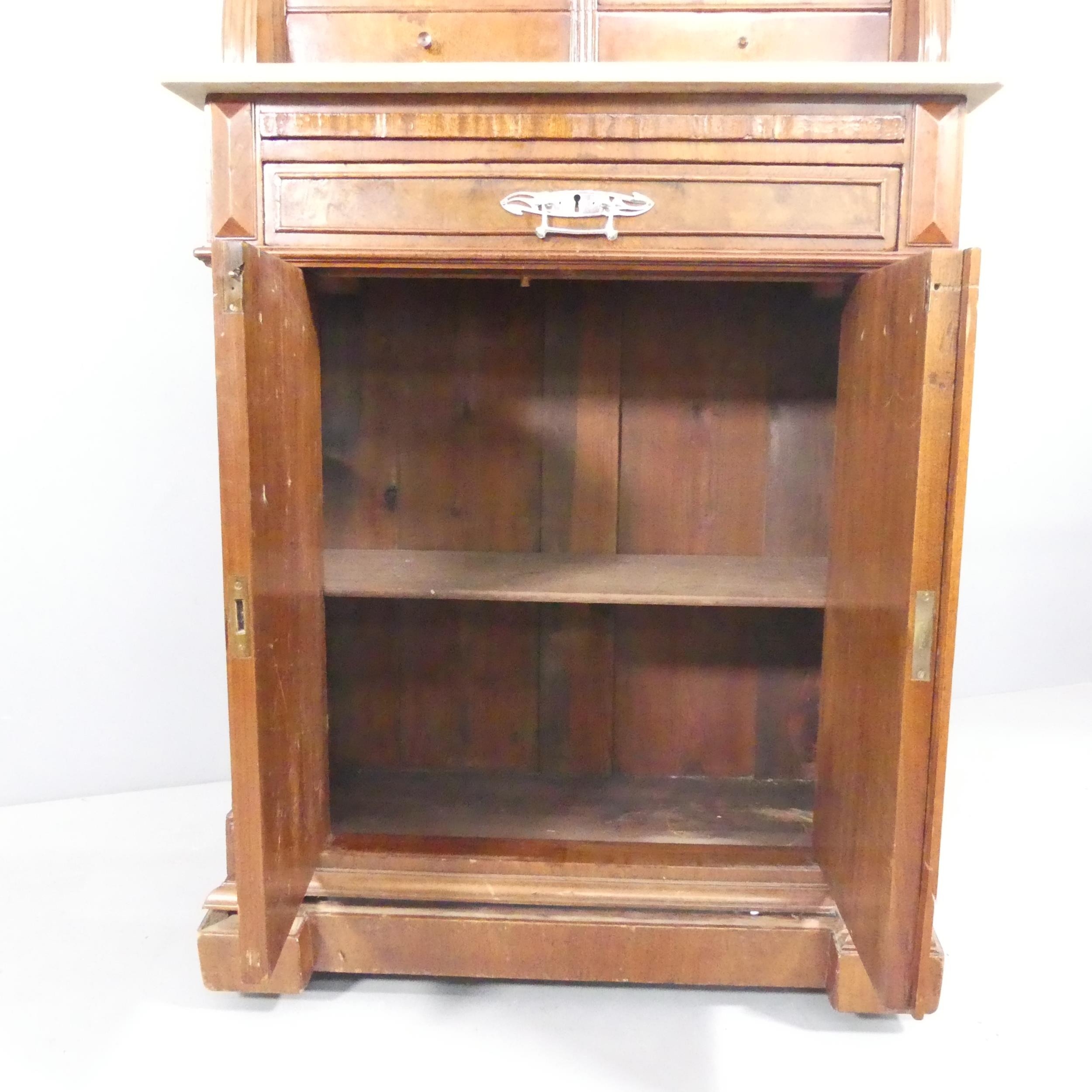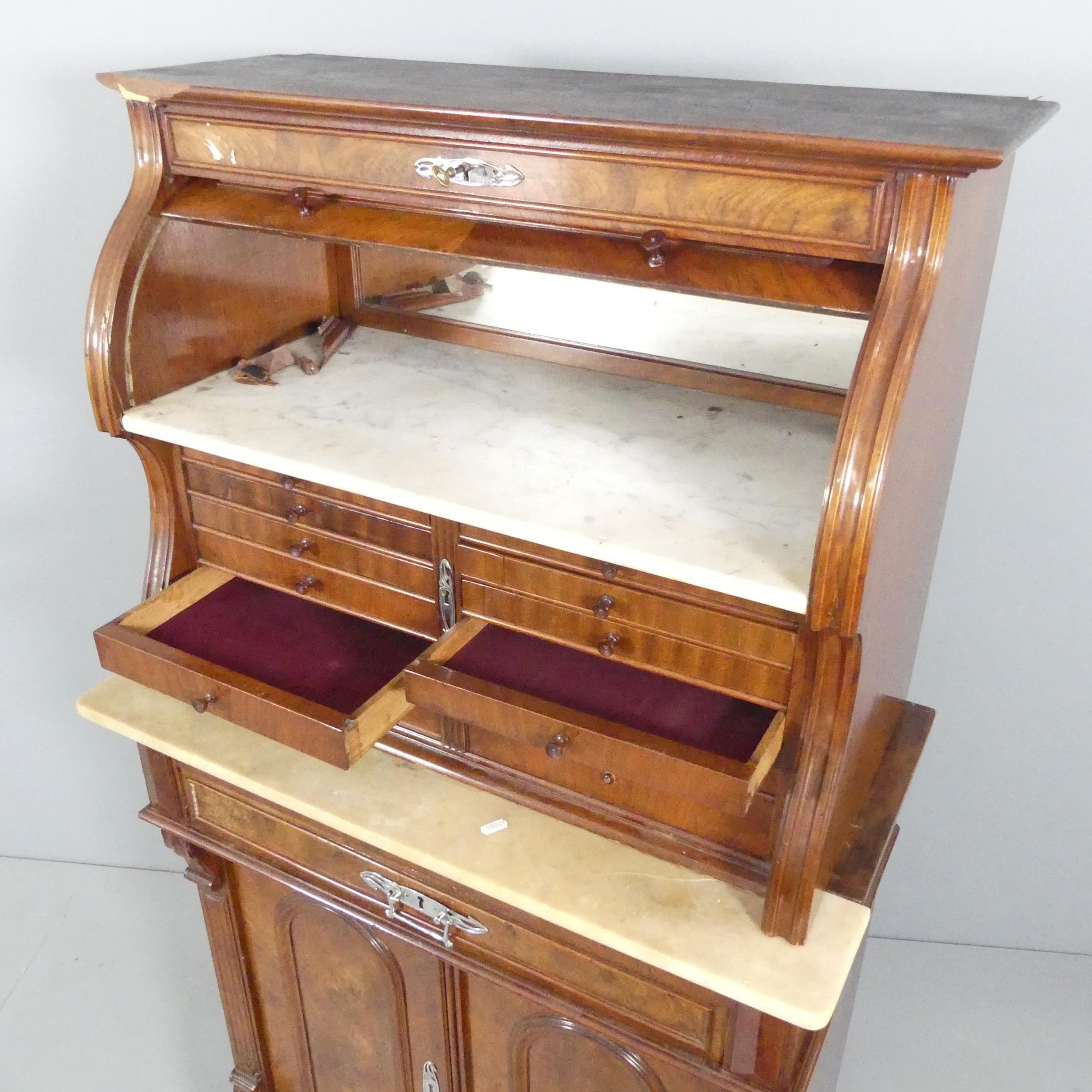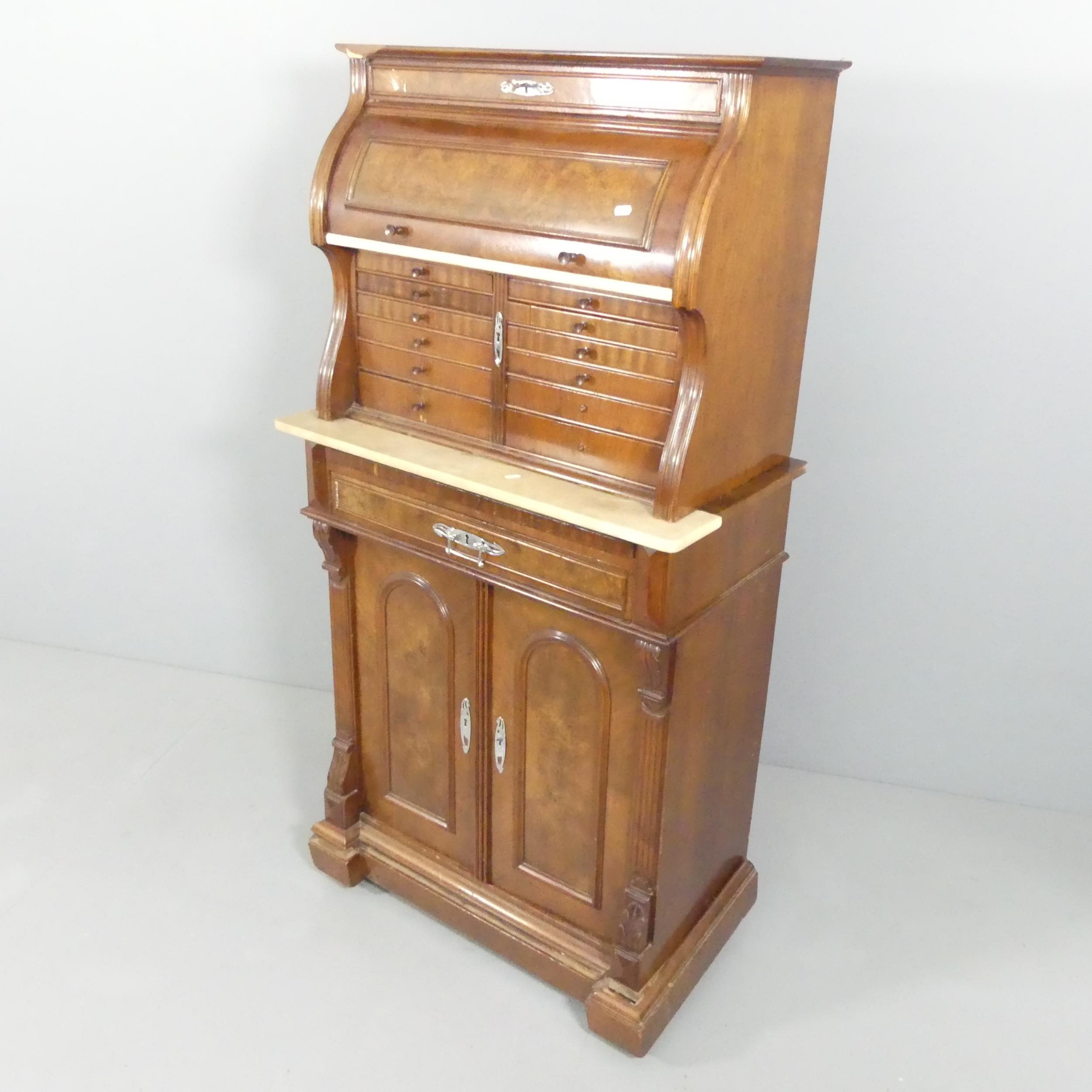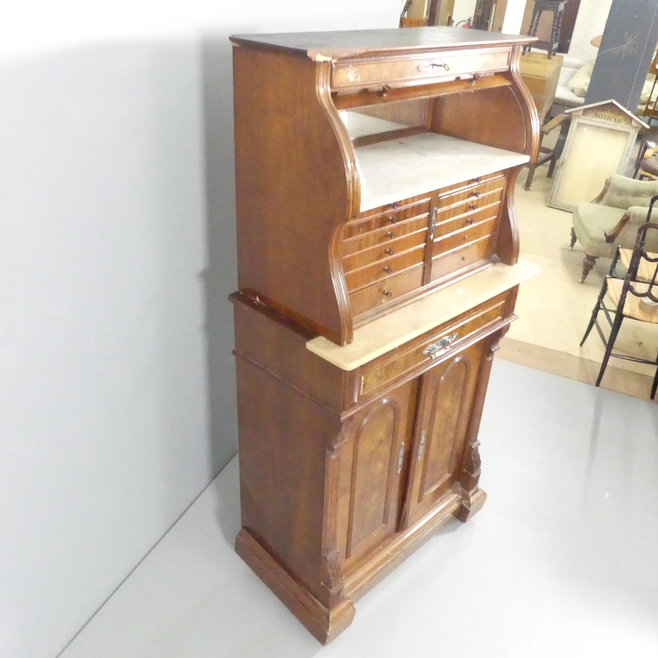 A Victorian burr walnut two-section dentist's cabinet, the top section having a cylinder top revealing a mirror above a marble shelf with twelve shelves below, the lower having a pull-out slide, single drawer and cupboards under. 82x161x44cm A/F.