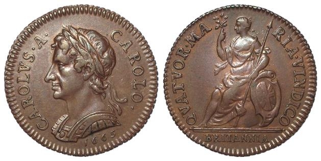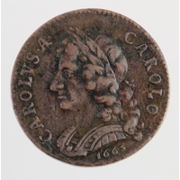Pattern Farthing 1665 in copper, straight grained edge, BMC 413, GVF. Ex Lockdales A81, L381.