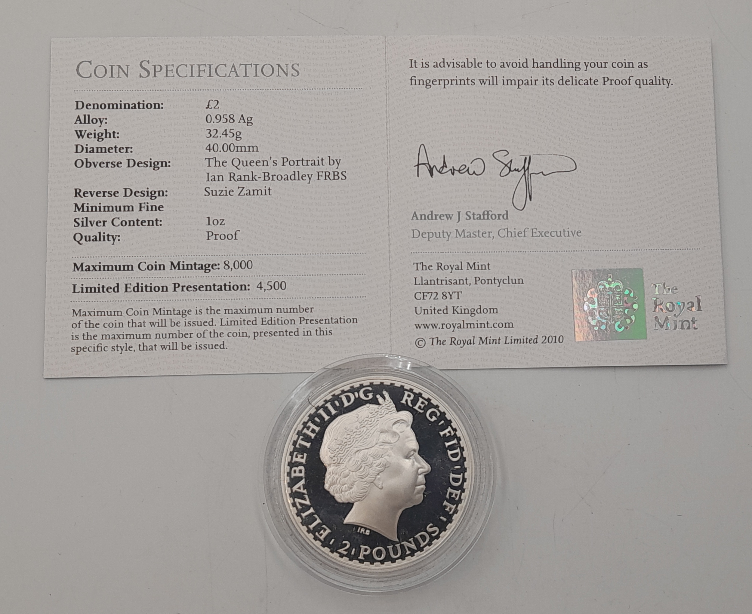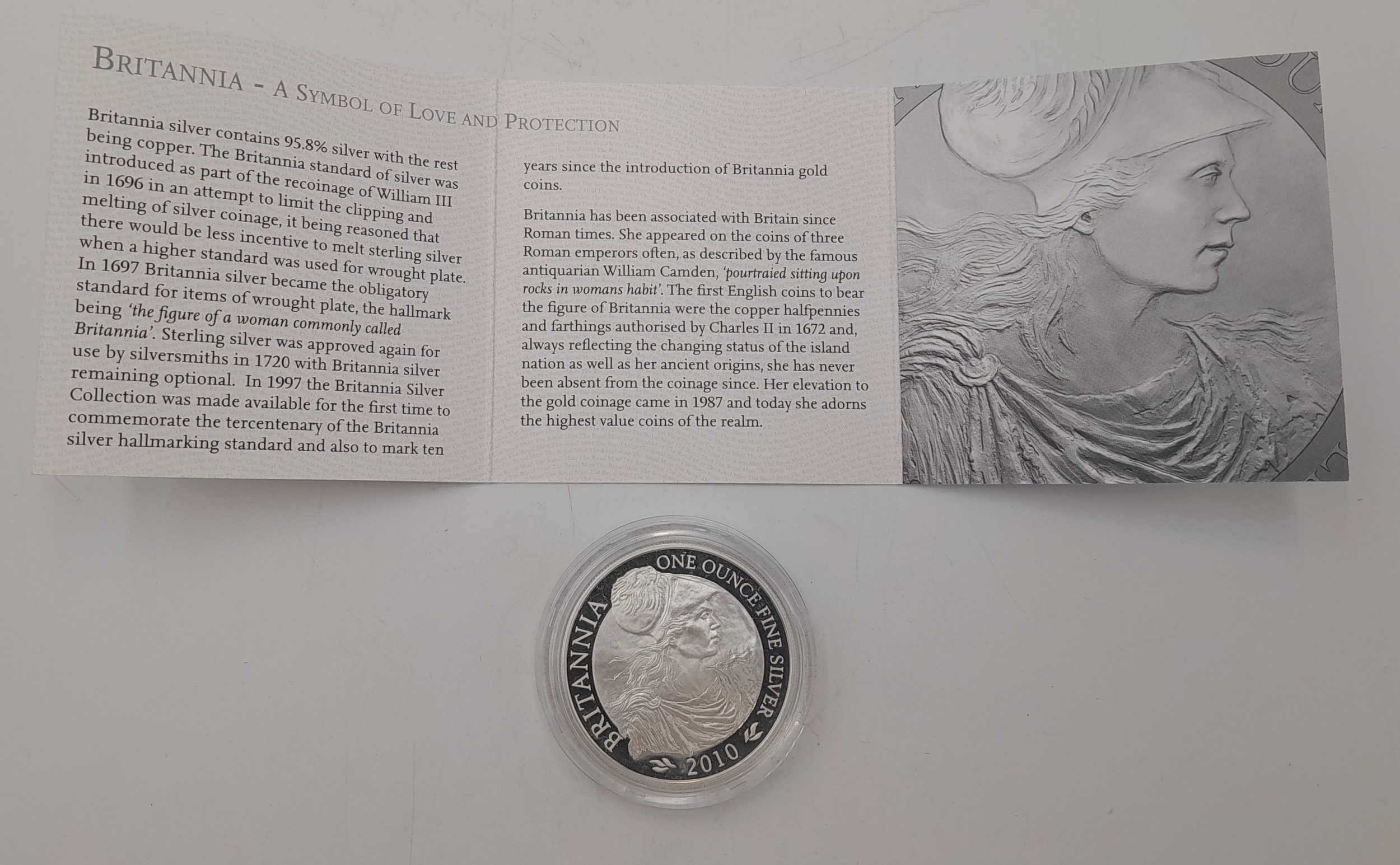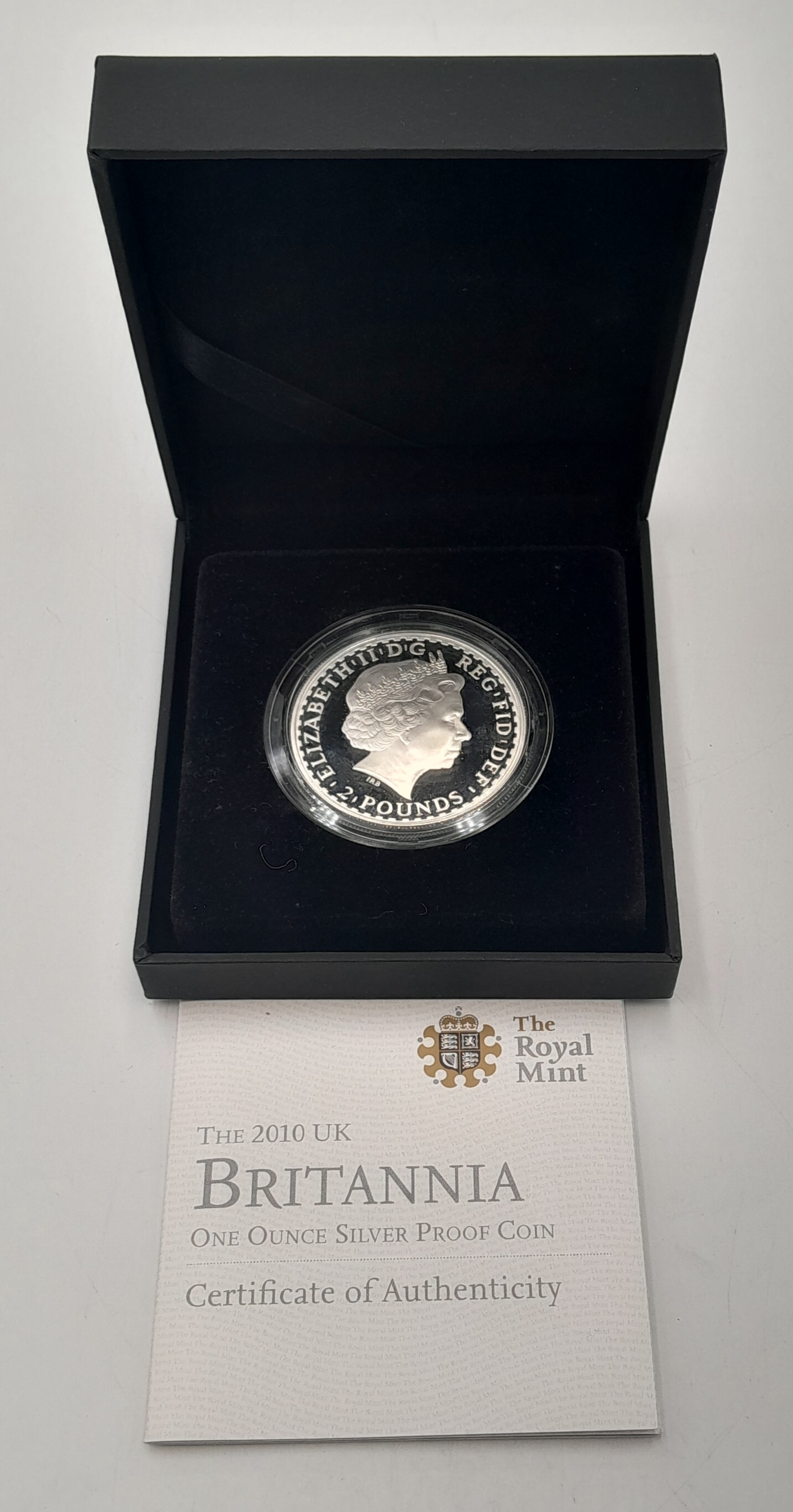 A Mint Condition (Limited Edition) 2010 Fine Silver Proof One Ounce Britannia as issued by The Royal Mint. Comes Cased in Capsule with Certificate of Authenticity. 32.45 Grams of 958/1000 Silver.