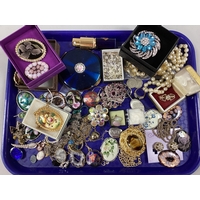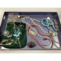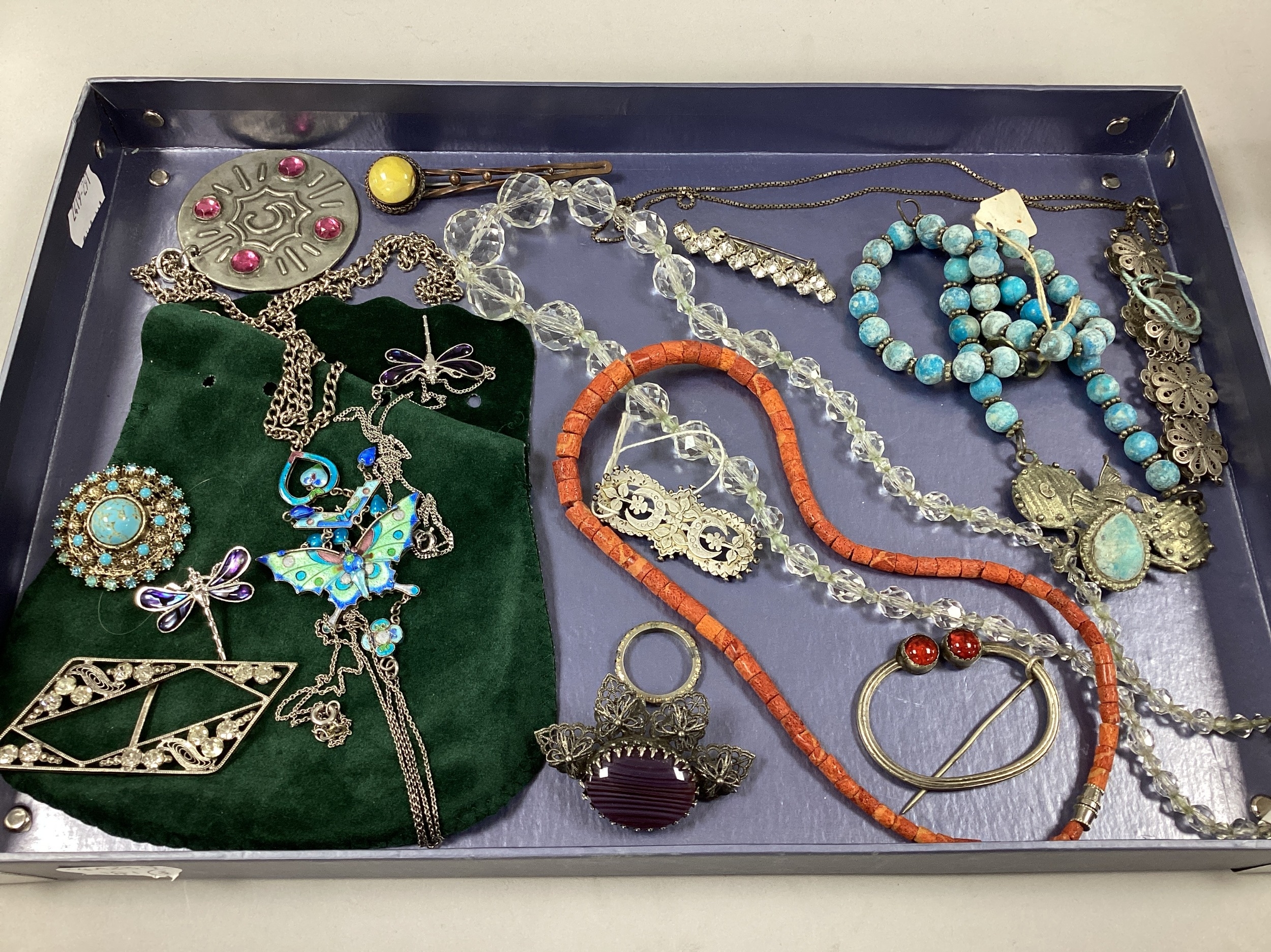A Hallmarked Silver Victorian Brooch, of Aesthetic Crescent Moon Design, together with a beaded hardstone necklace, with nature inspired decoration, stamped "900", enamel inlaid butterfly necklace, of Art Nouveau style, kilt pin of Arts & Crafts style, graduated faceted bead necklace, to barrel clasp etc :- One Tray
