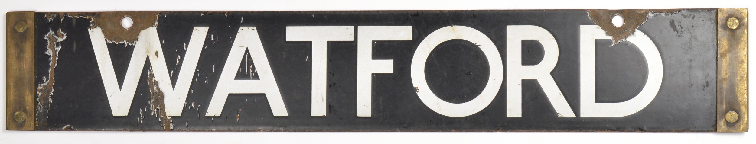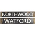 London Underground enamel double sided cab destination plate from NORTHWOOD - WATFORD. Brass ends. Good typical used condition, 24 1/4 x 4 inches. Please note, photo shows both sides of the same plate in this lot. Shipping band - C.