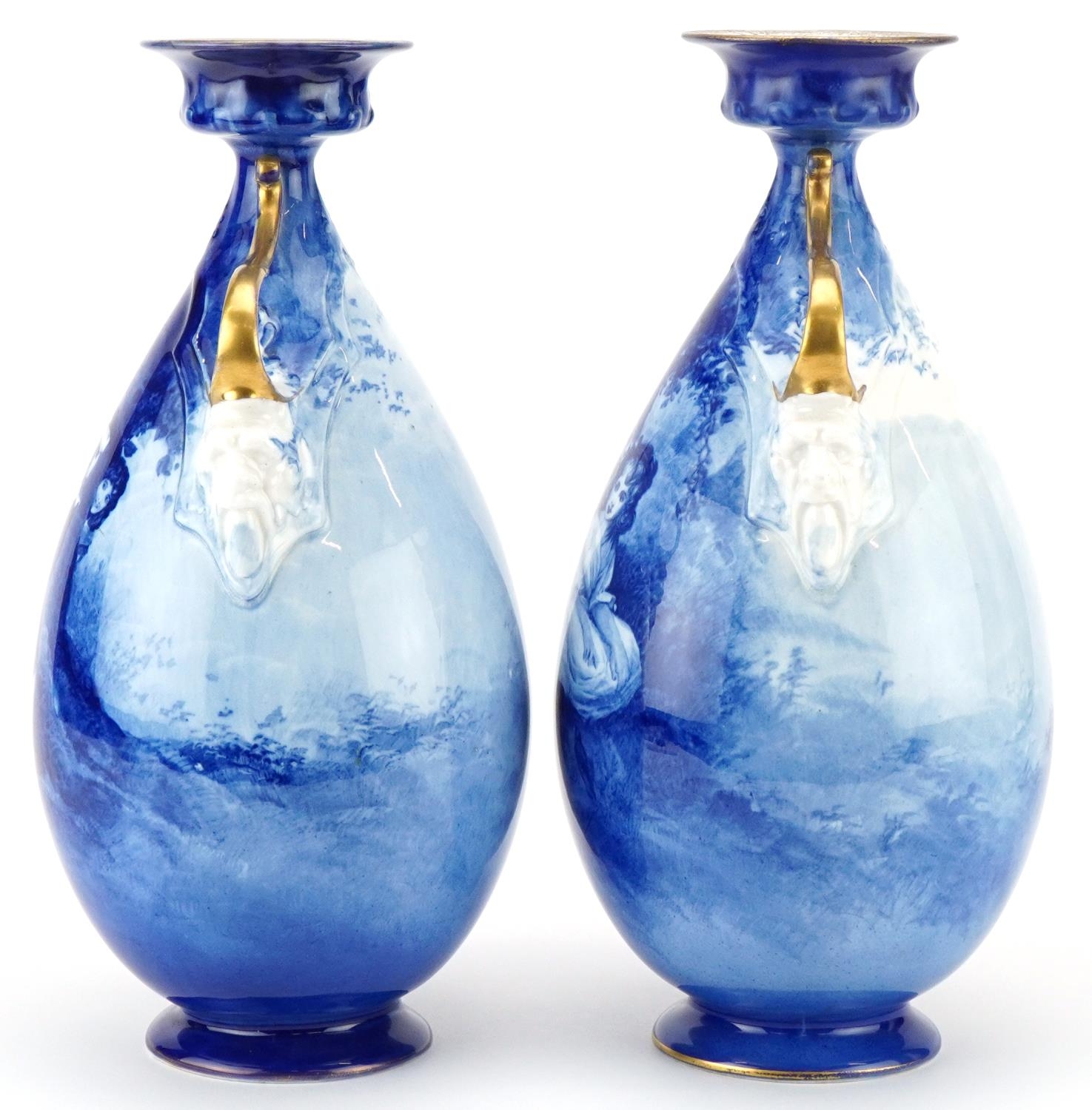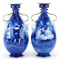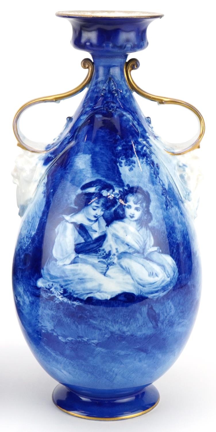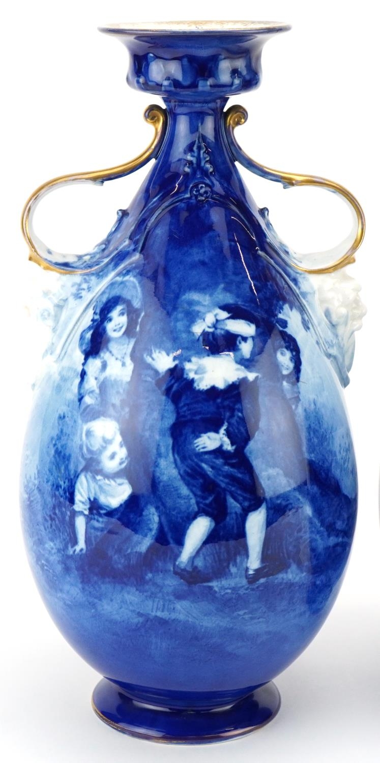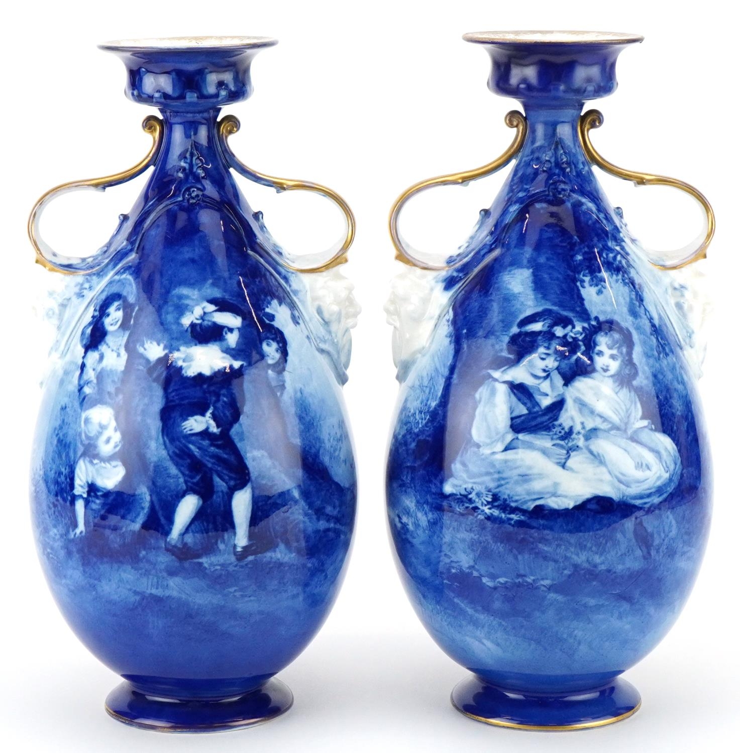 A pair of Royal Doulton Blue Children series ware vases with twin grotesque mask handles, 29.5cm high.