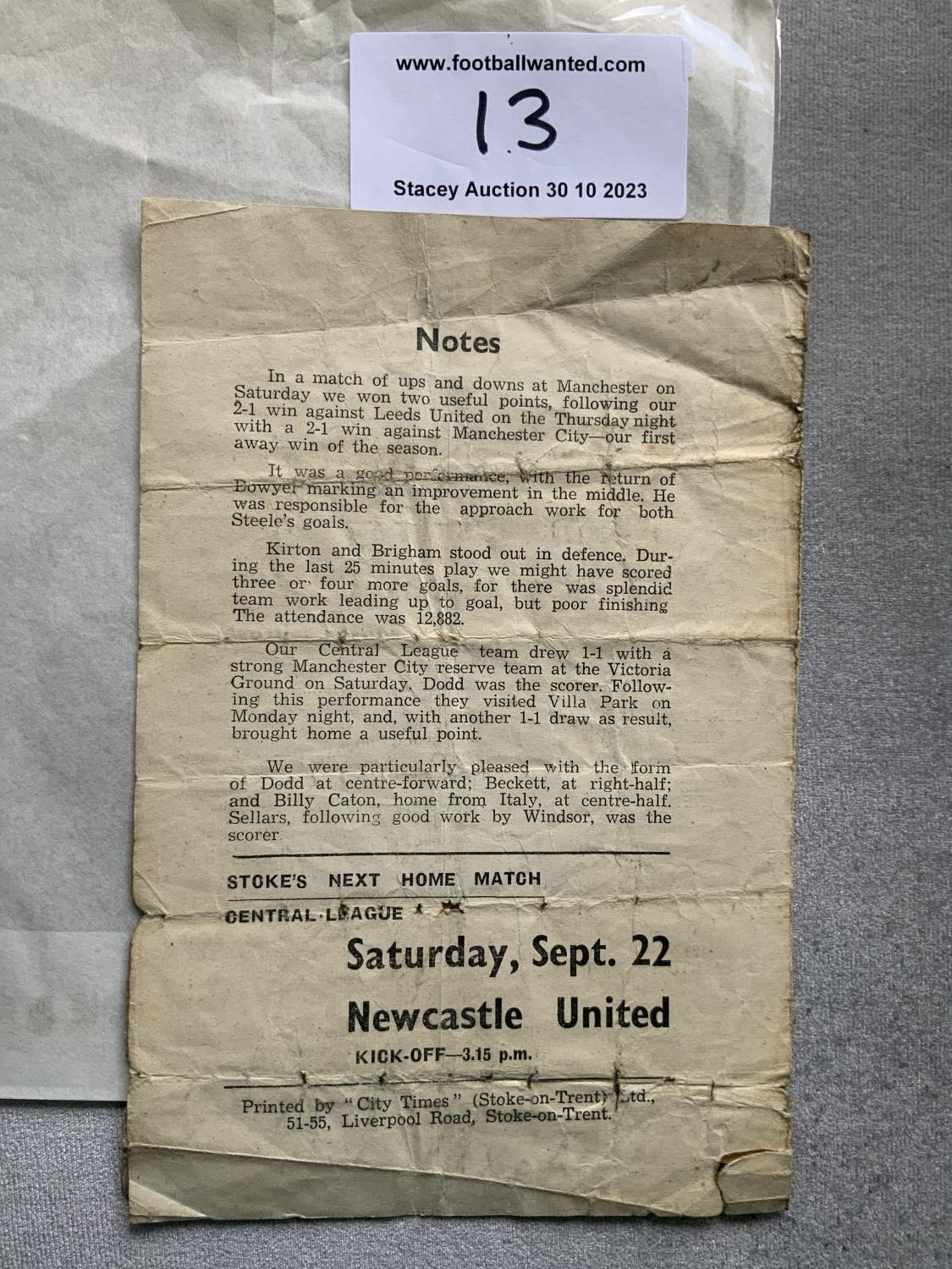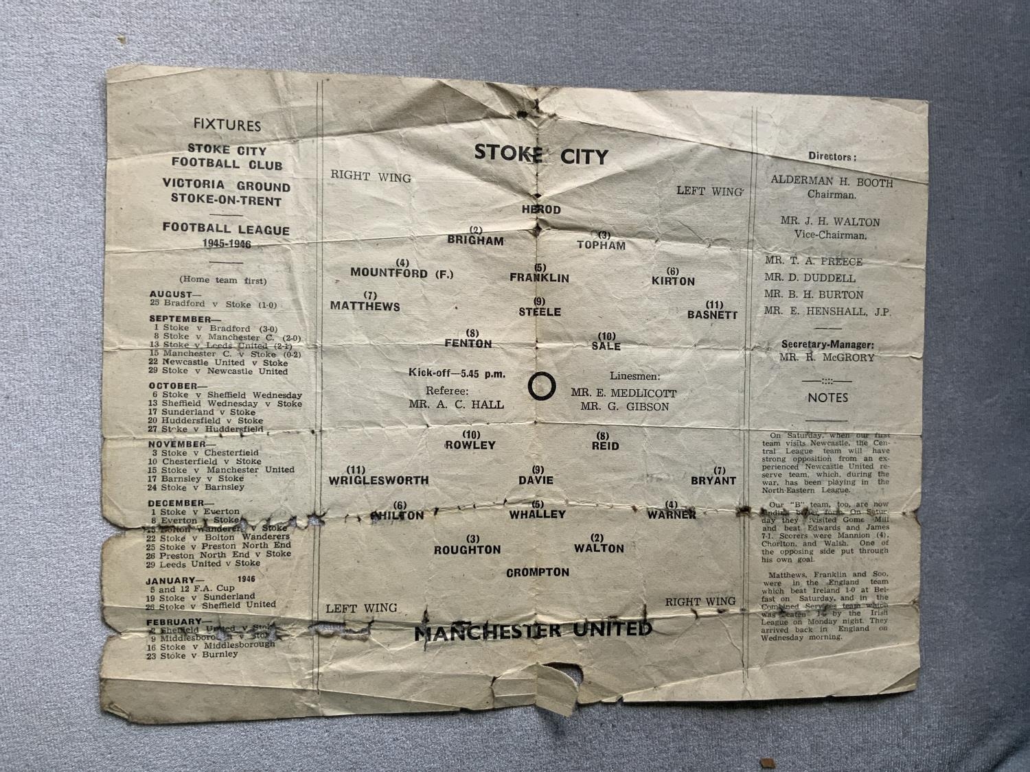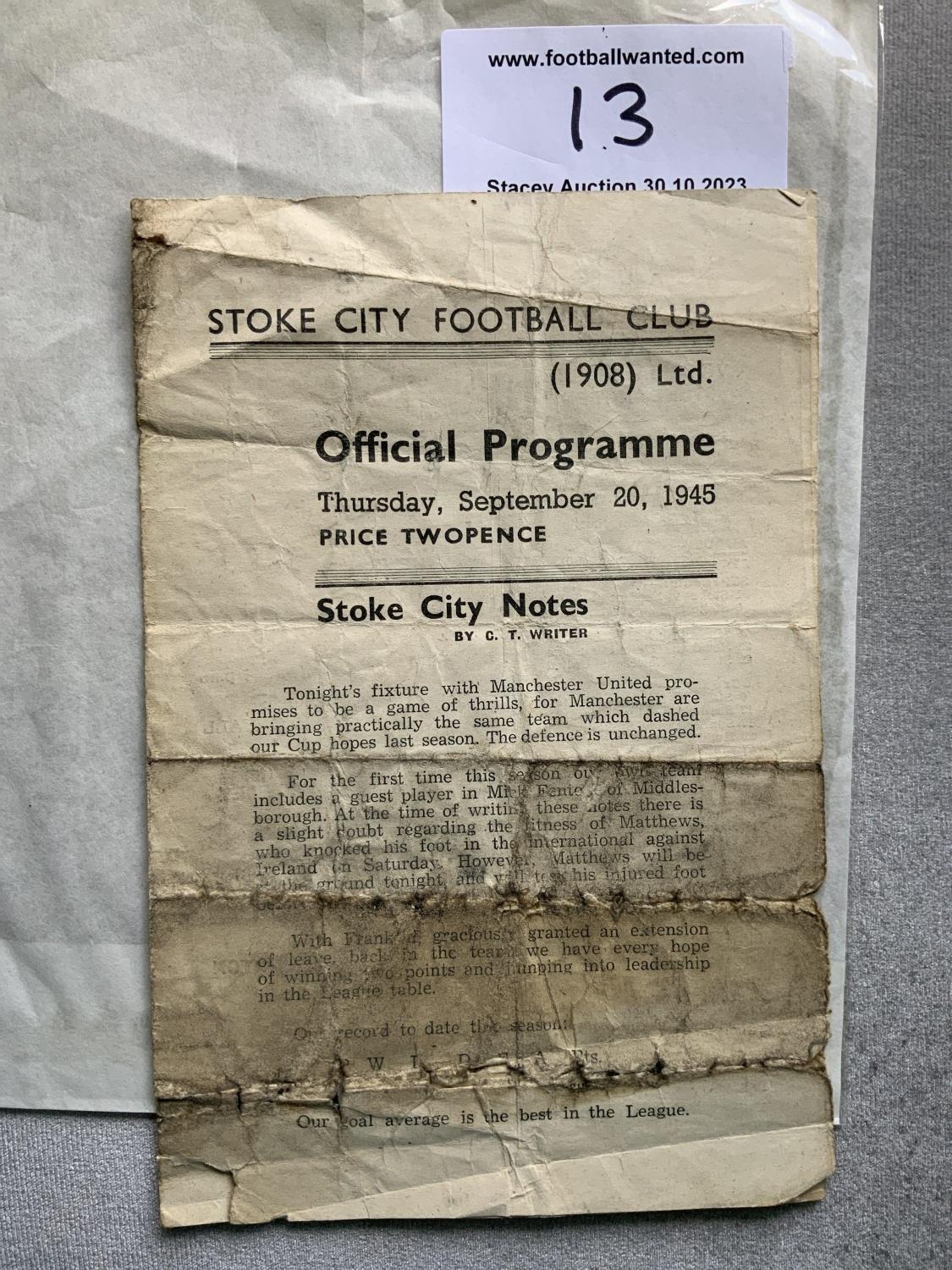45/46 Stoke City v Manchester United Football Programme: One of the most difficult to obtain but sadly in poor condition. Collector spent 4 figures to improve on condition and replace this one. This 4 pager is complete but is very worn on folds and has numerous tears. No team changes but in need of restoration.