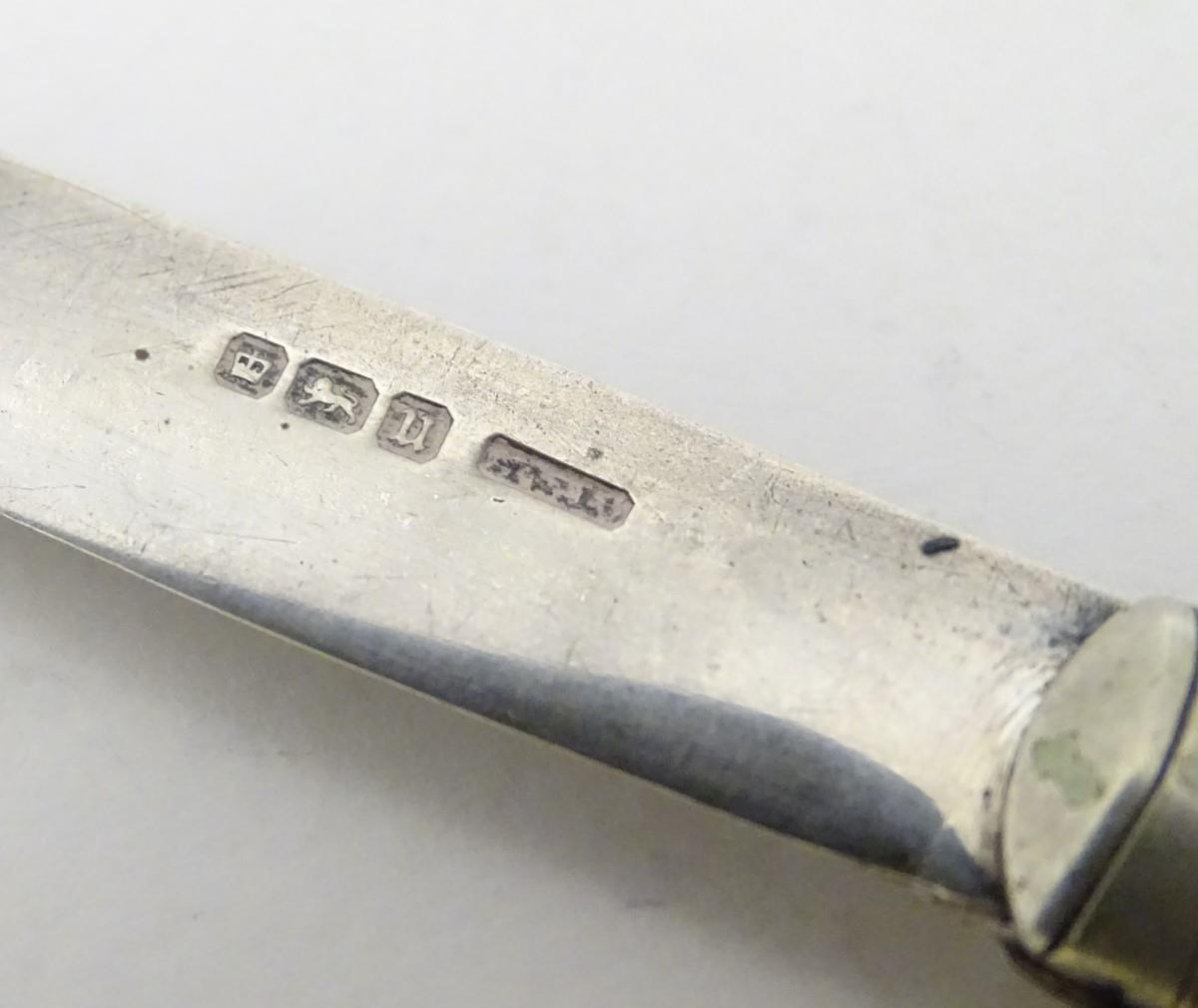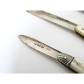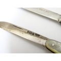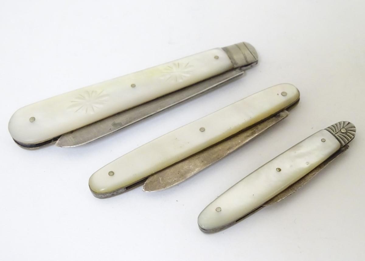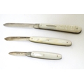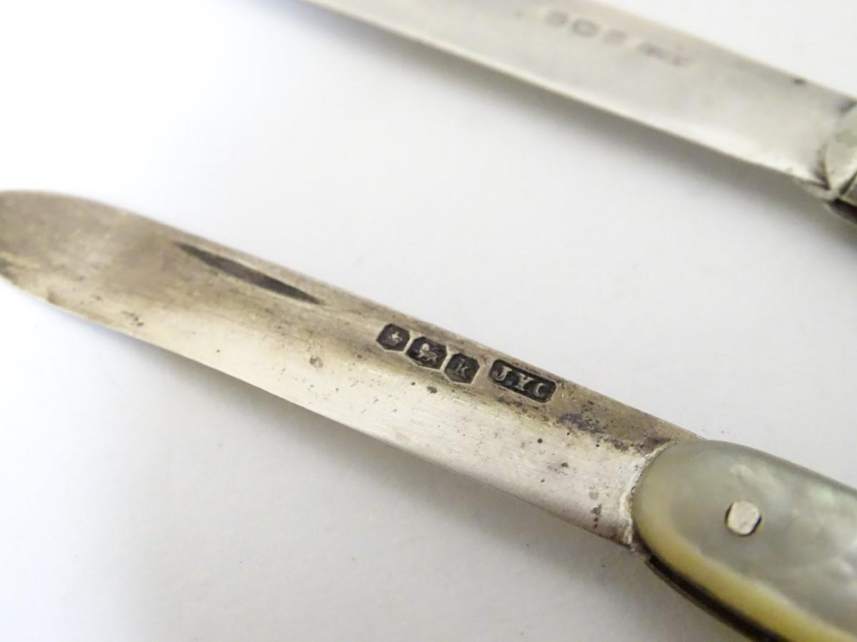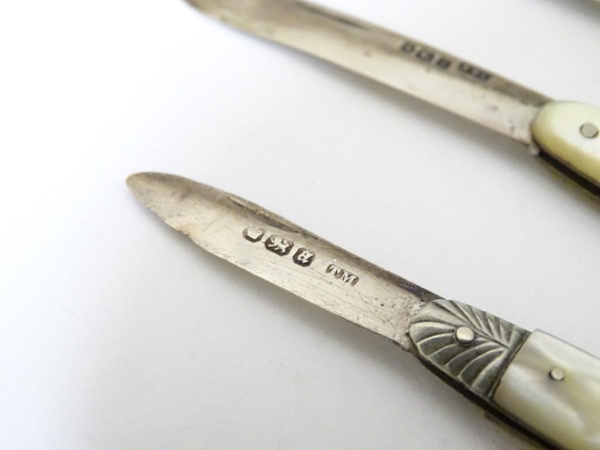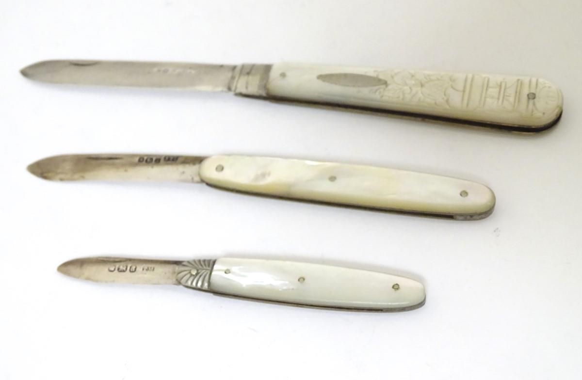 3 various silver folding fruit knives with mother of pearl handles. Hallmarked Sheffield 1893 maker Thomas Marples, Sheffield 1927 maker John Yeomans Cowlishaw and Sheffield 1912 Maker Henry Williamson Ltd. The largest 5 3/4'' long (open)