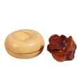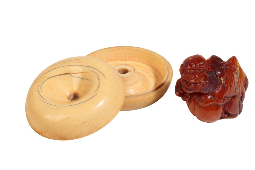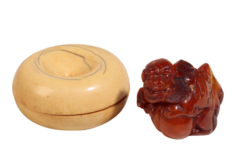 A CHINESE AMBER BUDDHISTIC LION, QING, together with a small ivory box in the form of a fruit, early Qing. Amber 5cm high, Box 7.5cm diameter (2)
