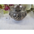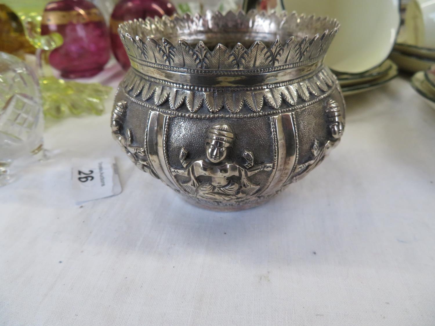 An Indian silver bowl with chased decorations of imortals, ht. 2.5 ins