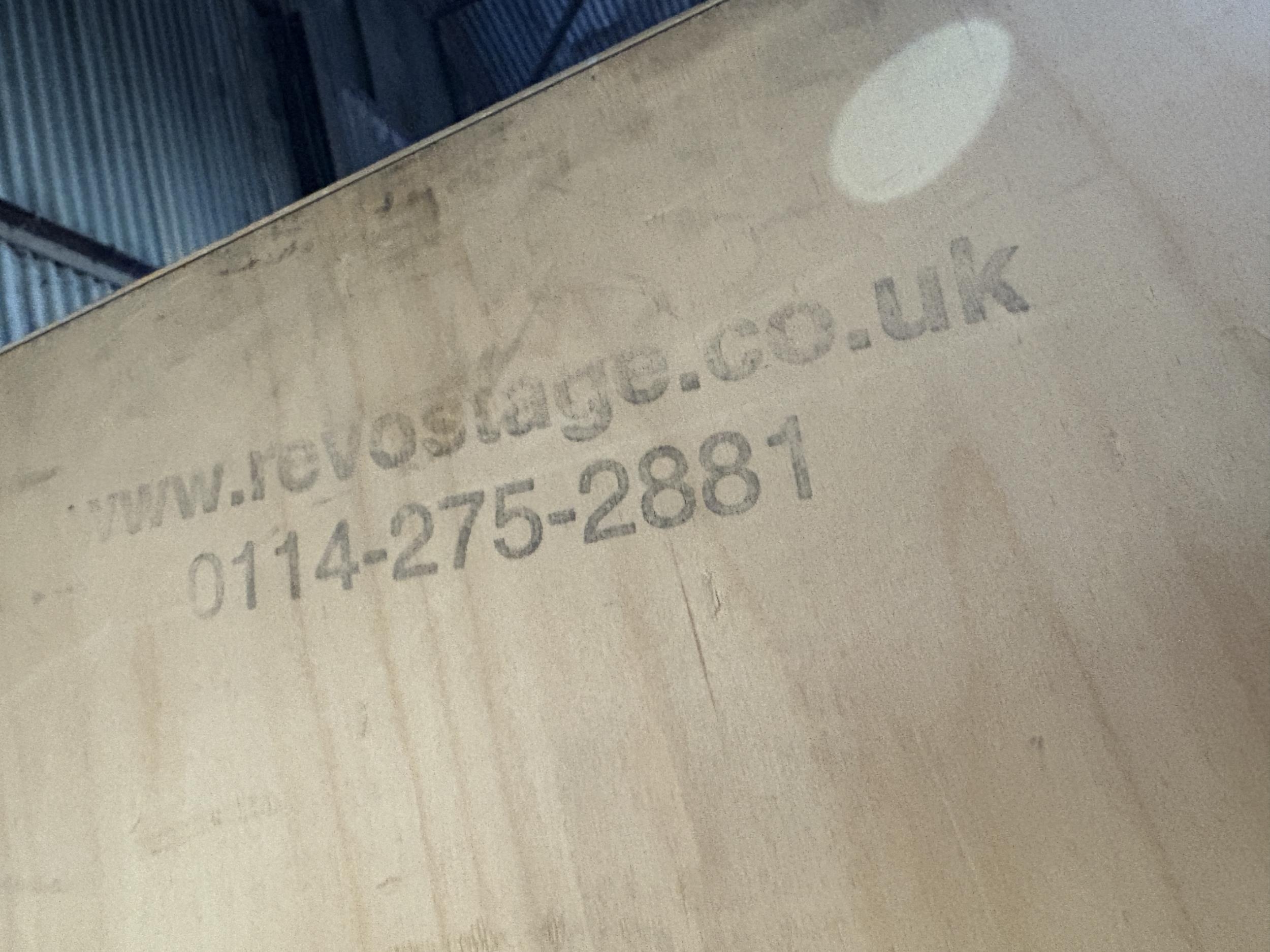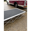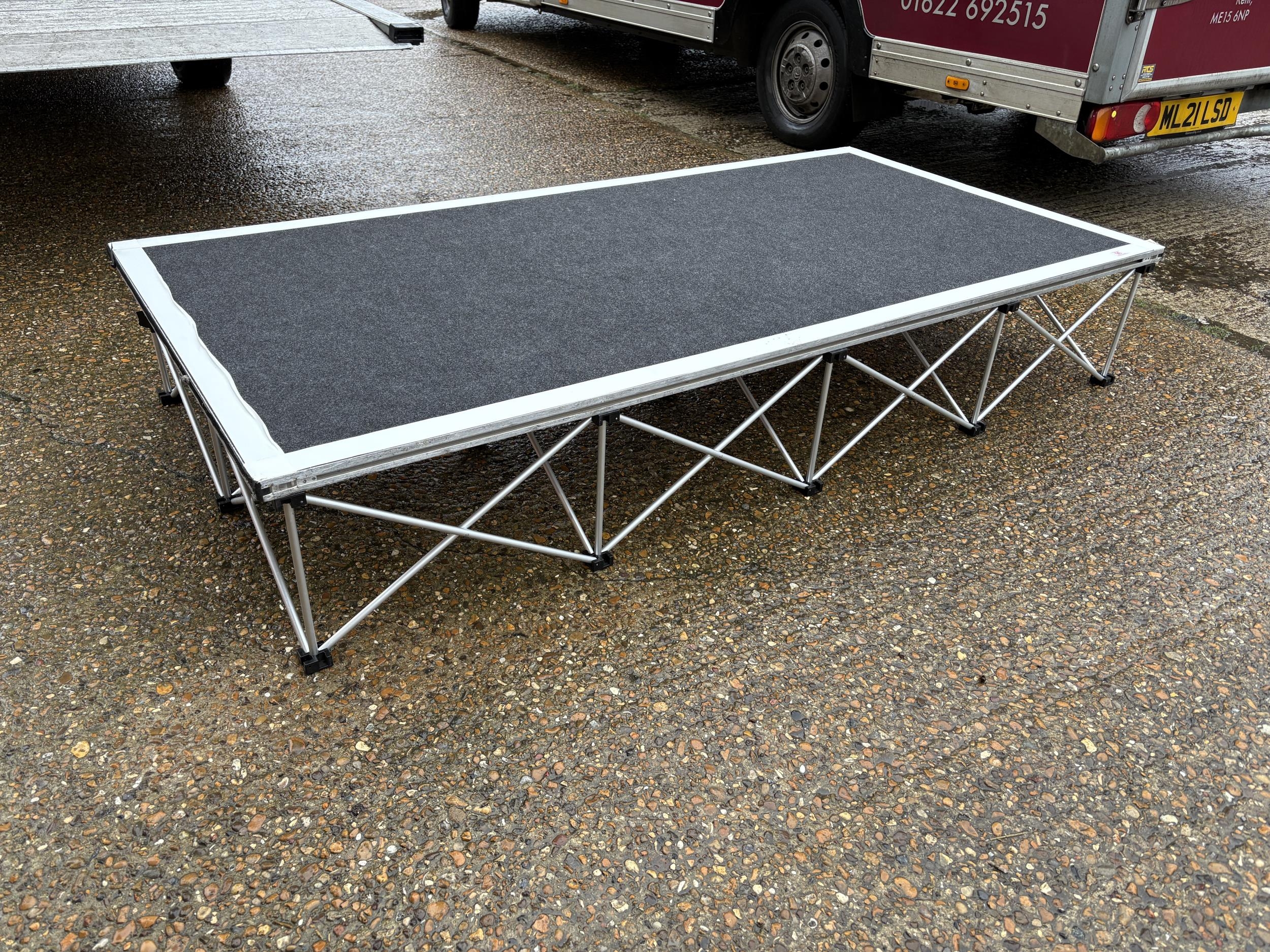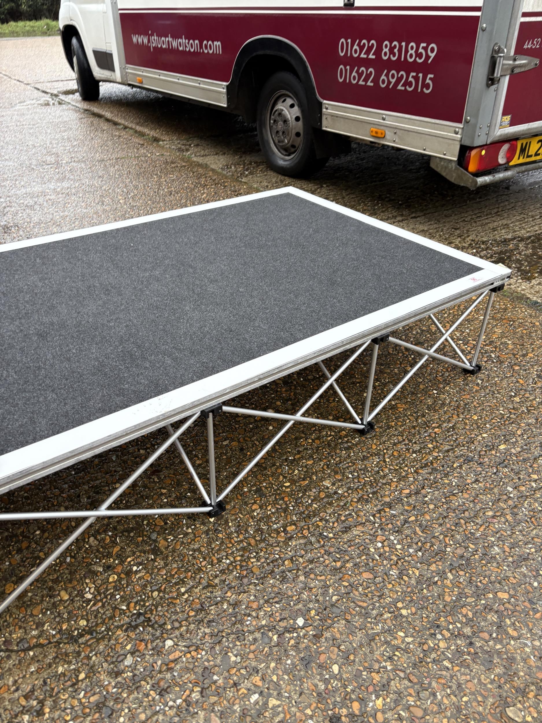 A large collection of fold down event staging, consisting of 12 boards of size 7ft x 3ft each with expanding aluminium base section, interlocking to create stage areas of various sizes. Originally supplied by REVO STAGE