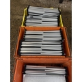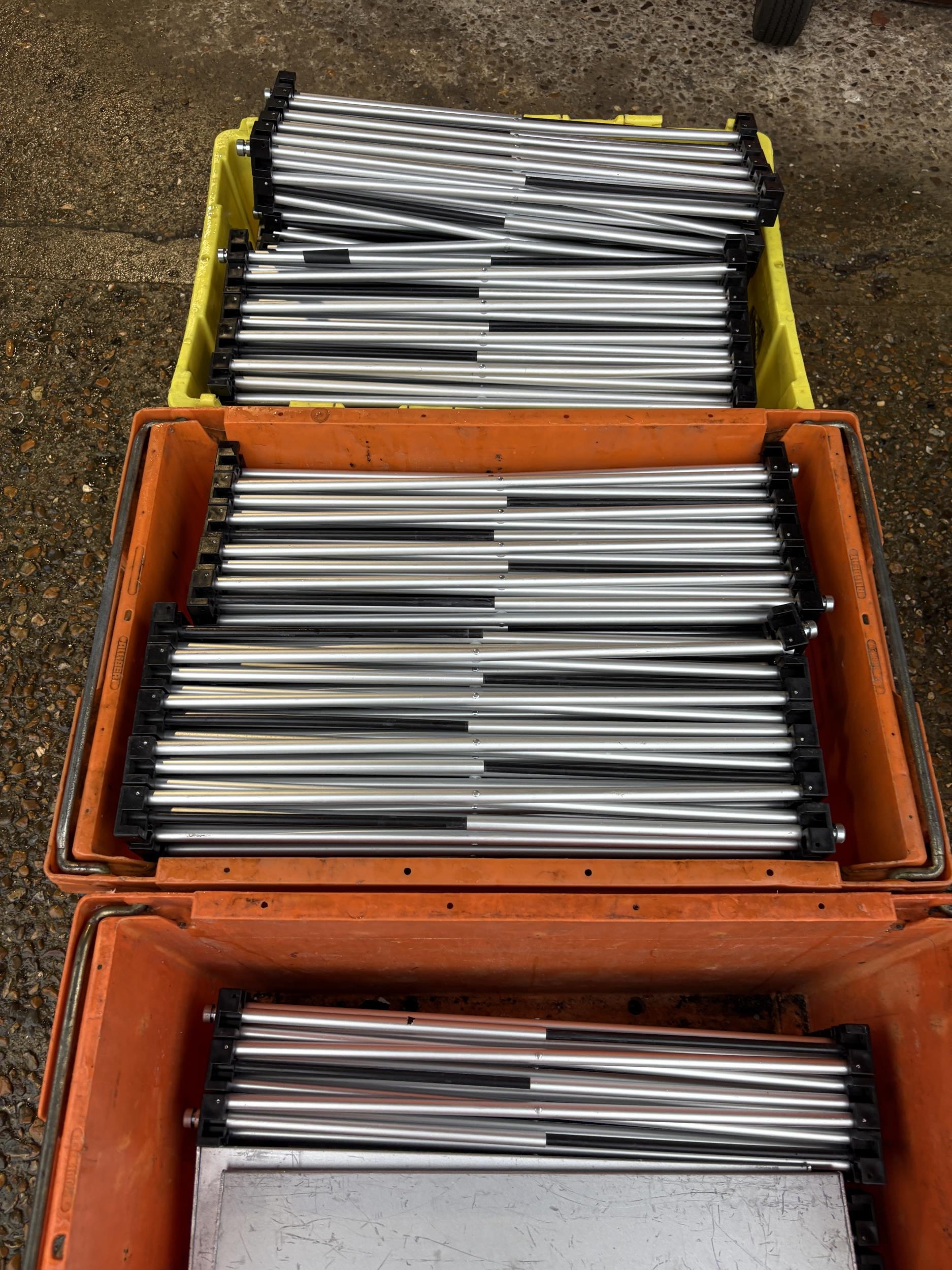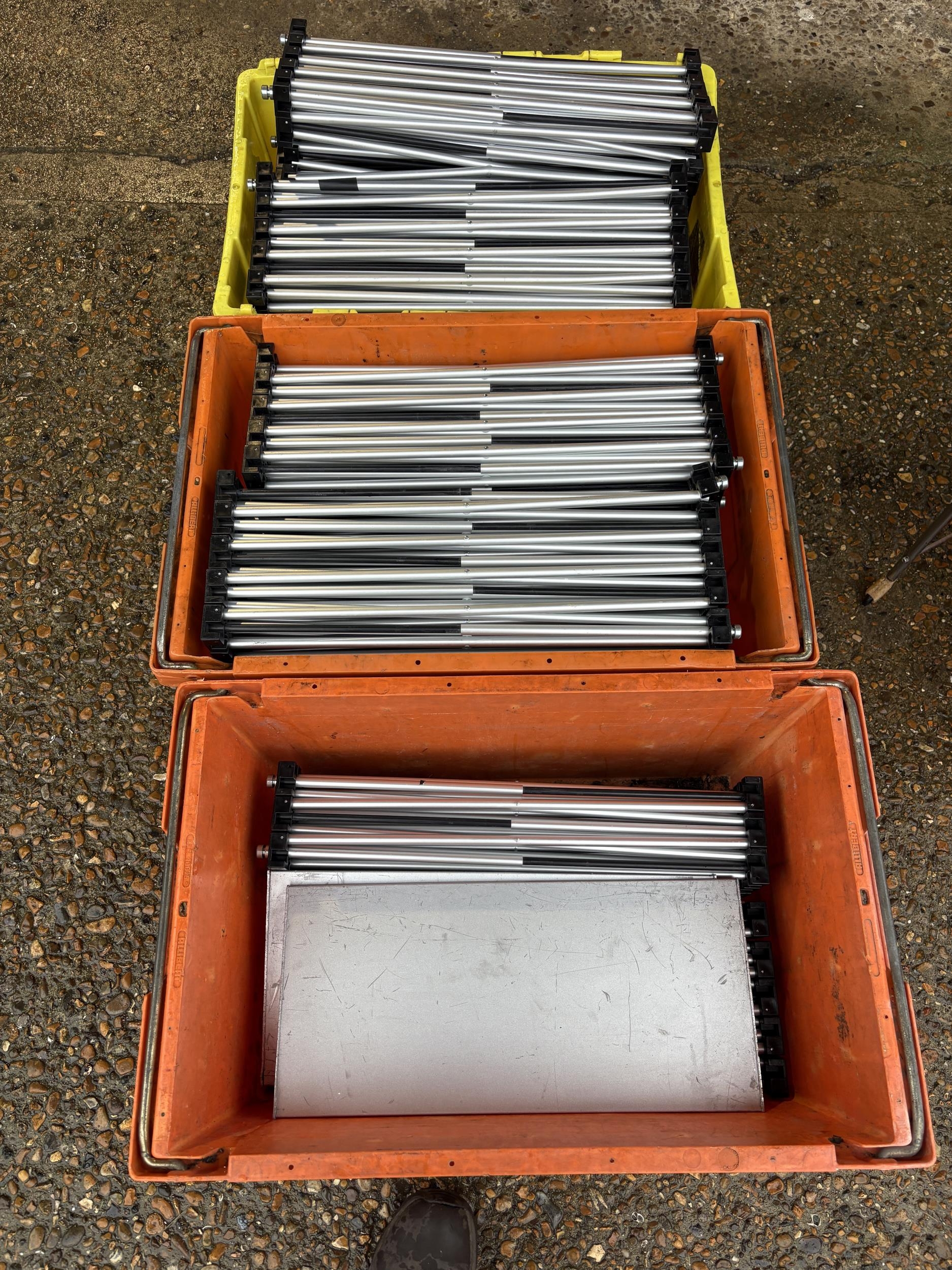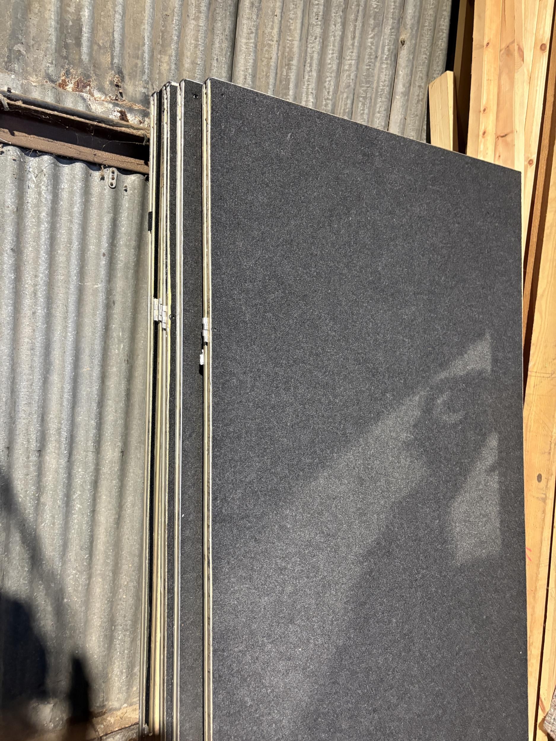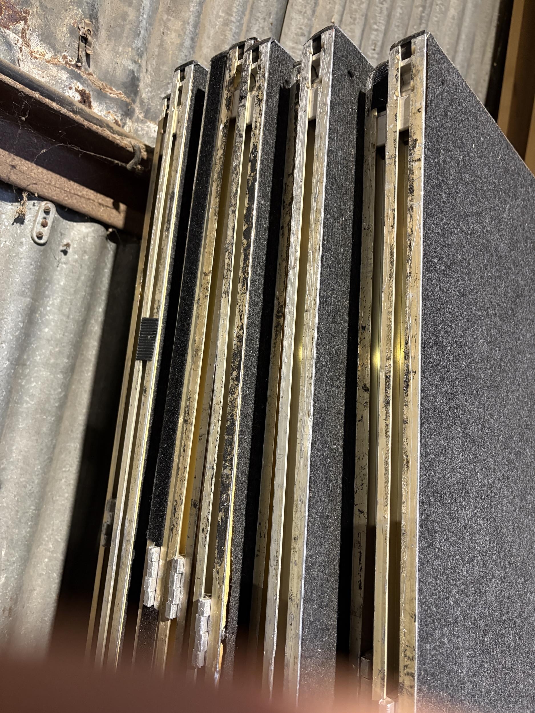 A large collection of fold down event staging, consisting of 12 boards of size 7ft x 3ft each with expanding aluminium base section, interlocking to create stage areas of various sizes. Originally supplied by REVO STAGE