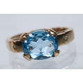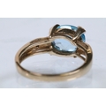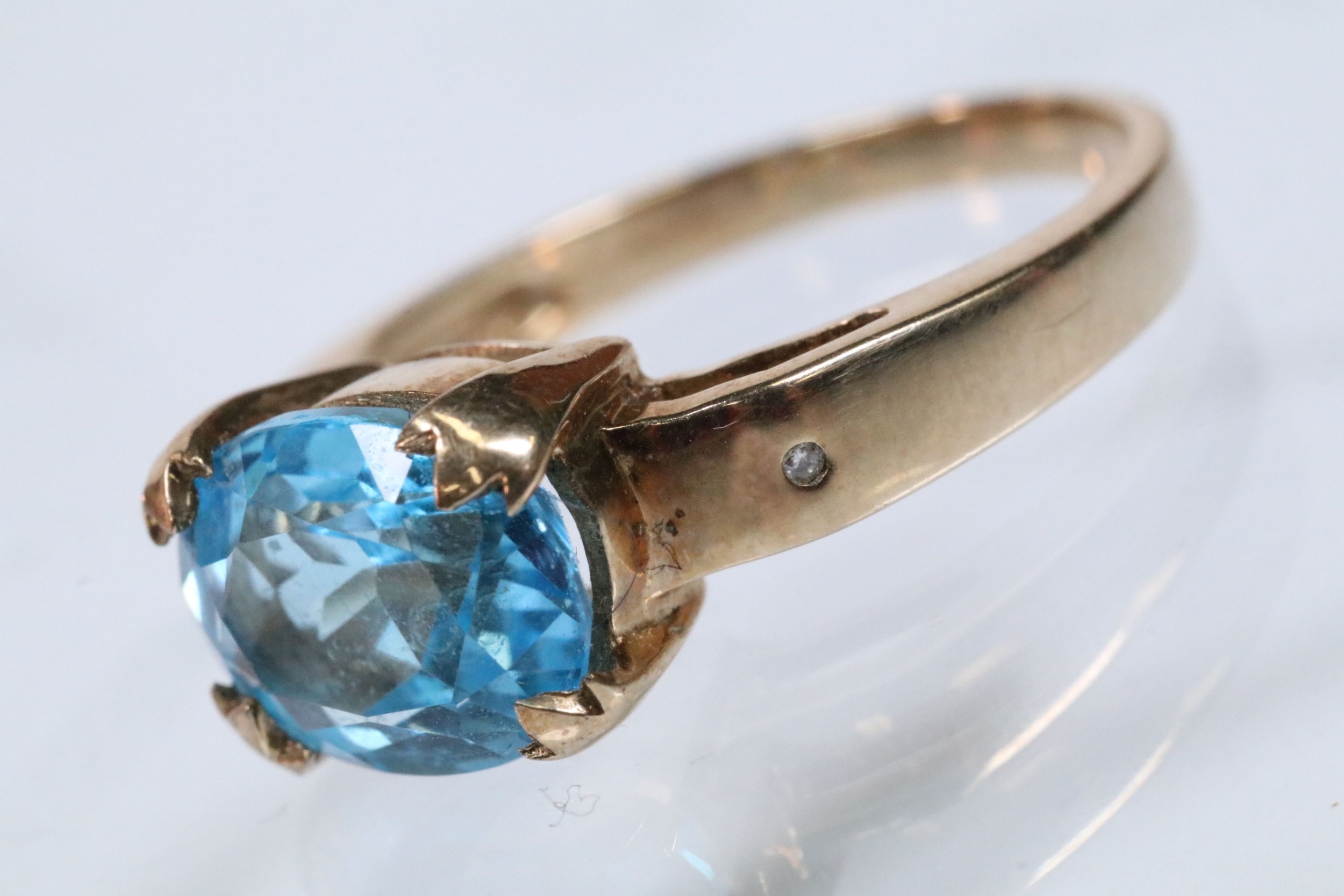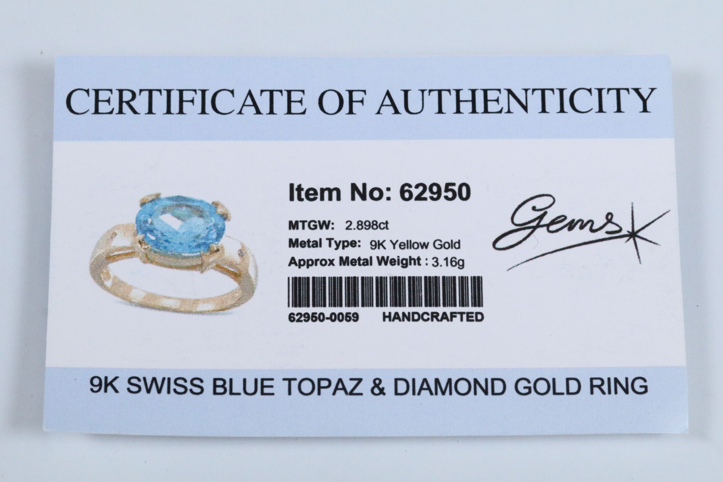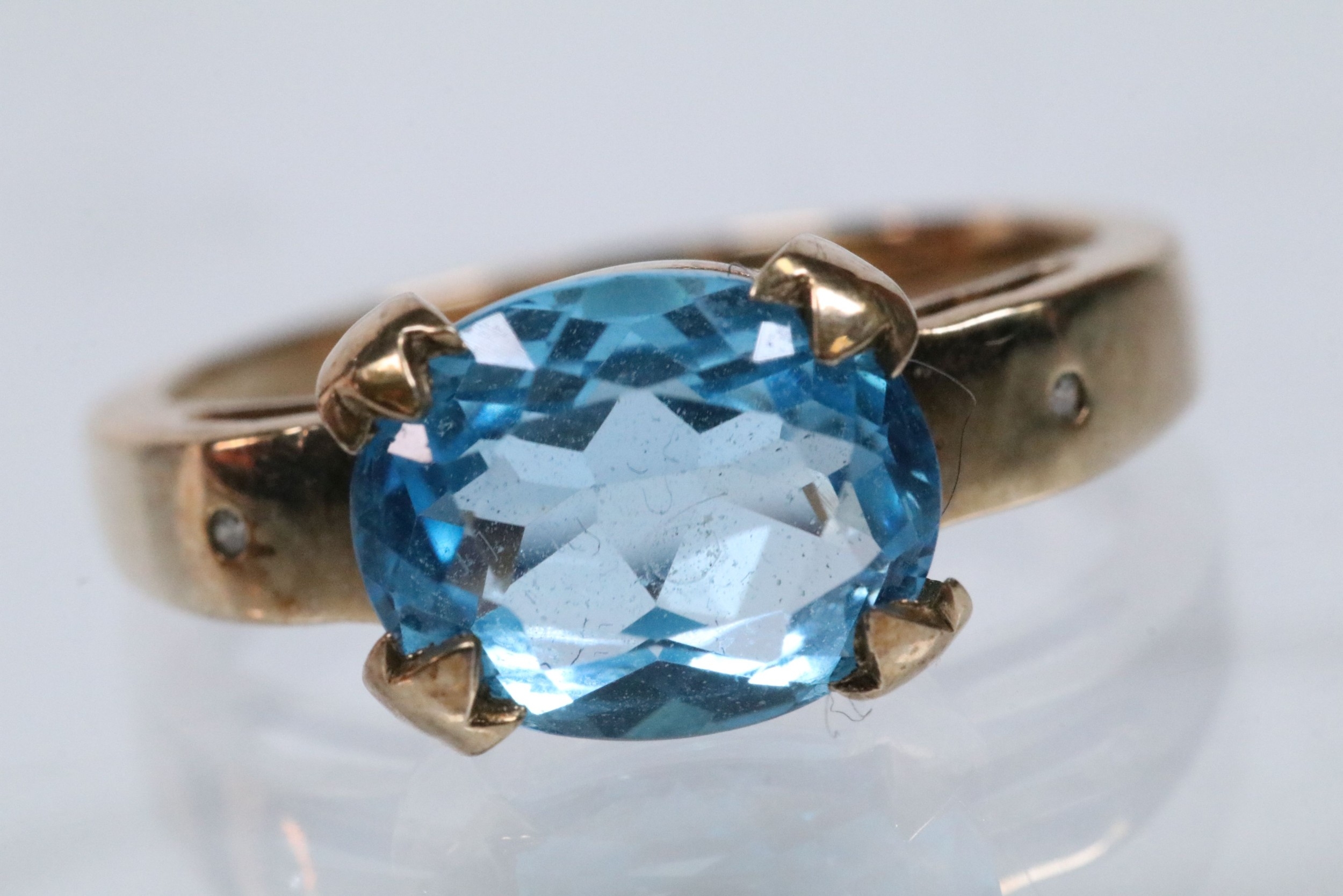 9ct gold and topaz dress ring set with an oval cut topaz flanked by two diamond accent stones. Hallmarked Birmingham 2006. Size N.5.