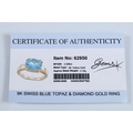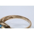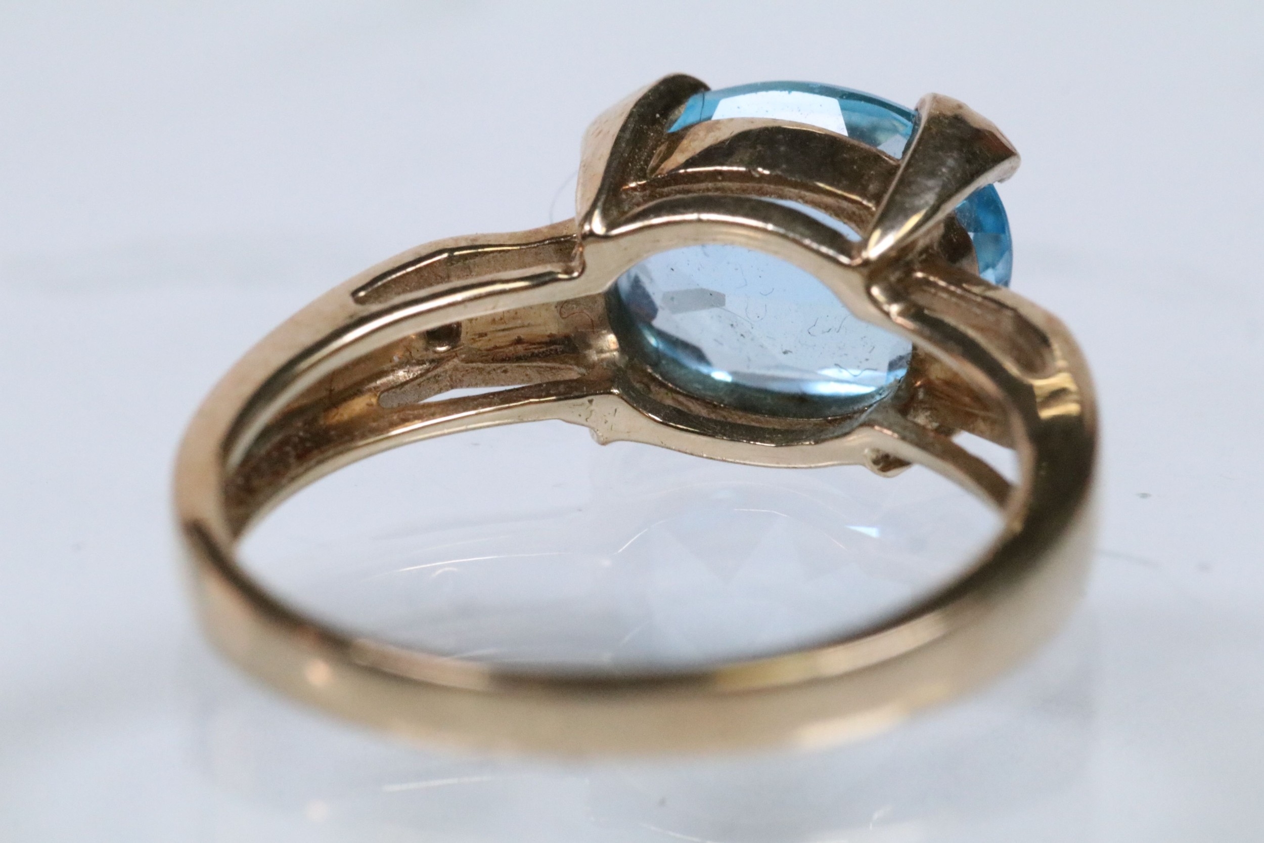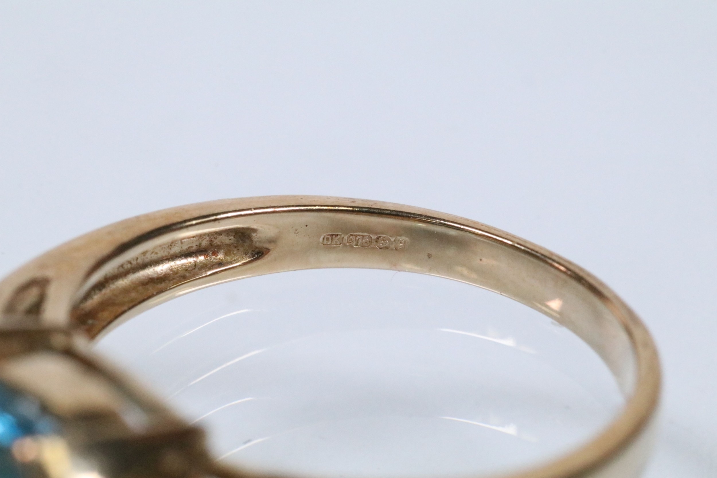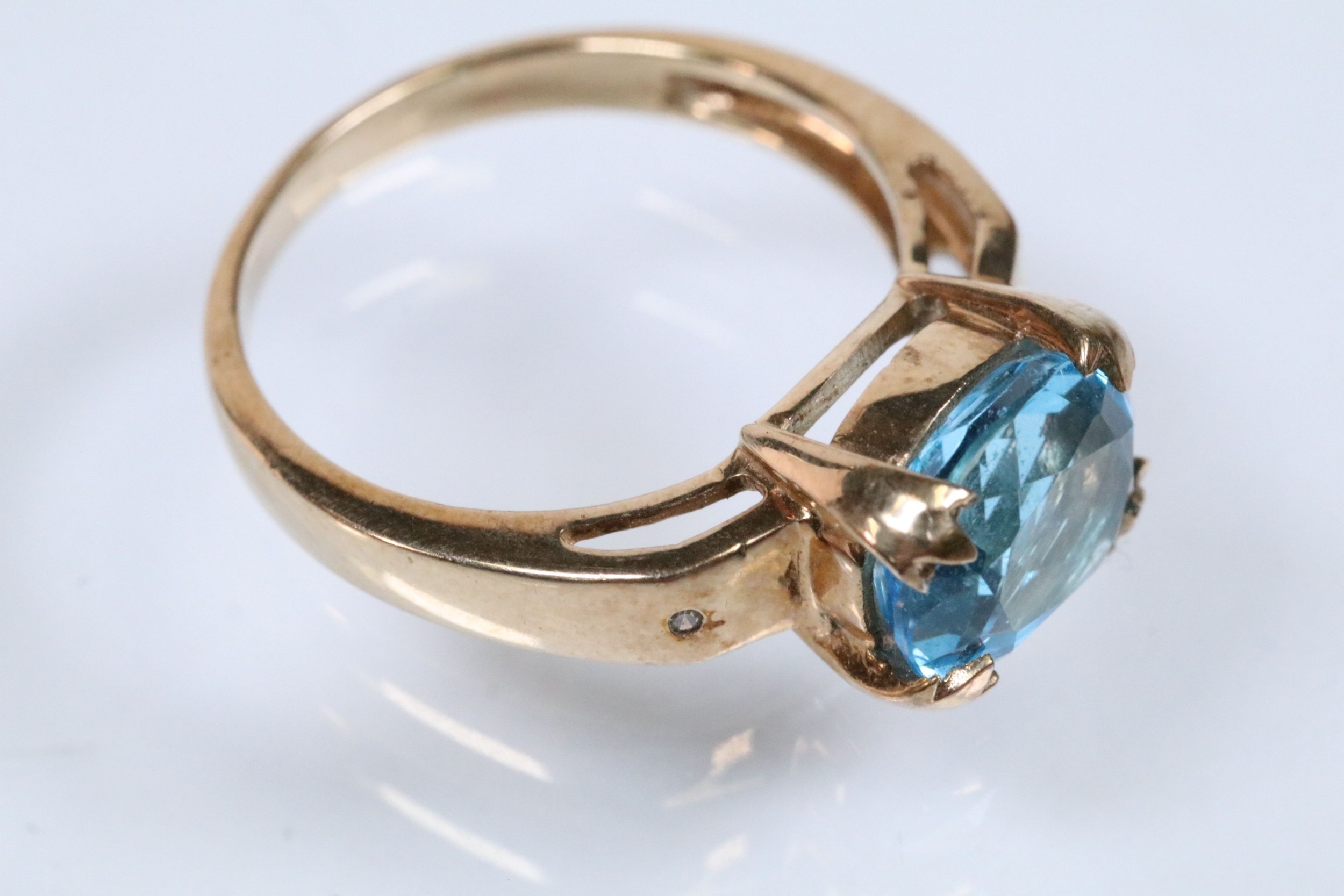 9ct gold and topaz dress ring set with an oval cut topaz flanked by two diamond accent stones. Hallmarked Birmingham 2006. Size N.5.