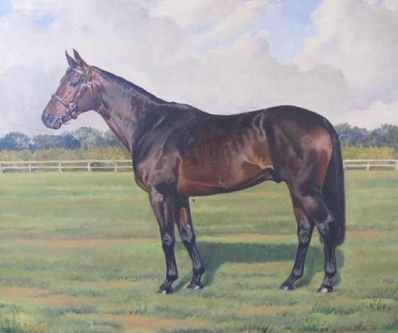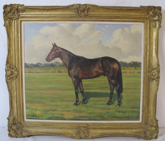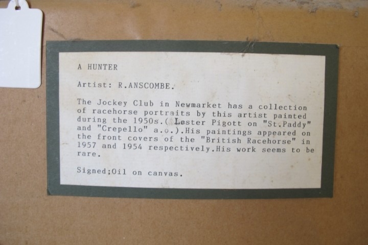 R Anscombe, 20th Century attributed 'A Hunter.' Framed oil on canvas study of a racehorse, unsigned but the frame has a plaque; R Anscombe 1955. 48 x 58cms (approx).