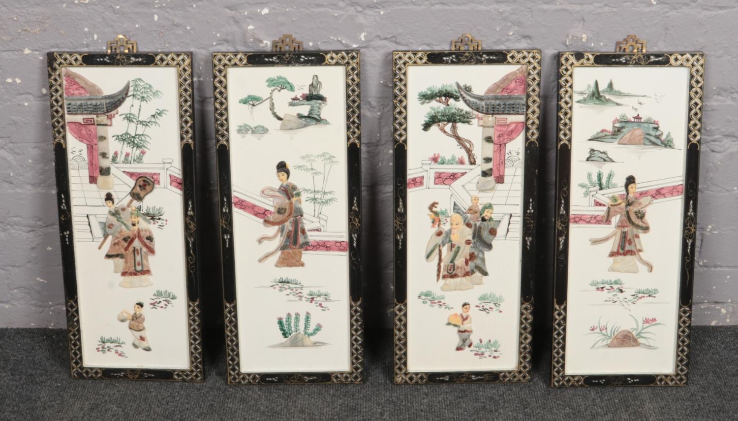 Four oriental style wooden pictures