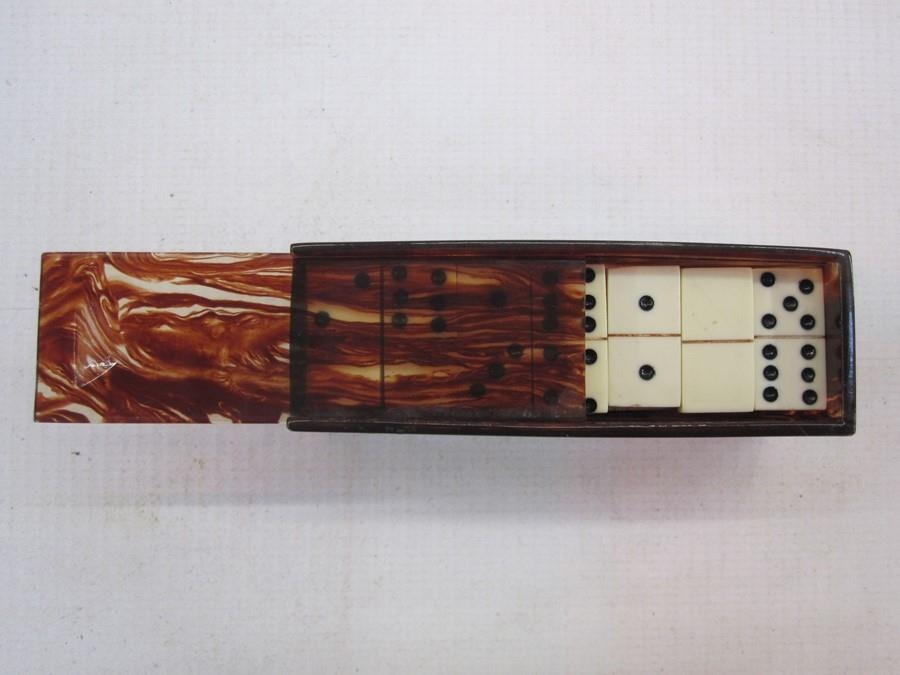 Miniature set of 'Dominos de Poche' in faux ivory and phenolic, in a faux tortoiseshell box, c. 1920