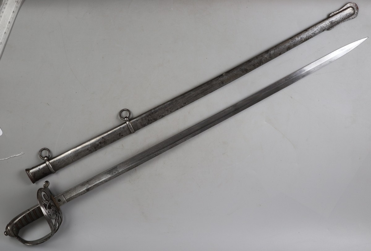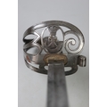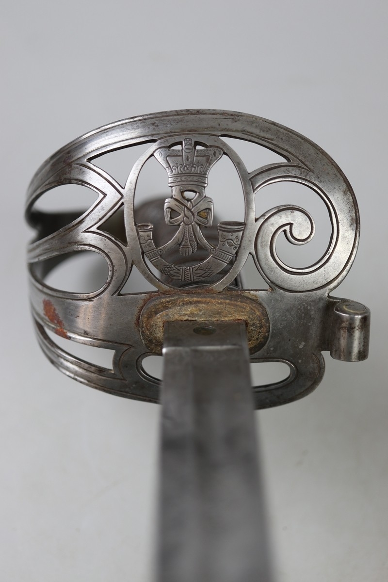 1892 pattern Rifle Regt. Officer's sword, with steel scabbard and 2 suspension rings, blade etched and at ricasso makers details- 'Herbert & Co. London'. In centre of spine of blade is a proof marking, showing high quality proof testing. Shagreen and twisted wire in good condition, and knuckle guard with Crown over Strung Bugle (of Rifles Regt)
