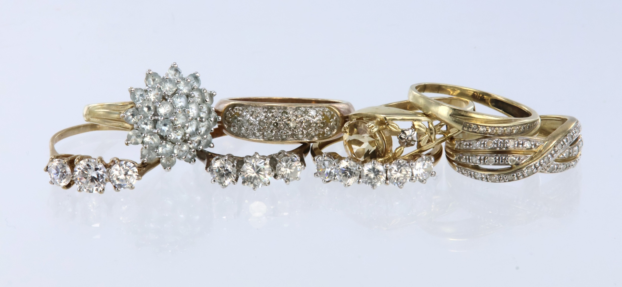 Eight 9ct/tests 9ct yellow gold dress rings, assorted designs, various sizes, gross weight 21.3g, AF