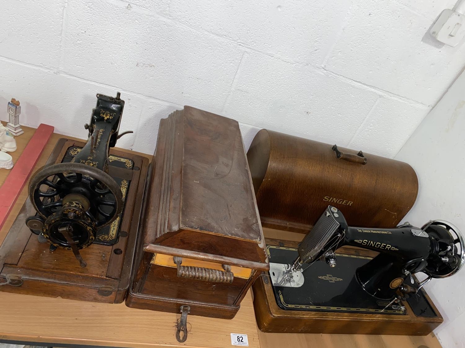 Two Singer hand crank sewing machines
