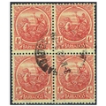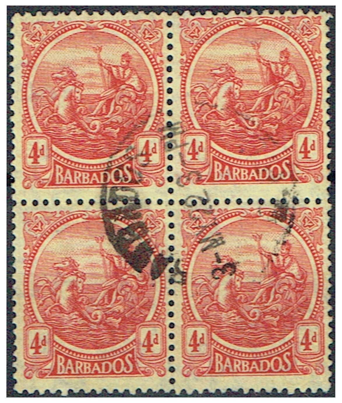 BARBADOS - 1921 Wmk MCCA 4d red on yellow small format Seahorses in an attractive used block of four, SG 214.
