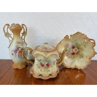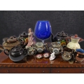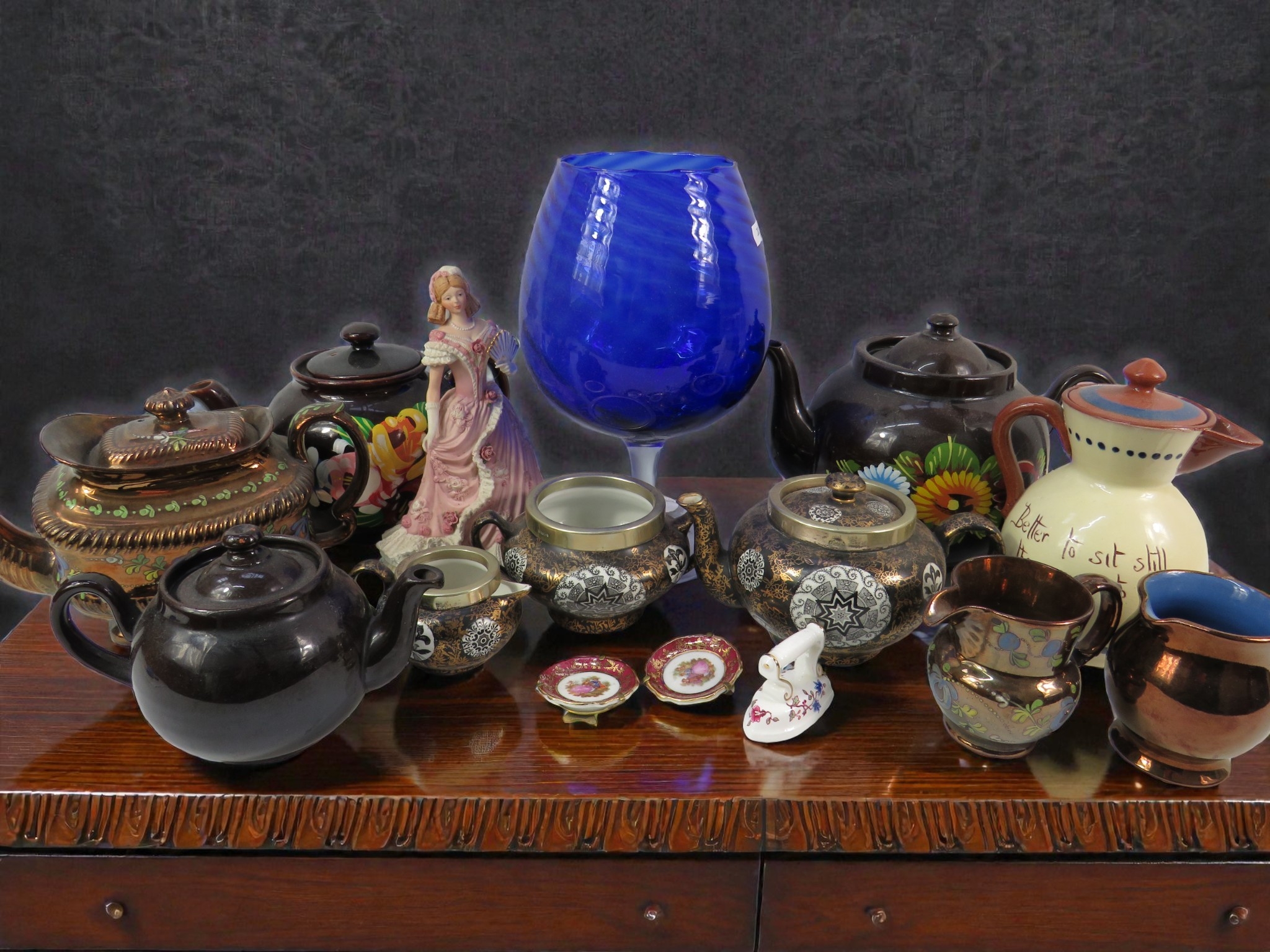 Mixed collection of novelty teapots and decorative ceramics including named Fenton Nulbi-Osaka teaset. Centerpiece is large cobalt blue art glass vase (approximately 30cm). Includes multiple novelty teapots in brown glazes with floral decoration, black glazed teapots, decorative Japanese-style teapots with ornate metal work, Victorian-style porcelain figurine, copper luster jugs, miniature porcelain dishes with floral centers, and ceramic bird figure. Teapots show various styles from traditional English to Oriental designs. Condition mixed with some chips and wear typical of novelty ceramics. Eclectic lot appealing to teapot collectors and decorative ceramic enthusiasts.