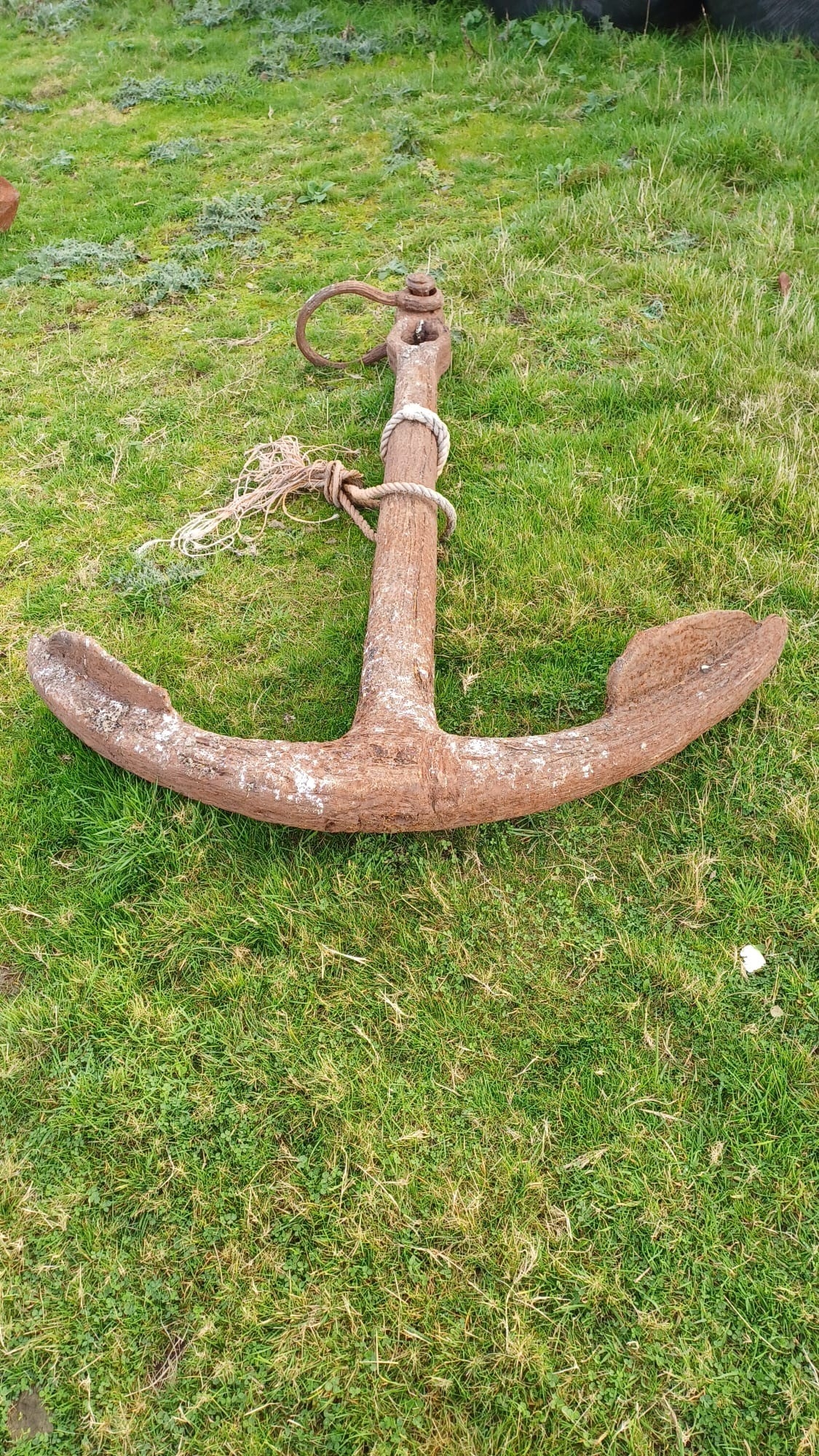 A large 20th century steel anchor - admiralty type with spade shaped flukes, recovered from the seabed whilst trawling, 195cm high, fitted with a shackle. Note: This not has not been delivered to our saleroom, but can be viewed by appointment near St Just. Prospective purchasers need to bear in mind that this item is very heavy and they must have the wherewithal to collect.