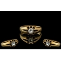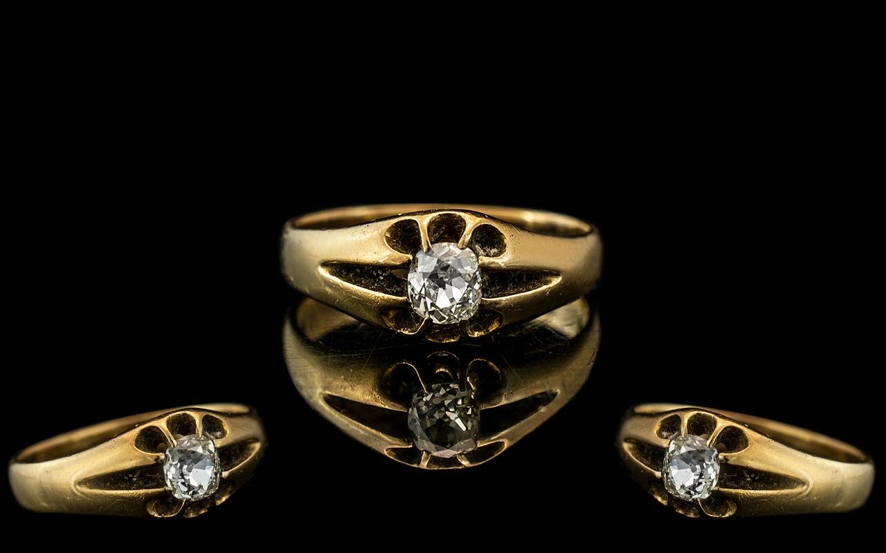 18ct Gold - Attractive Single Stone Diamond Set Ring, Gallery Setting. Marked 18ct to Interior of Shank. The Semi-Cushion Cut Diamonds of Excellent Colour / Clarity - Sharp / Crisp. Est Diamond Weight 0.35 pts. Ring Size R. Setting / Shank Excellent. Weight 4.9 grams.