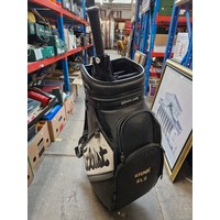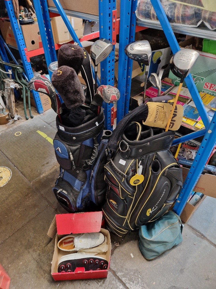 Two golf bags containing a number of clubs, mainly drivers (2 Taylormade & 1 Ping), woods etc together with a pair of Dexter Boston golf shoes (original tags still attached), and a bag of golf balls. Includes Ping TFC149 G15 20 degrees and 23 degrees rescue clubs and a couiple of other vintage Ping clubs