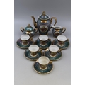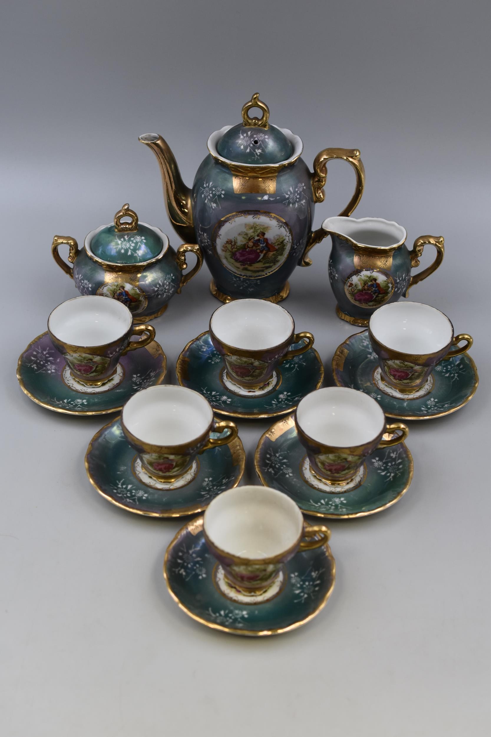Bavaria style tea set to include six cups and saucers, milk jug, sugar bowl, and tea pot, tea pot stands 7.5" high