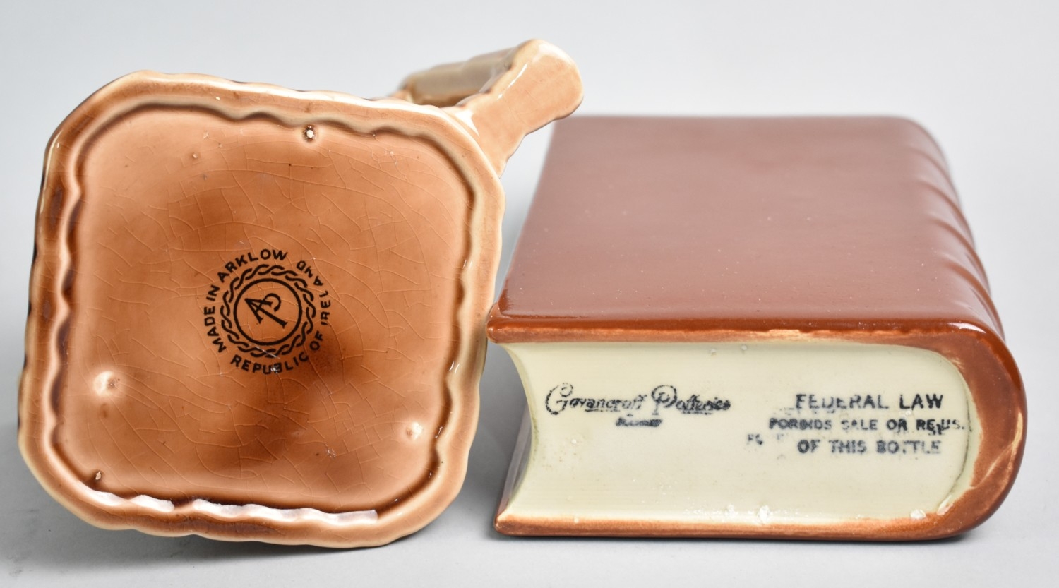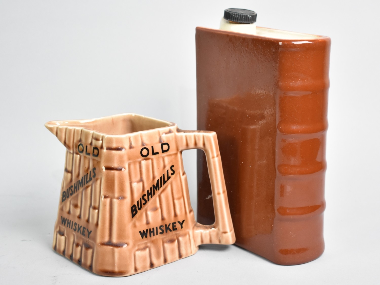 A Mid 20th Century Advertising Jug for Old Bushmills Whiskey together with a Novelty Flask in the Form of a Book by Govancroft