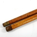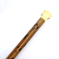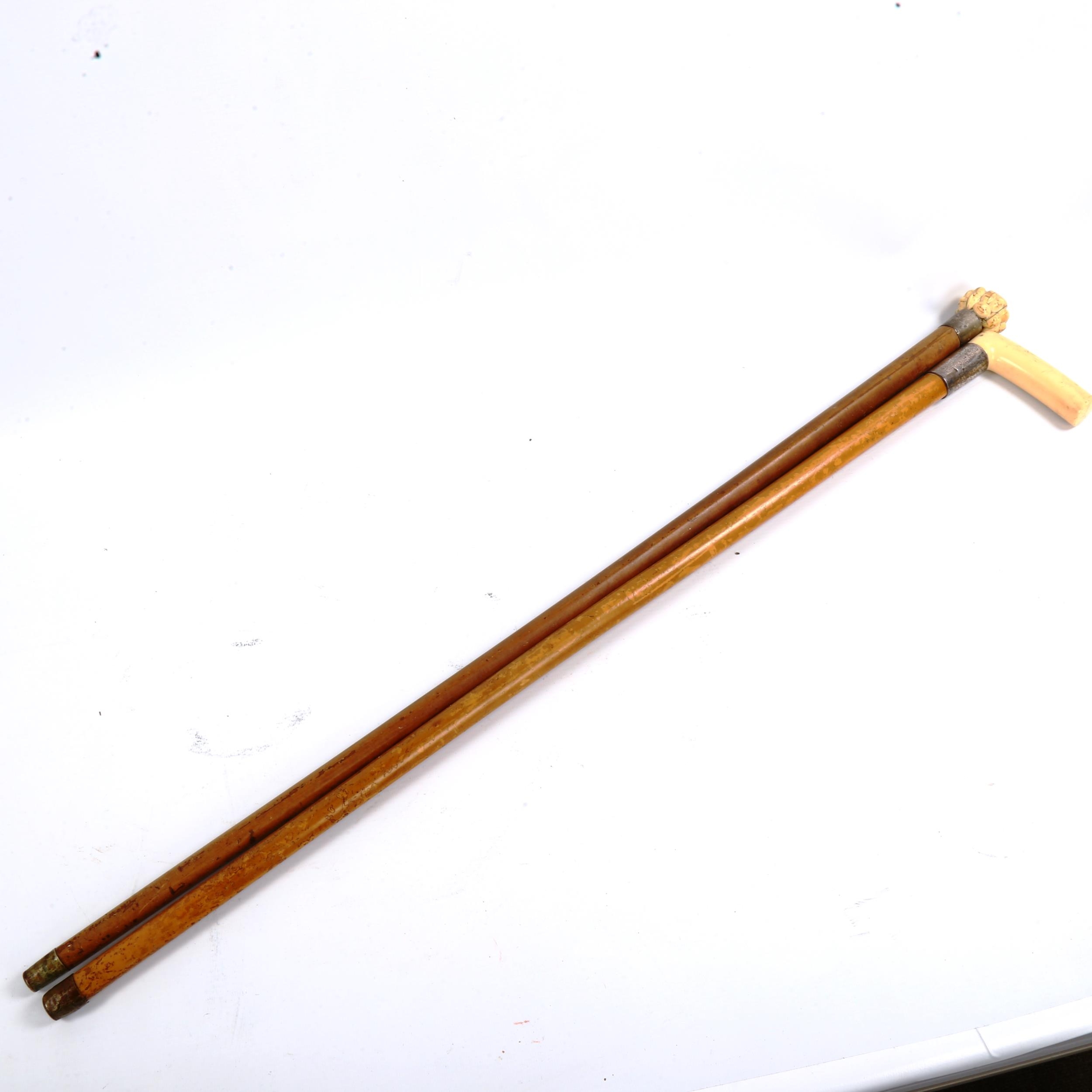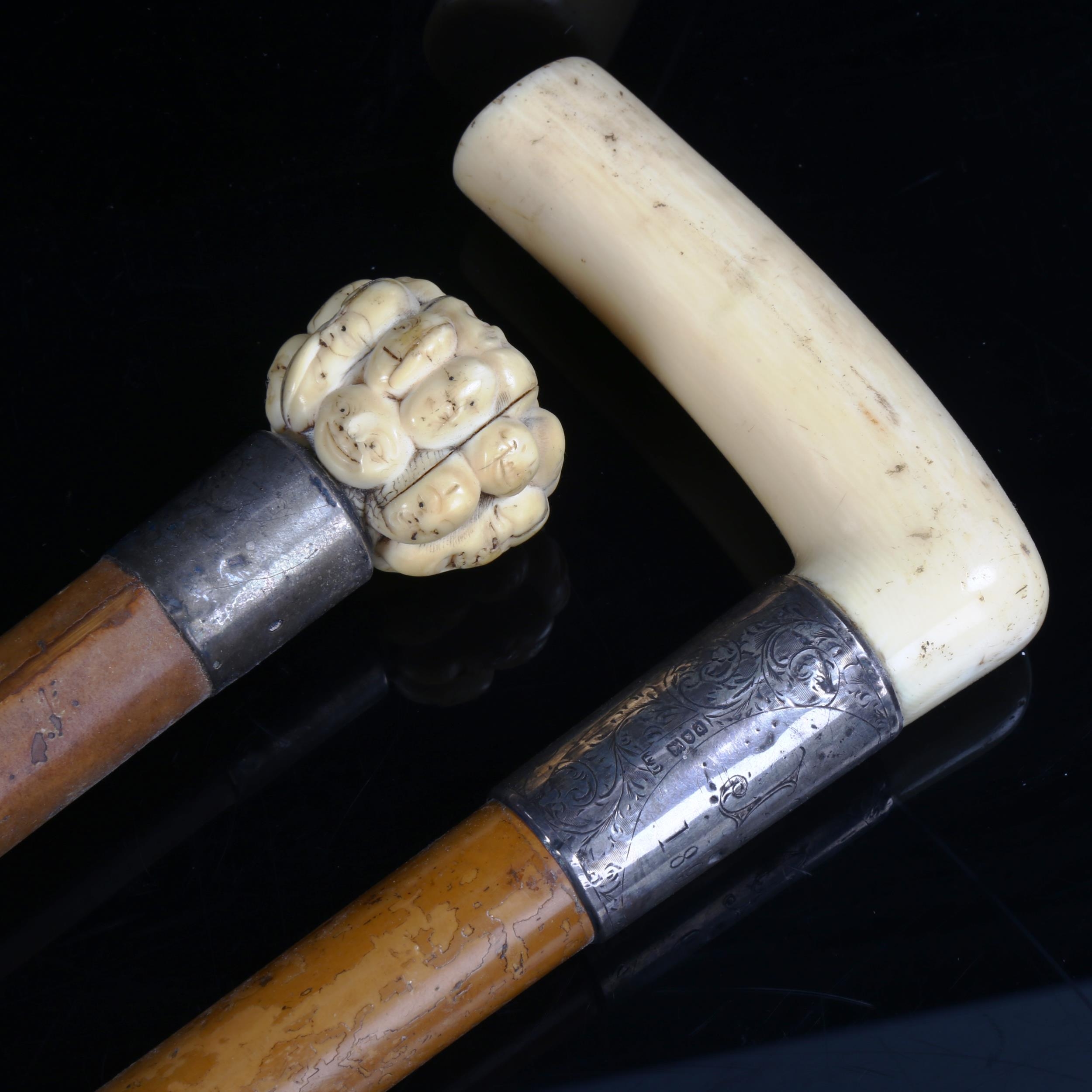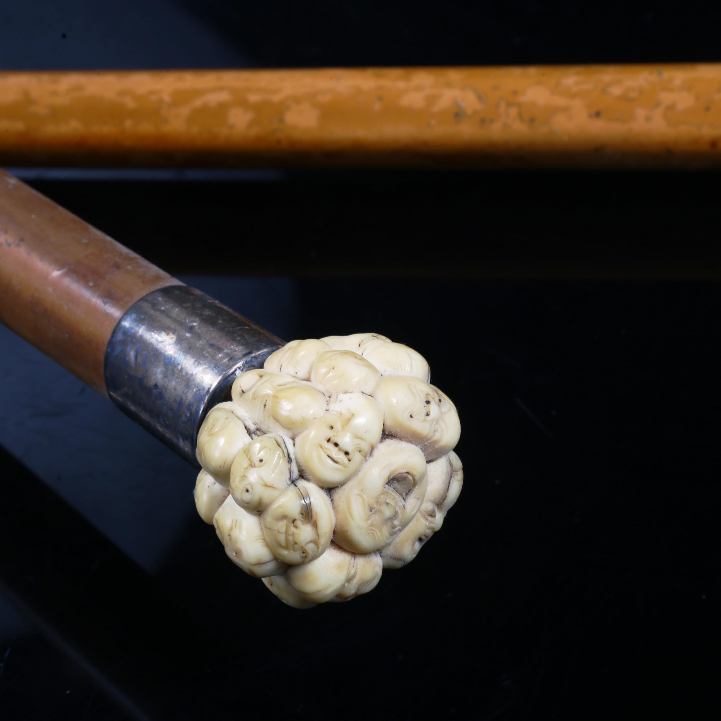 A Japanese ivory-handled netsuke, depicting man faces, and an ivory and silver-handled walking stick (2)