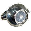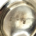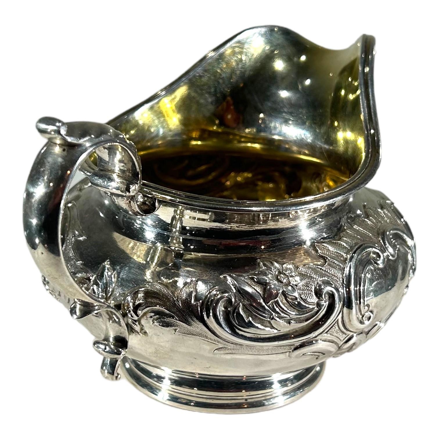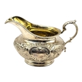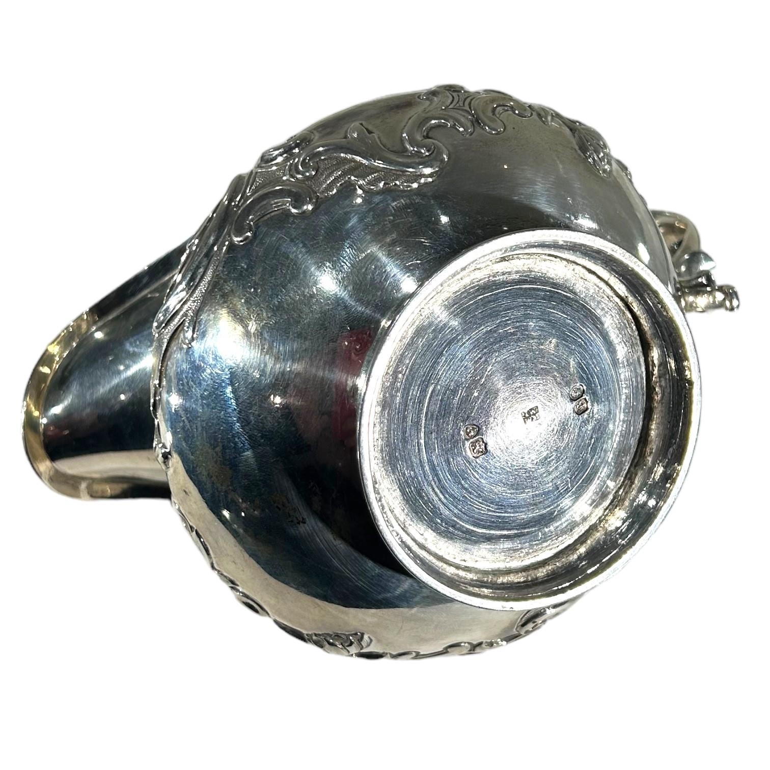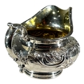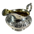 Repoussé ‘C’ scroll decoration on top of chased textured ground, acanthus leaf thumb grip handle, gilt washed interior.