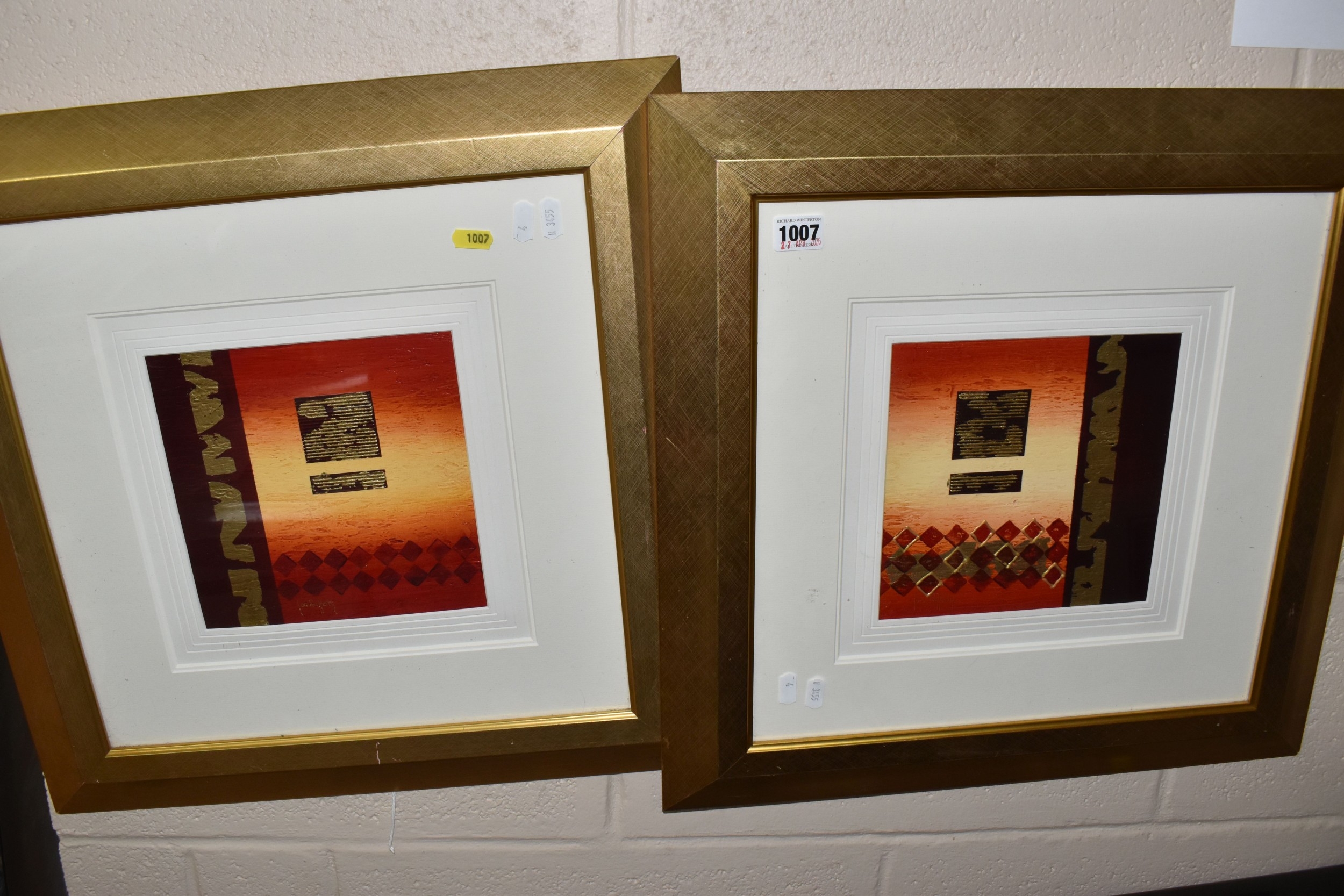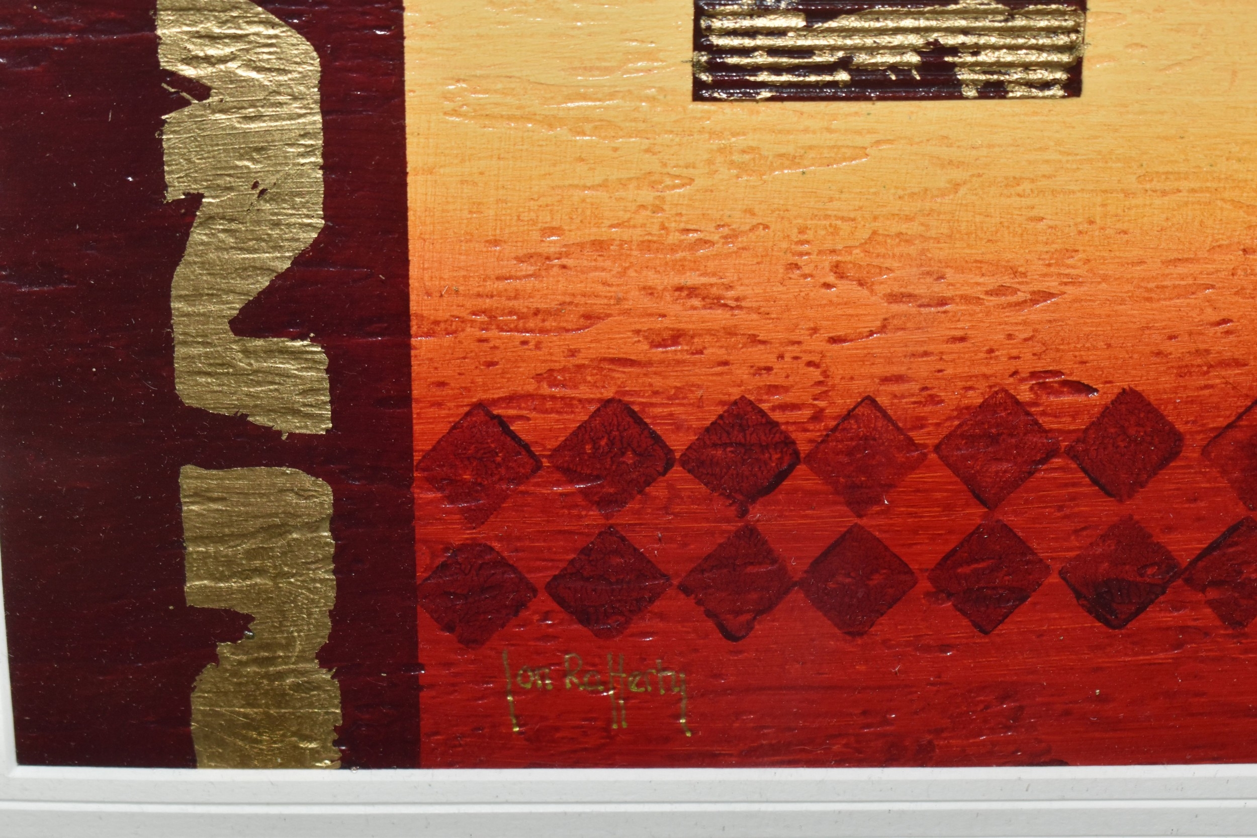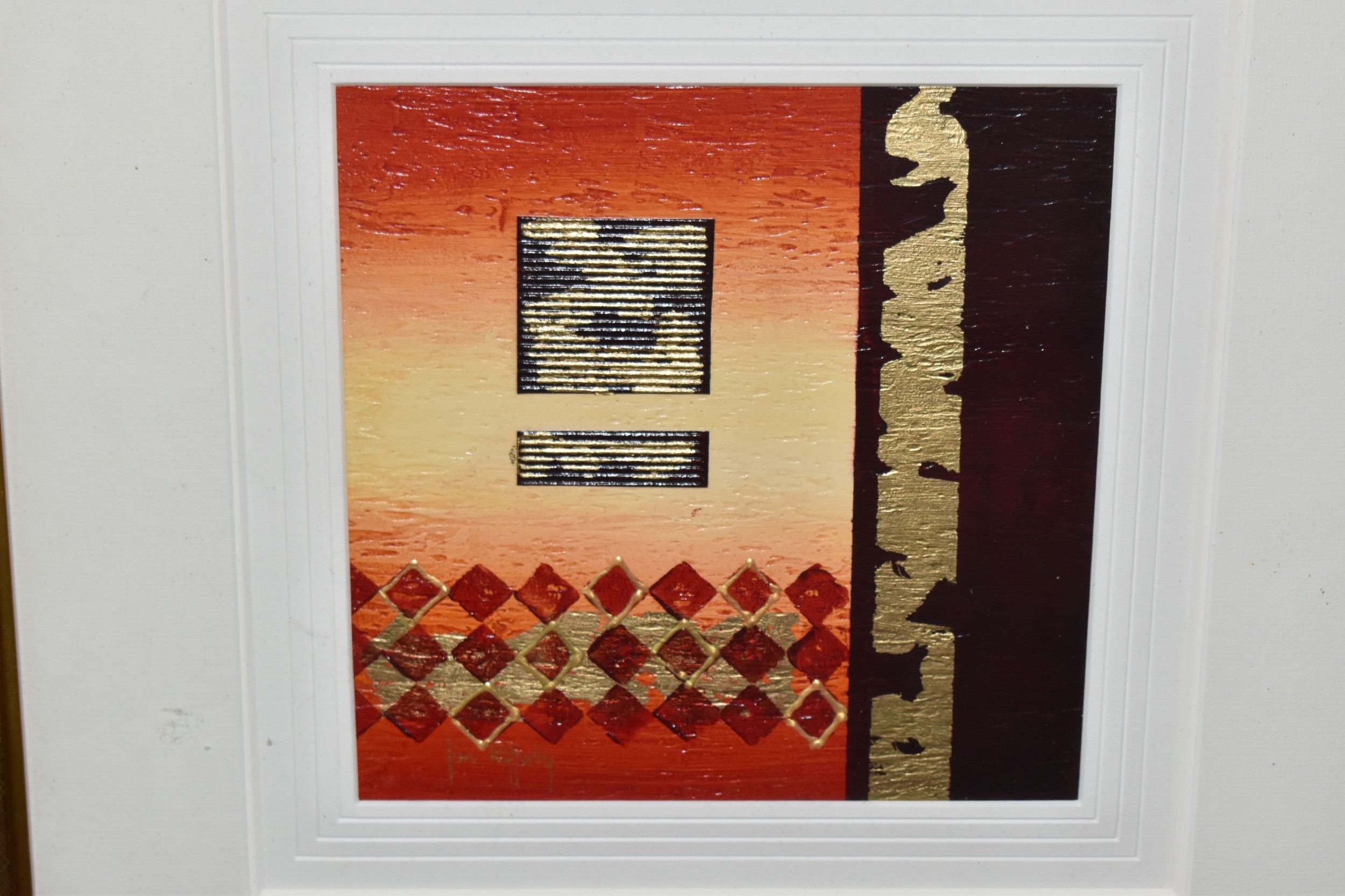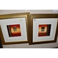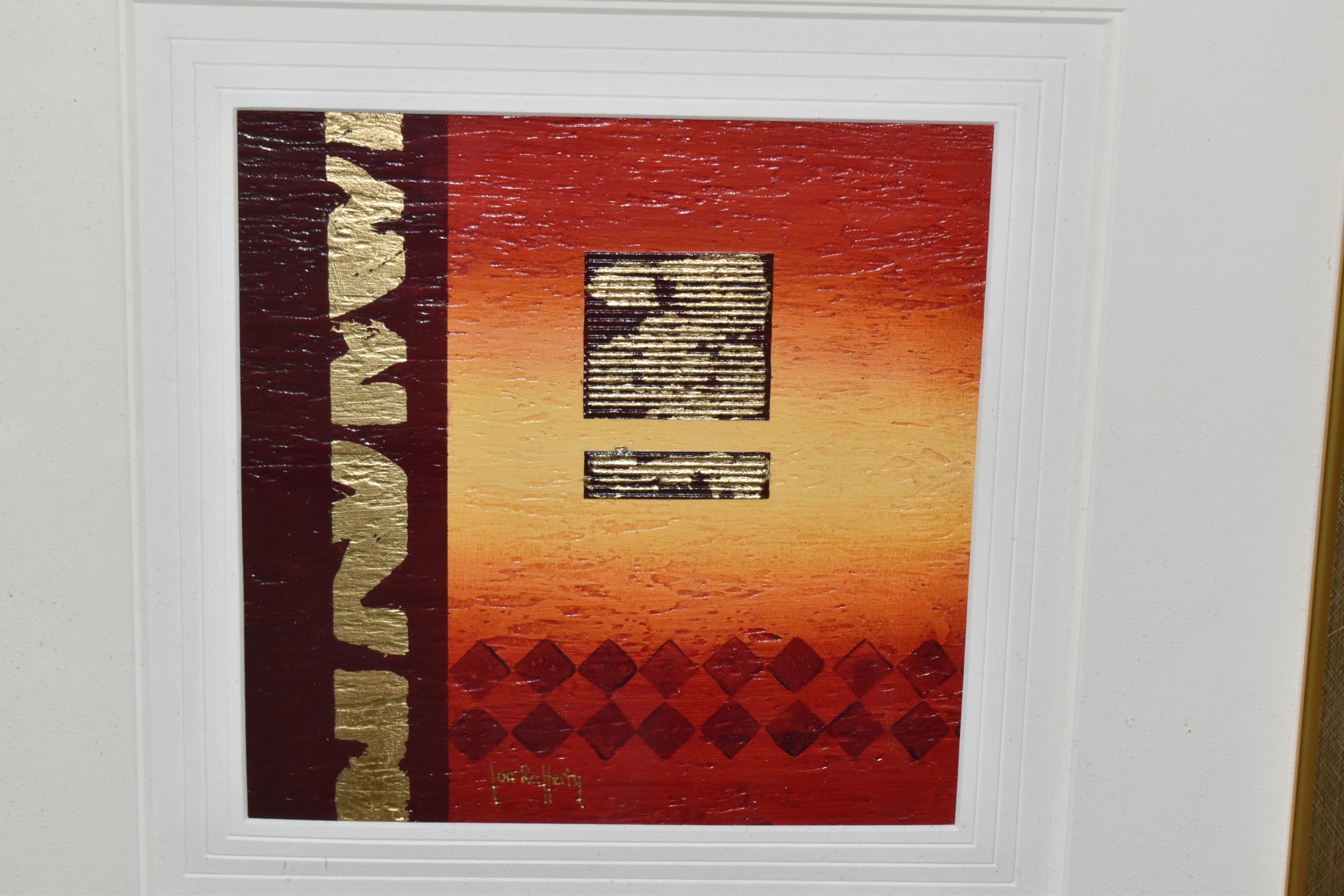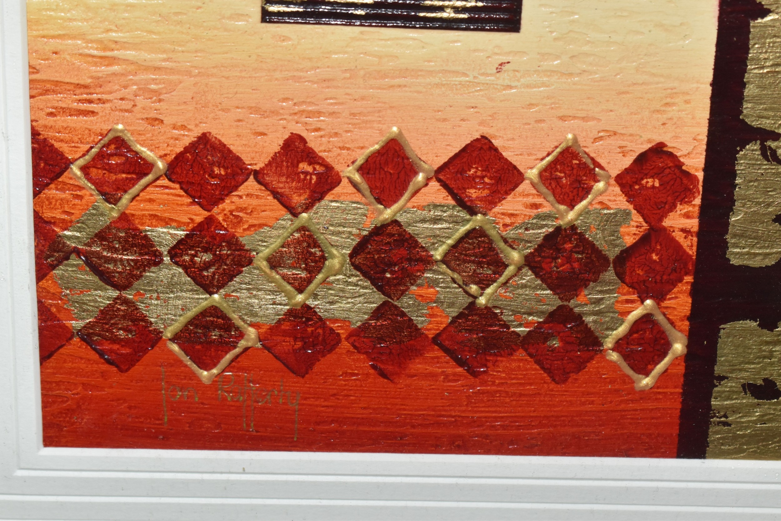 JON RAFFERTY (CONTEMPORARY) TWO ABSTRACT DESIGN PICTURES, signed bottom left, mixed media on board?, approximate sizes 20cm x 20cm, frame sizes 52cm x 52cm