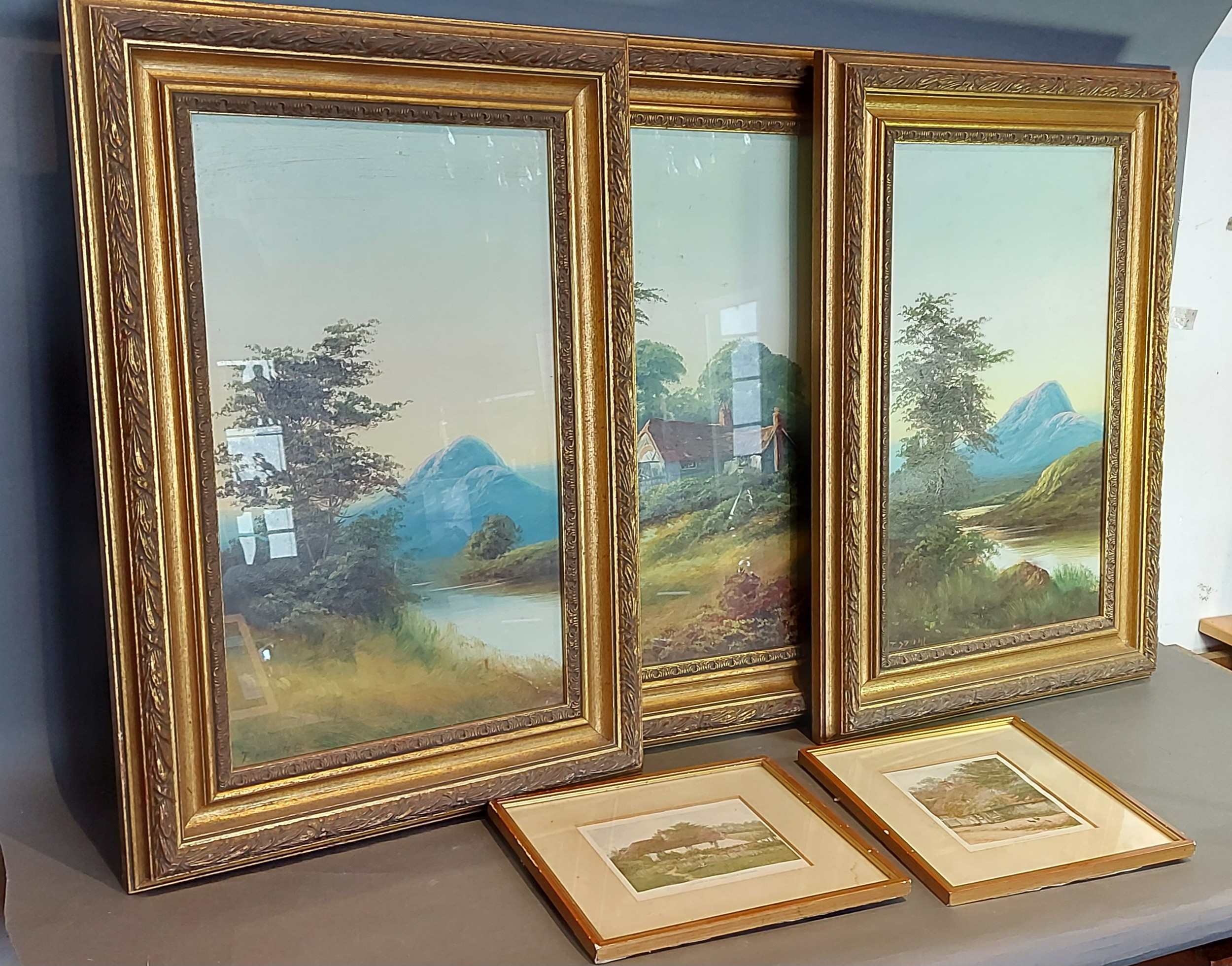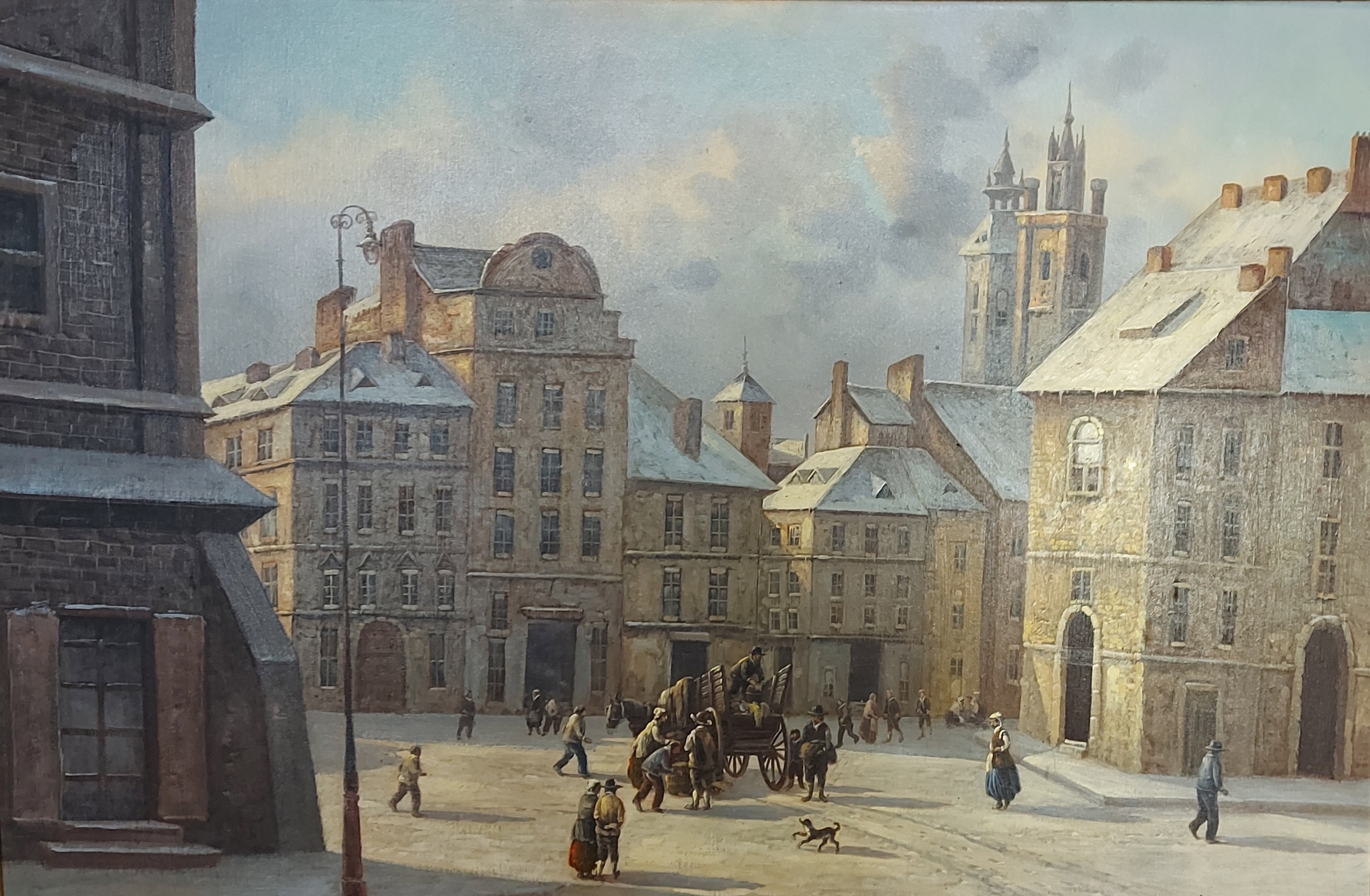 Kevan Hegarty, street scene with figures, oil on canvas, signed, 60cms x 90cms together with six other pictures