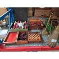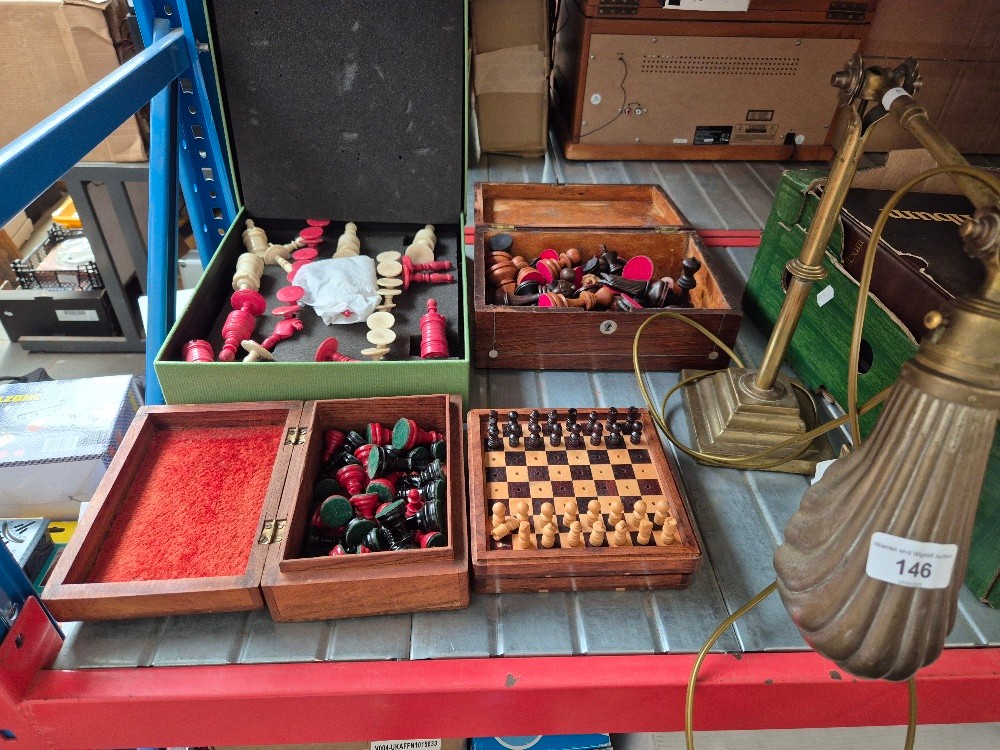 A vintage brass desk lamp with clam shell shade and 4 boxes containing chess pieces