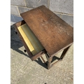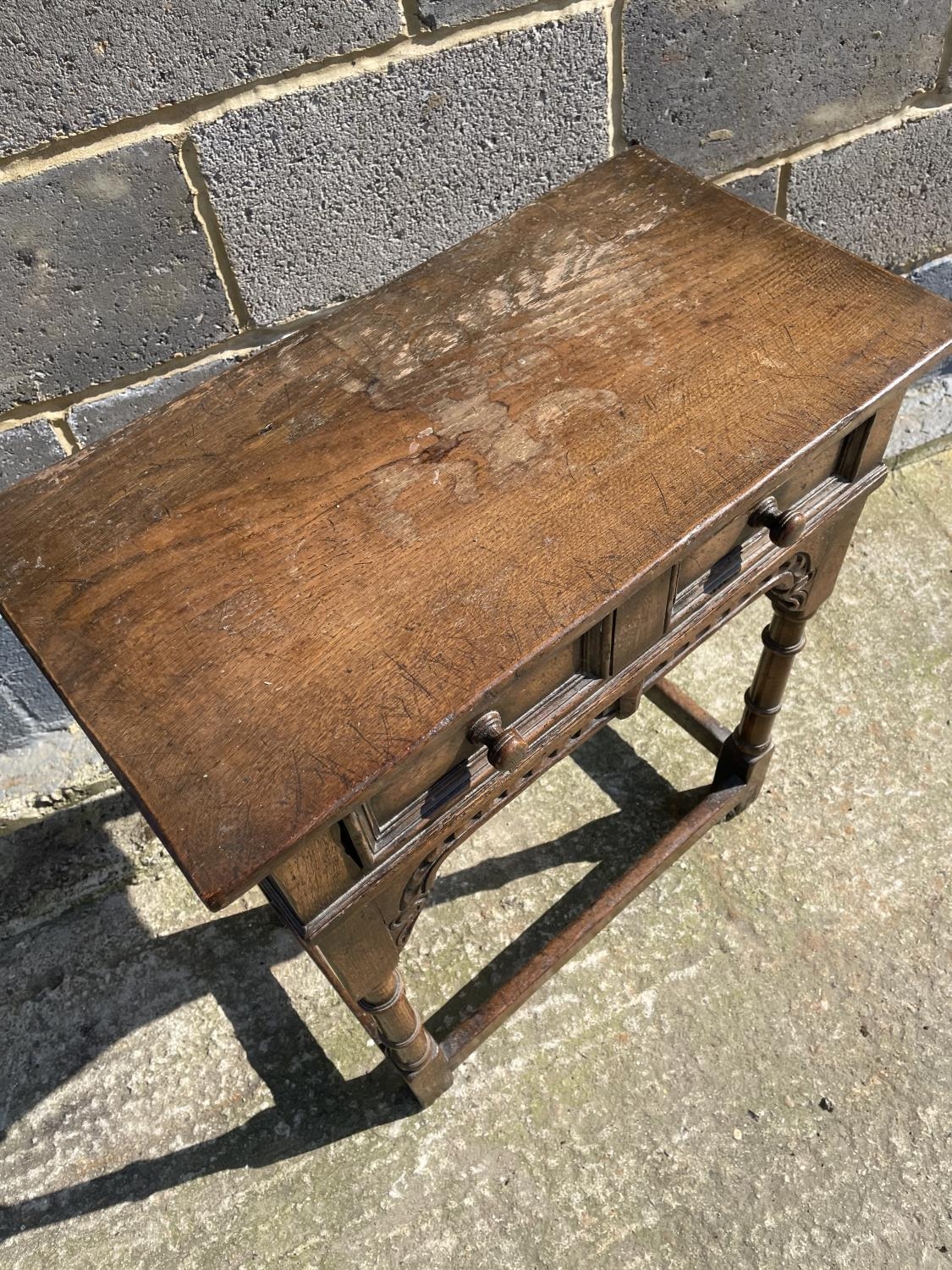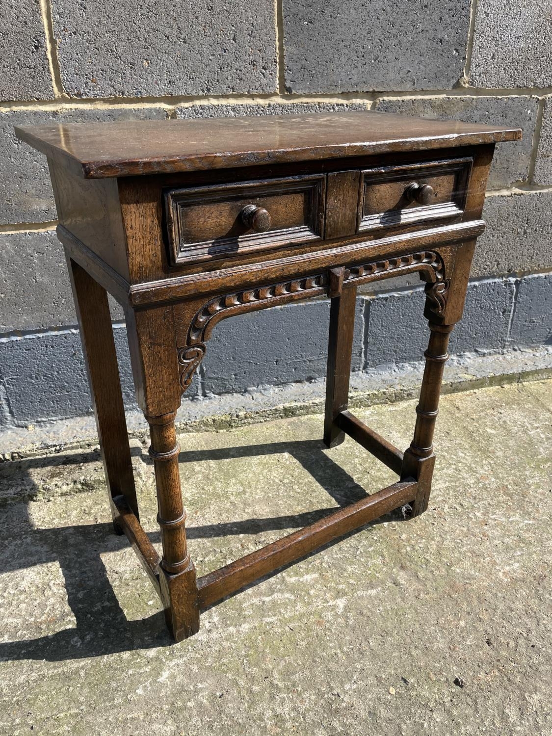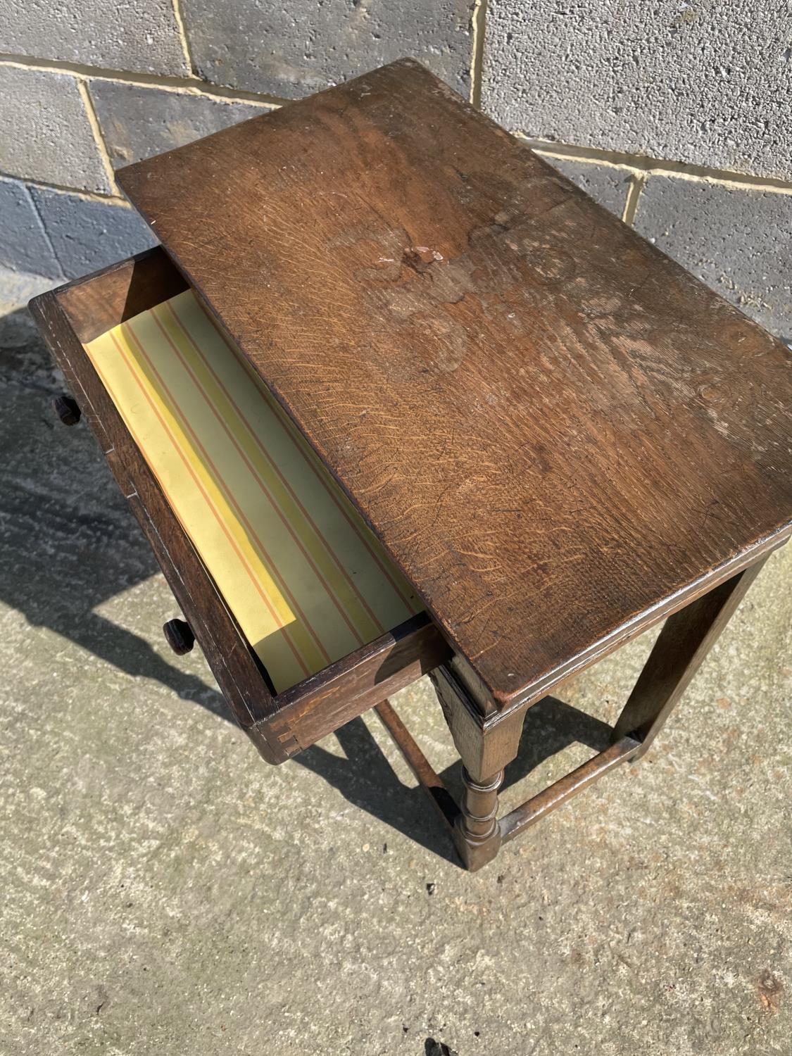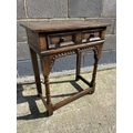 A reproduction oak single drawer side table with carved decoration 61x33x71