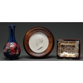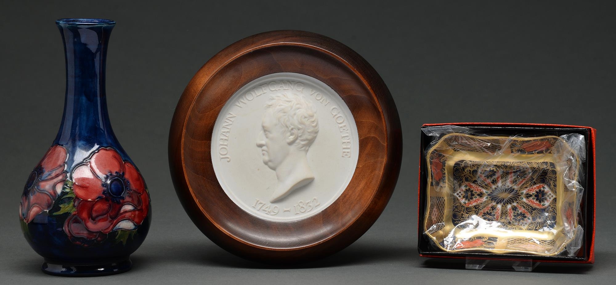 A Meissen biscuit Goethe commemorative medal, 20th c, 10cm diam, crossed swords, a Royal Crown Derby Imari pattern pin tray, boxed and a Moorcroft Anemone vase (3)