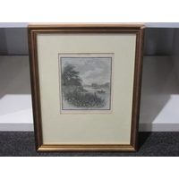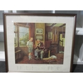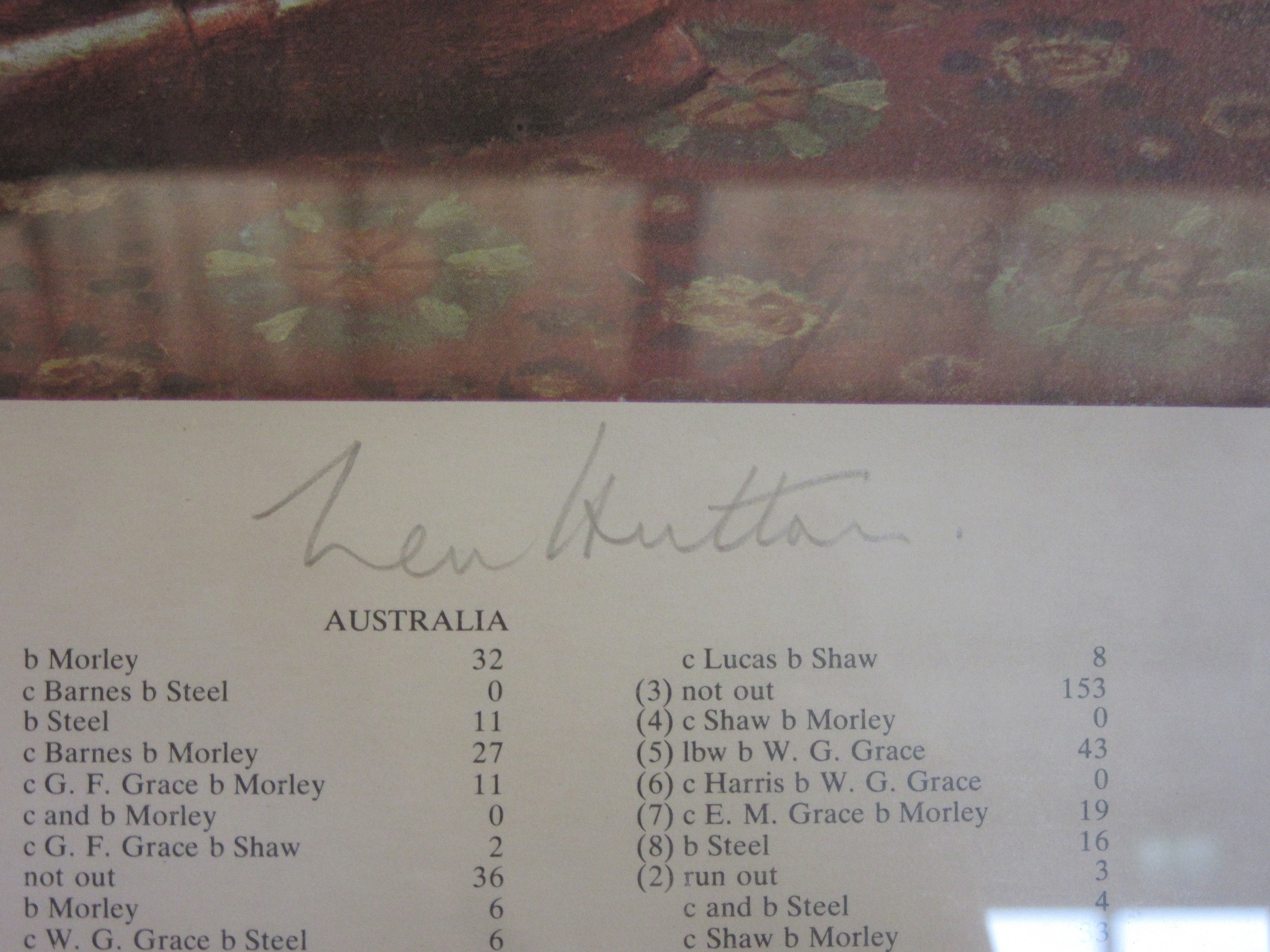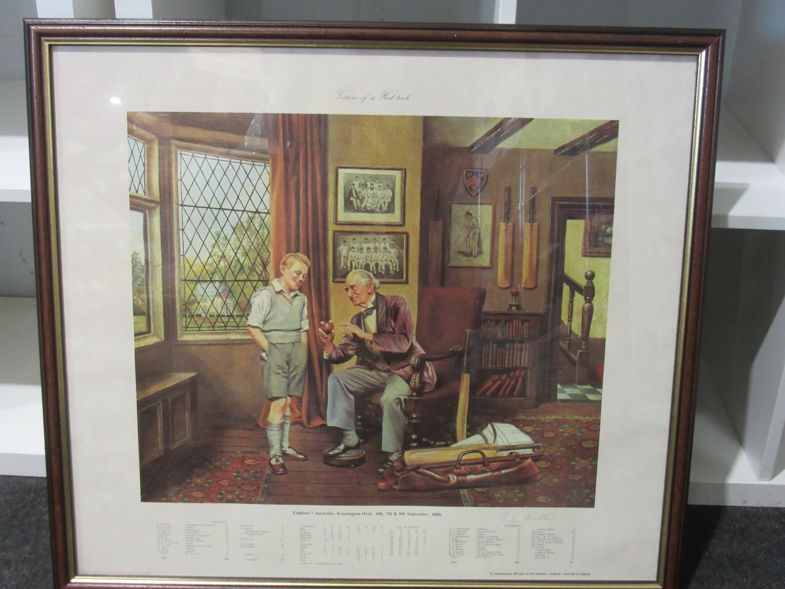 A print 'Visions of a Hat Trick', cricket themed, signed by Ken Hutton, framed and glazed