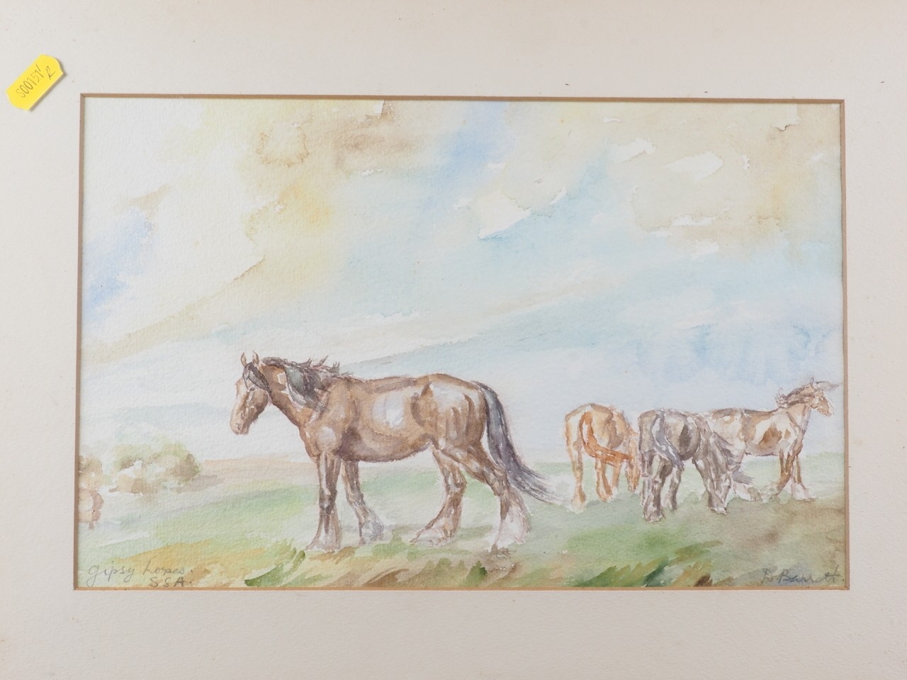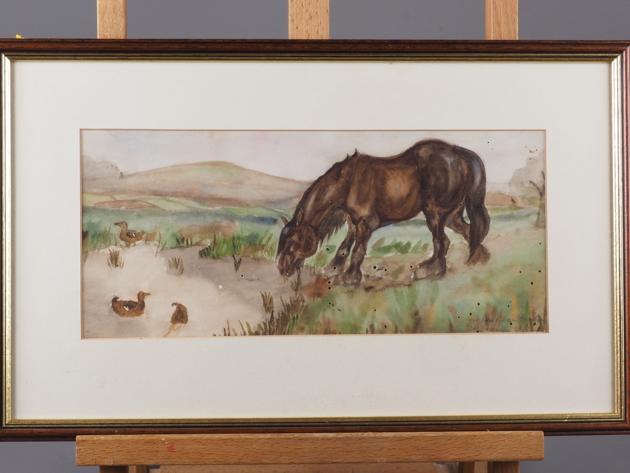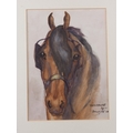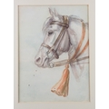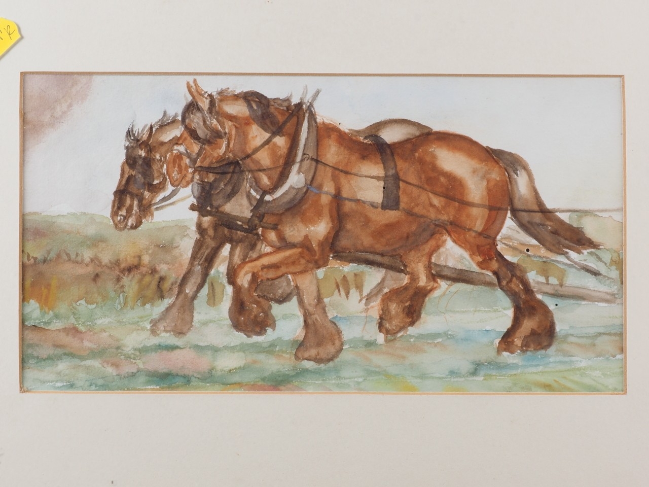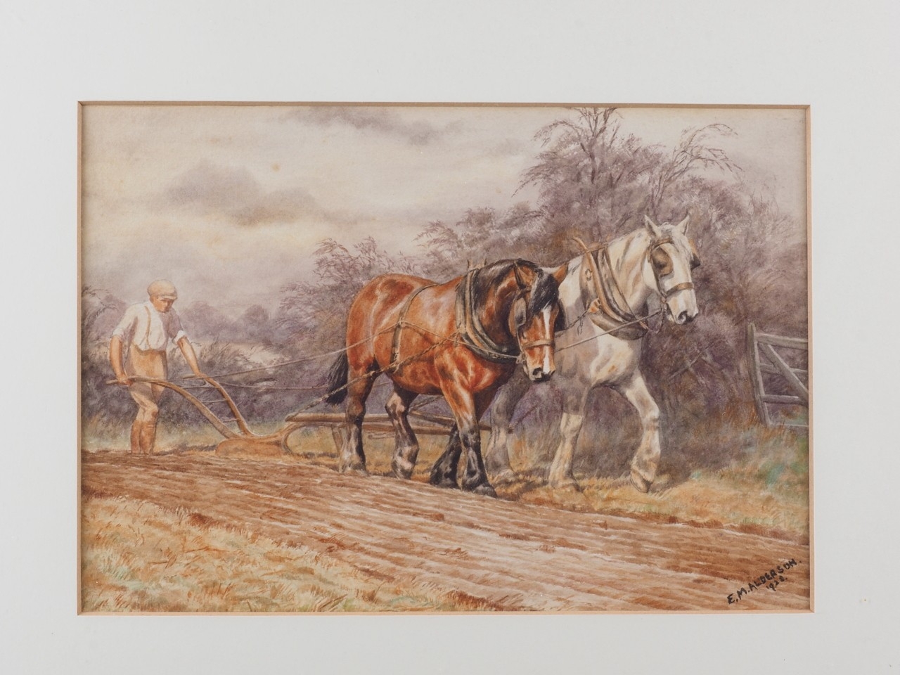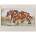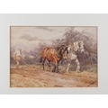 Elizabeth Mary Alderson: watercolours, two horses pulling a plough, with farmhand, 6" x 8 3/4", in green and gilt strip frame, and seven other watercolours of horses, various
