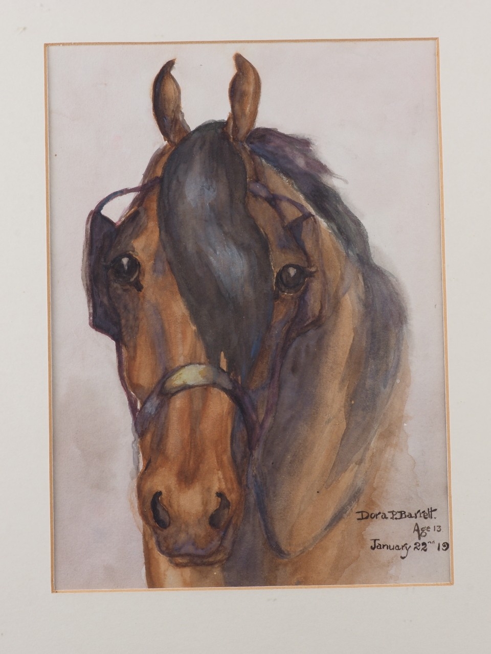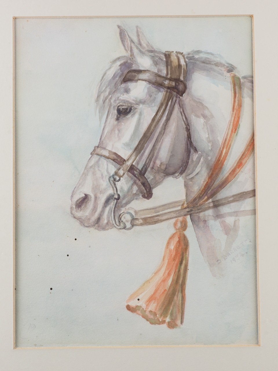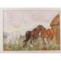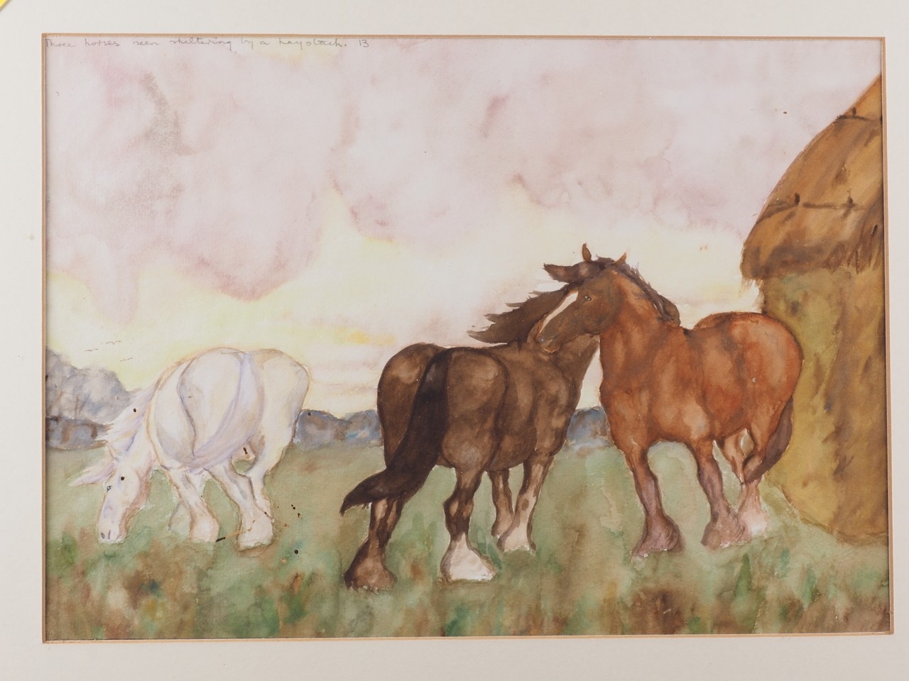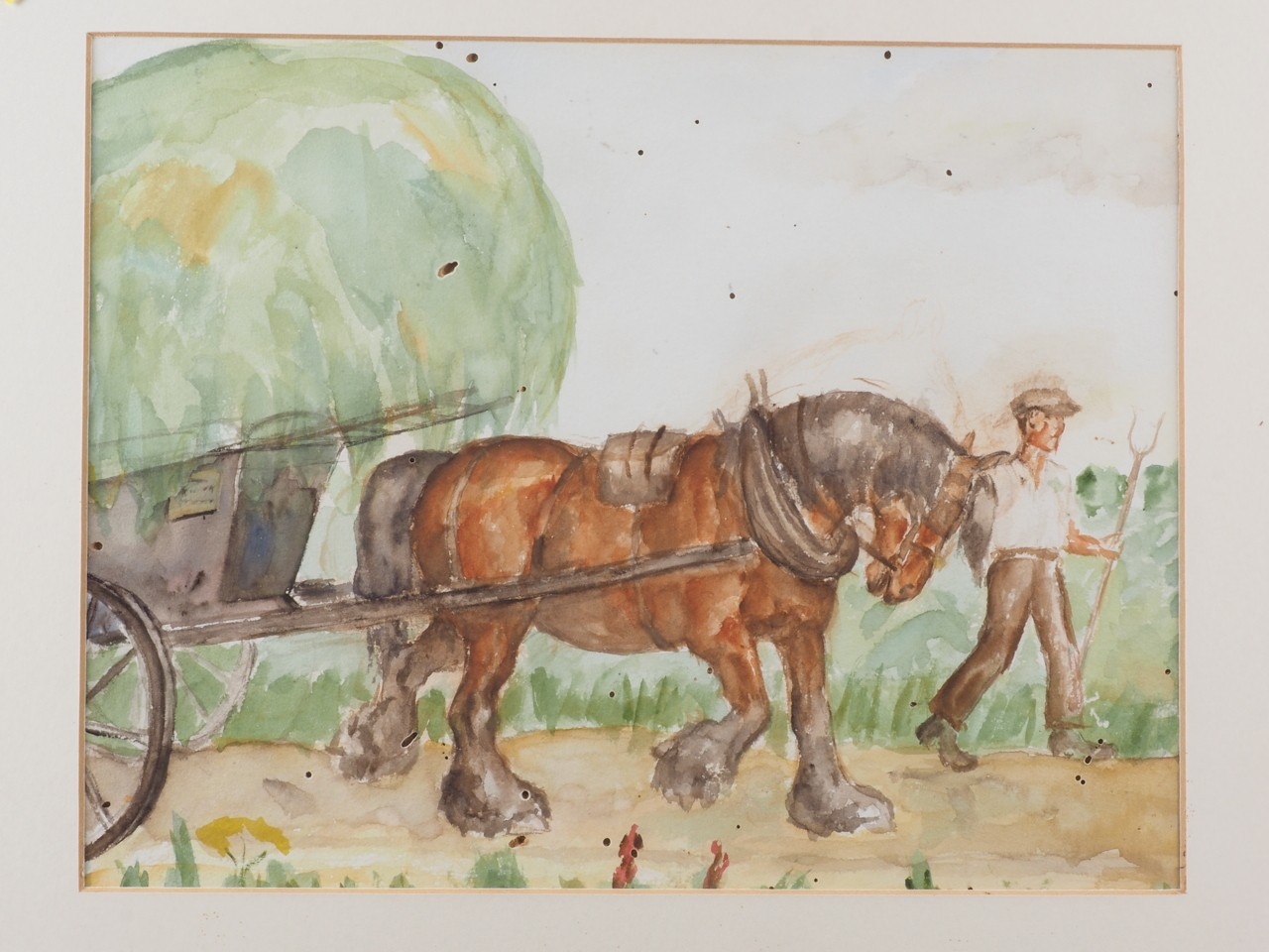 Elizabeth Mary Alderson: watercolours, two horses pulling a plough, with farmhand, 6" x 8 3/4", in green and gilt strip frame, and seven other watercolours of horses, various