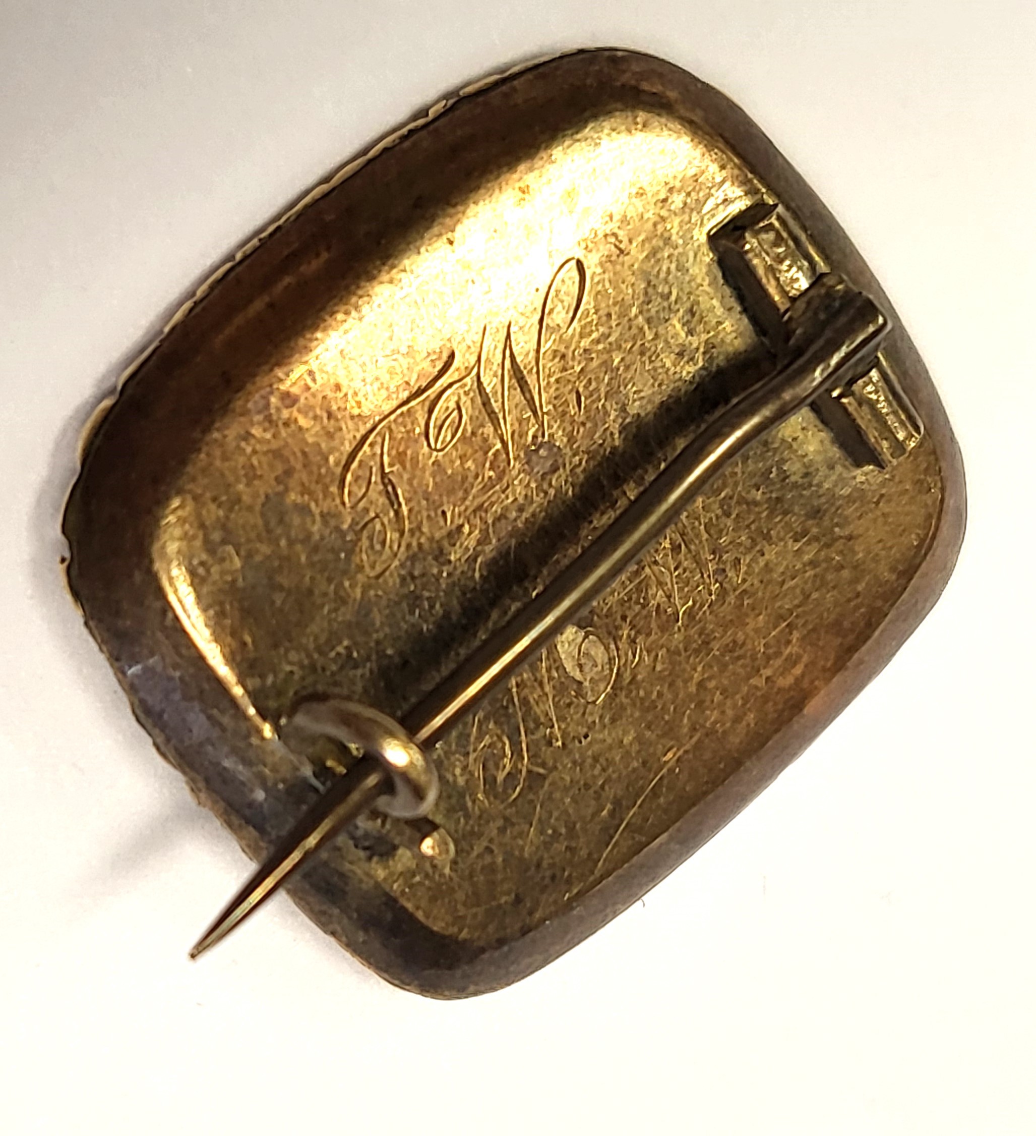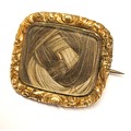 A 12ct rose gold Victorian Memento Mori brooch with a braided lock of hair in an ornate surround. Engraved on the back of the pin 'TW'. 3.6gms