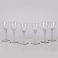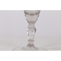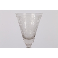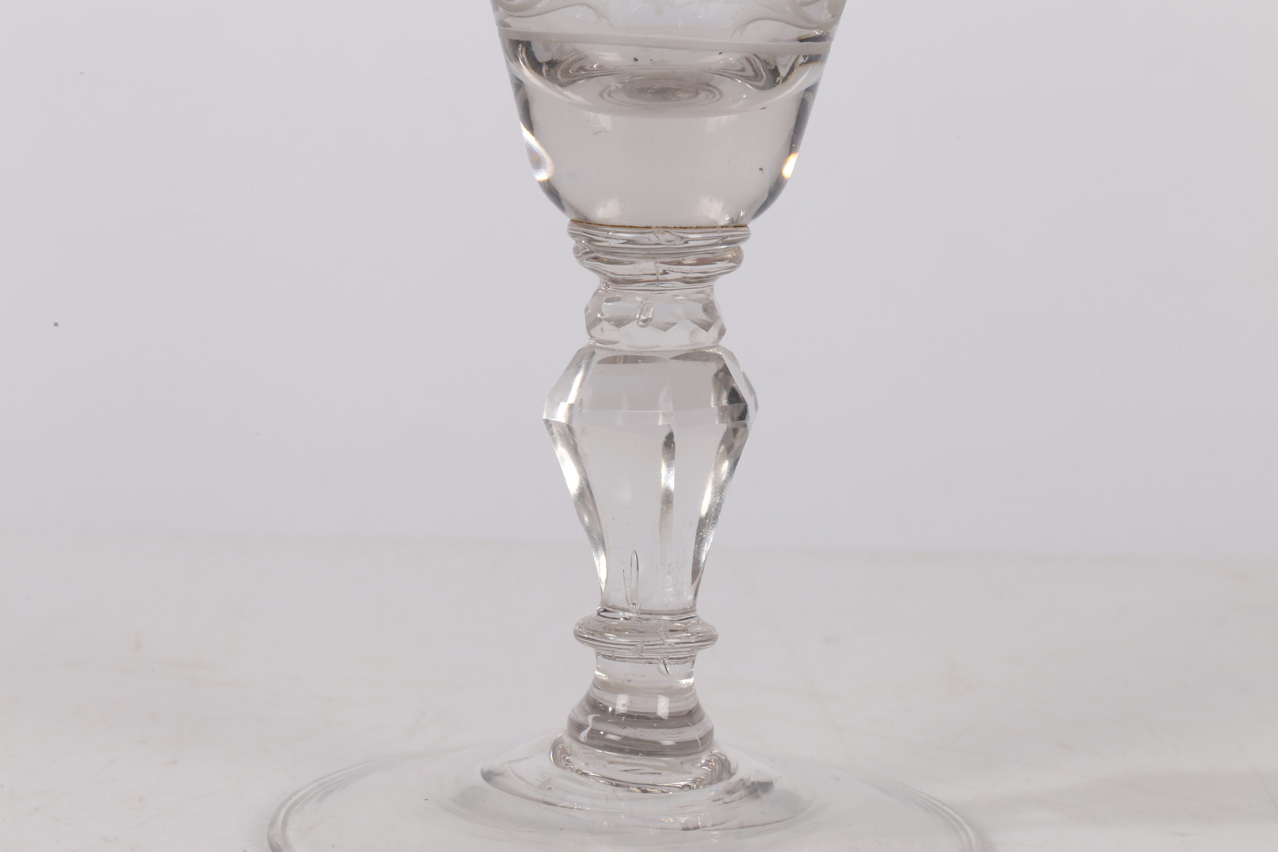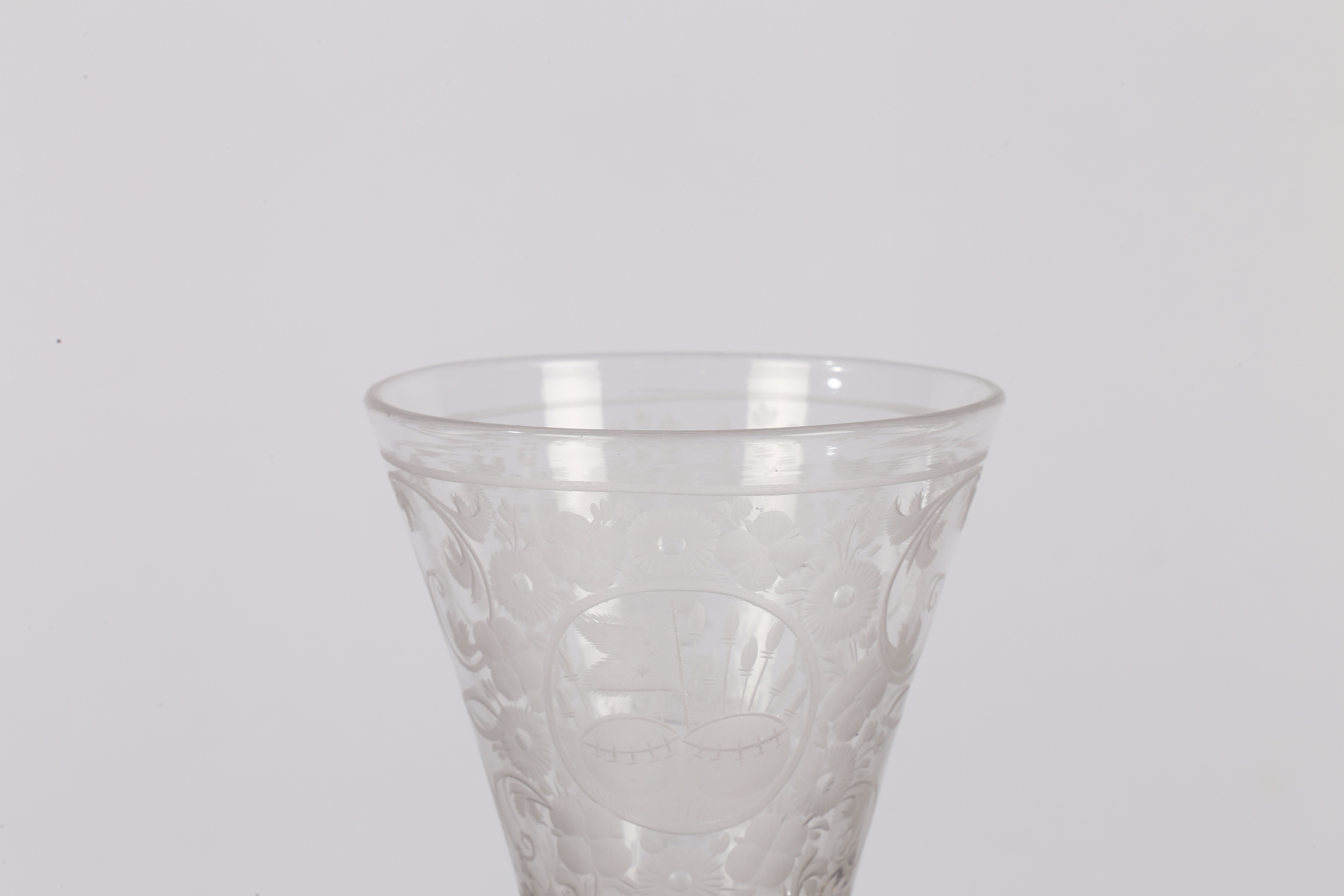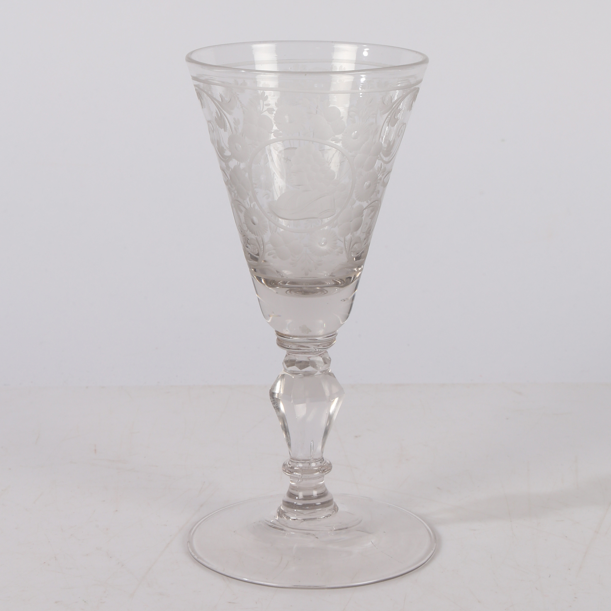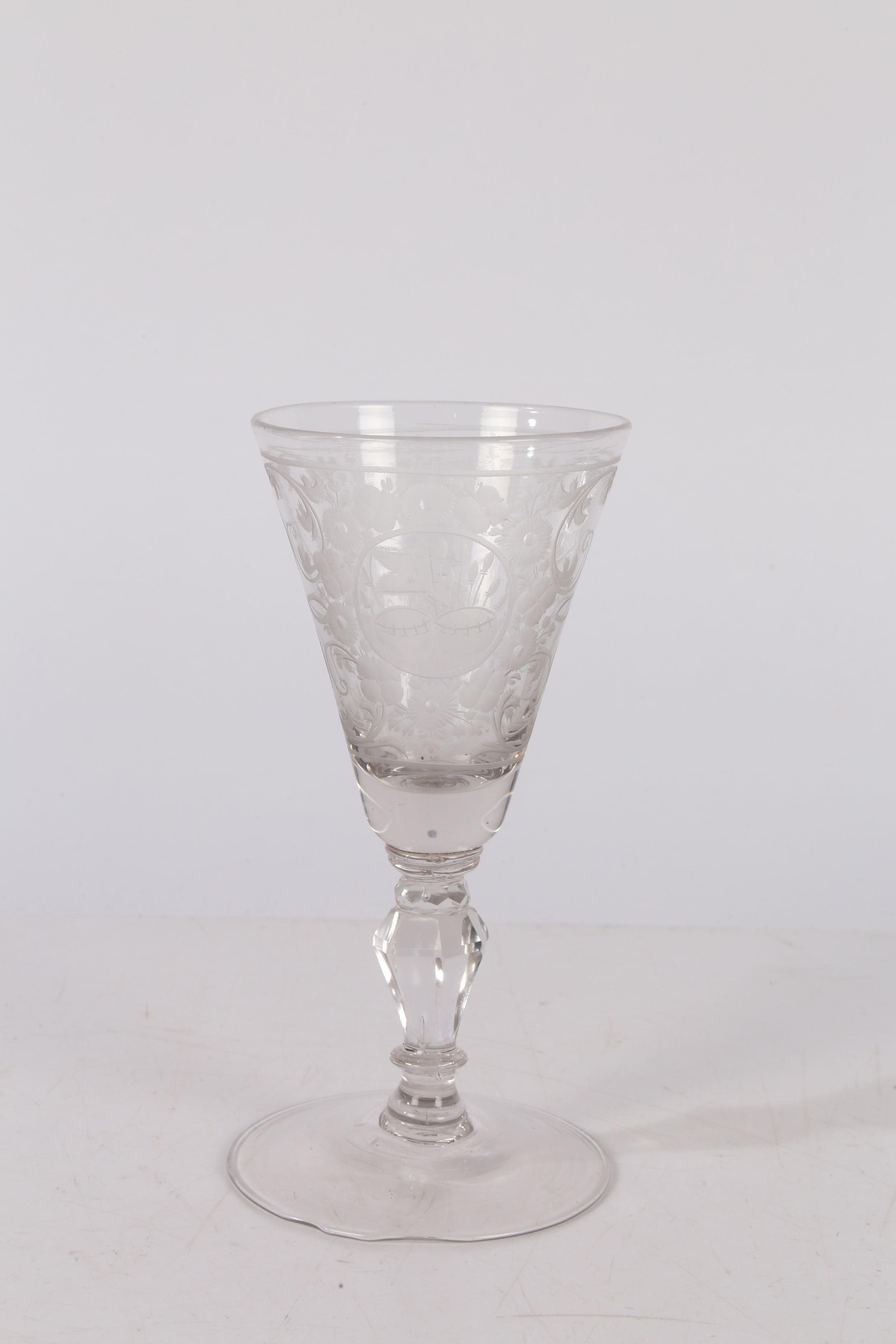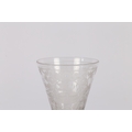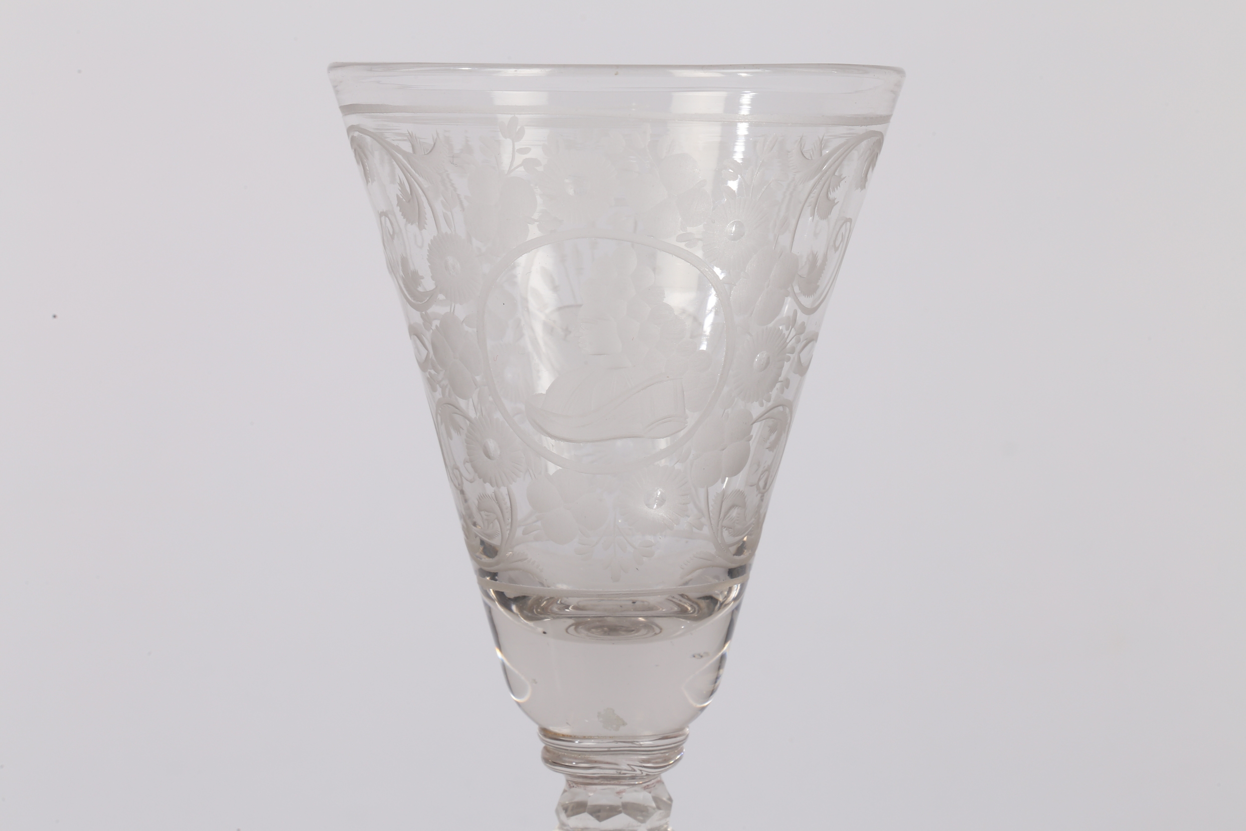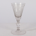AN 18TH CENTURY DUTCH SAXON ENGRAVED GOBLET. circa 1730, the bowl engraved with a floral deign and panel depicting a gentleman the other panel depicting military scenes, 18cm high.