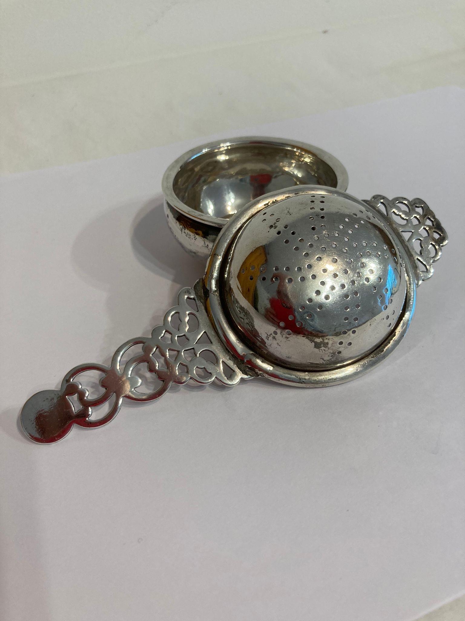 Antique SILVER TEA STRAINER With beautifully designed handle,Together with a Solid Silver Drip Bowl. Both pieces fully hallmarked. 52 grams.
