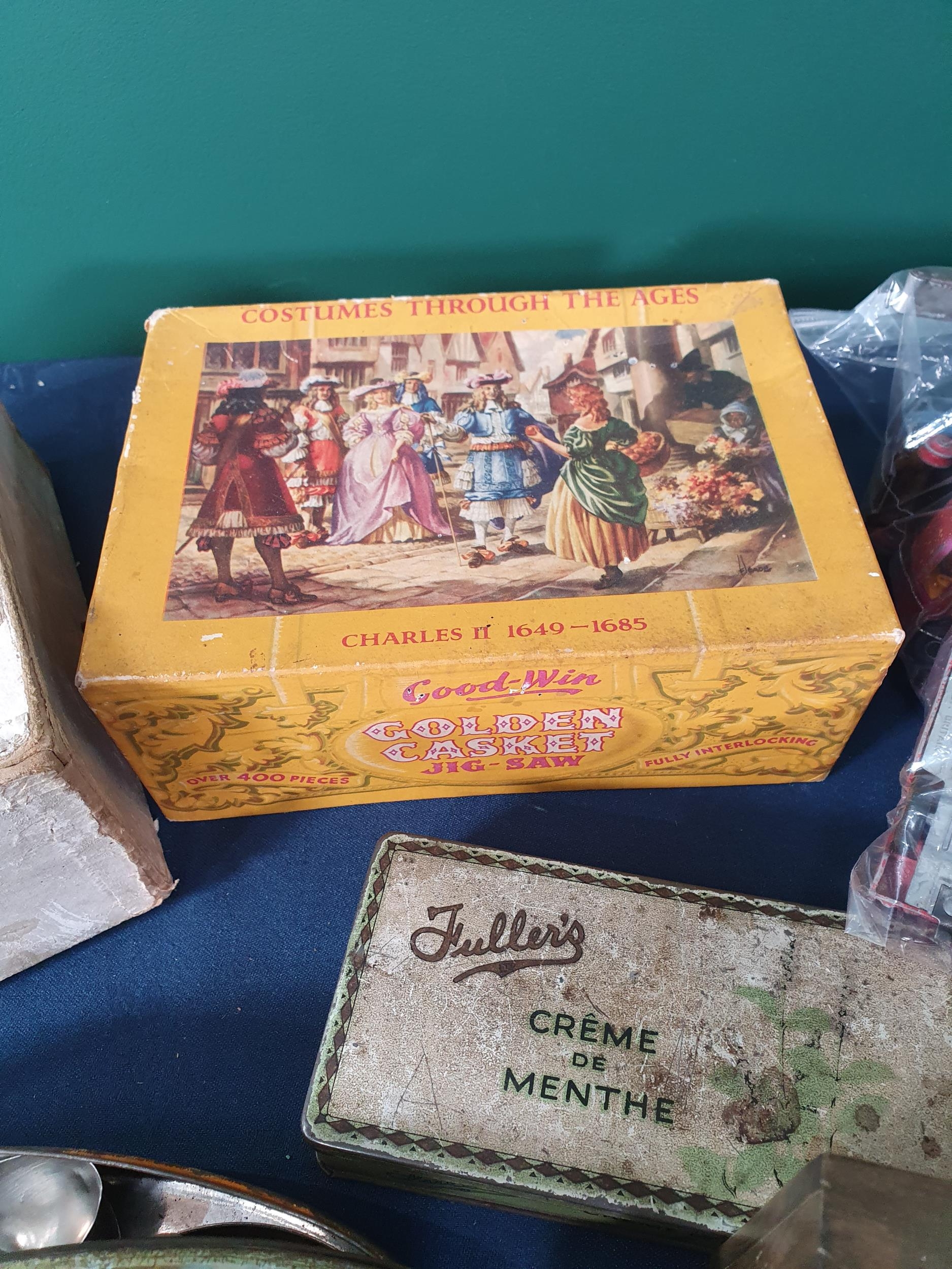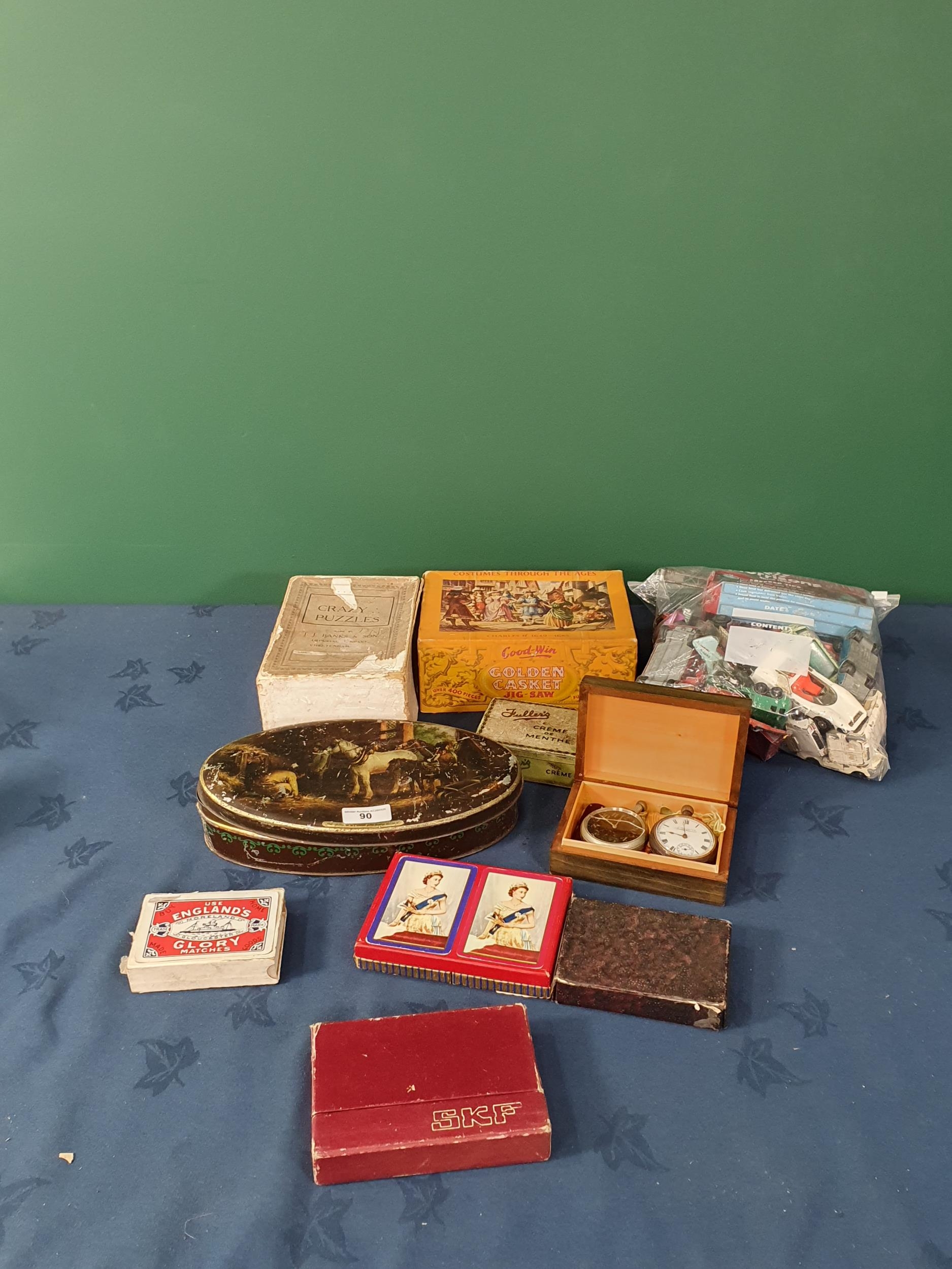 A selection of Tins, two wooden Jigsaws, two Pocket Watches, a quantity of play worn Models, Playing Cards etc (R4)