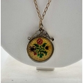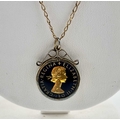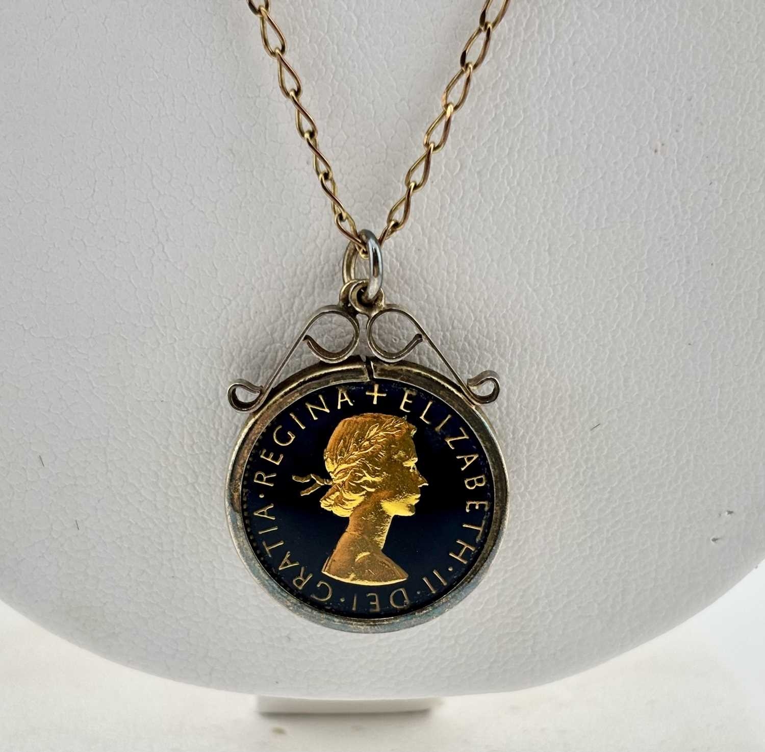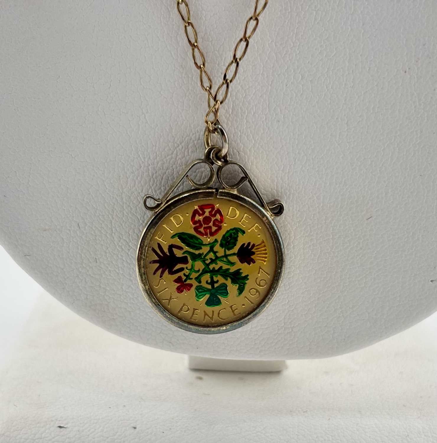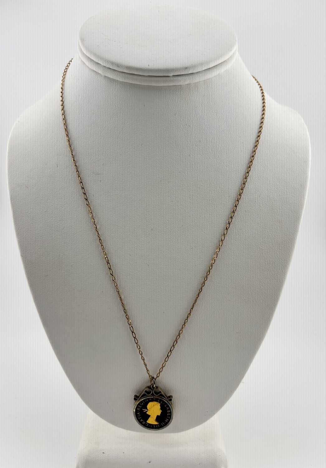 An enamel coin pendant and 9ct gold chain, chain with import marks for Sheffield 1984, length of pendant 2.9cm, length of chain 50cm, 6.5g.